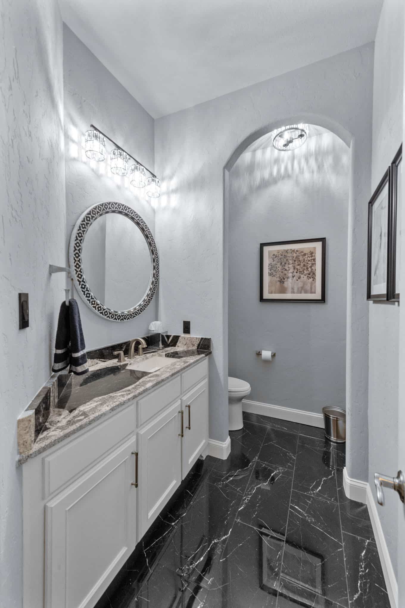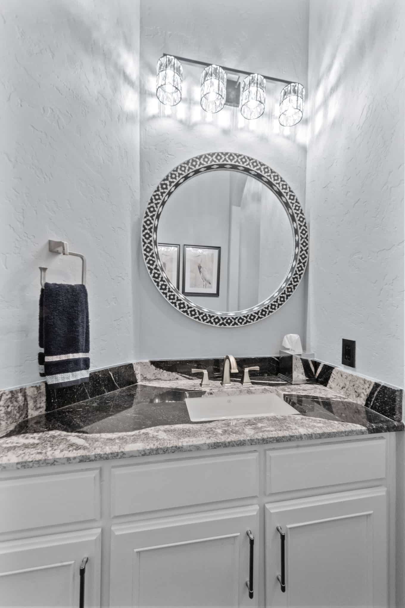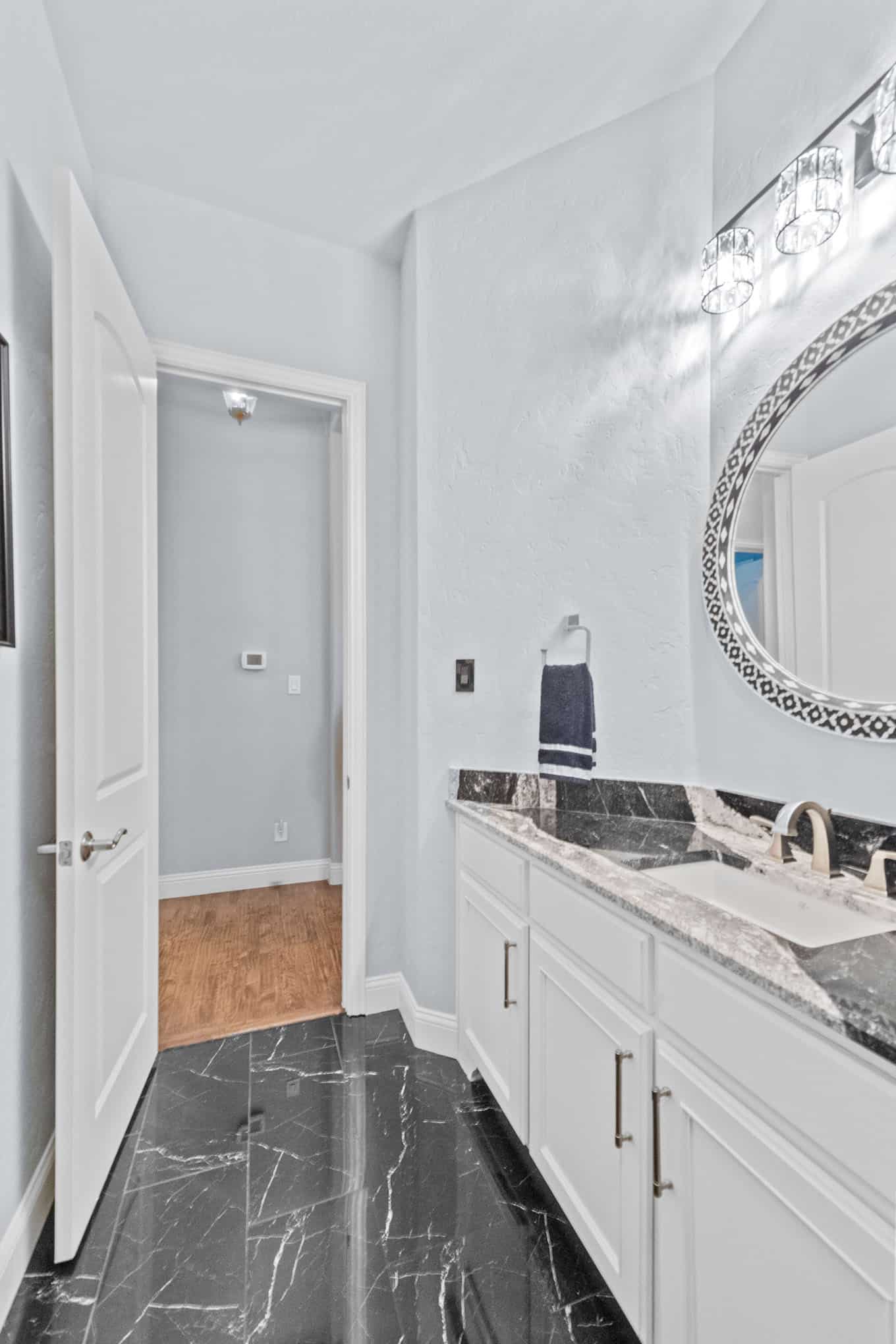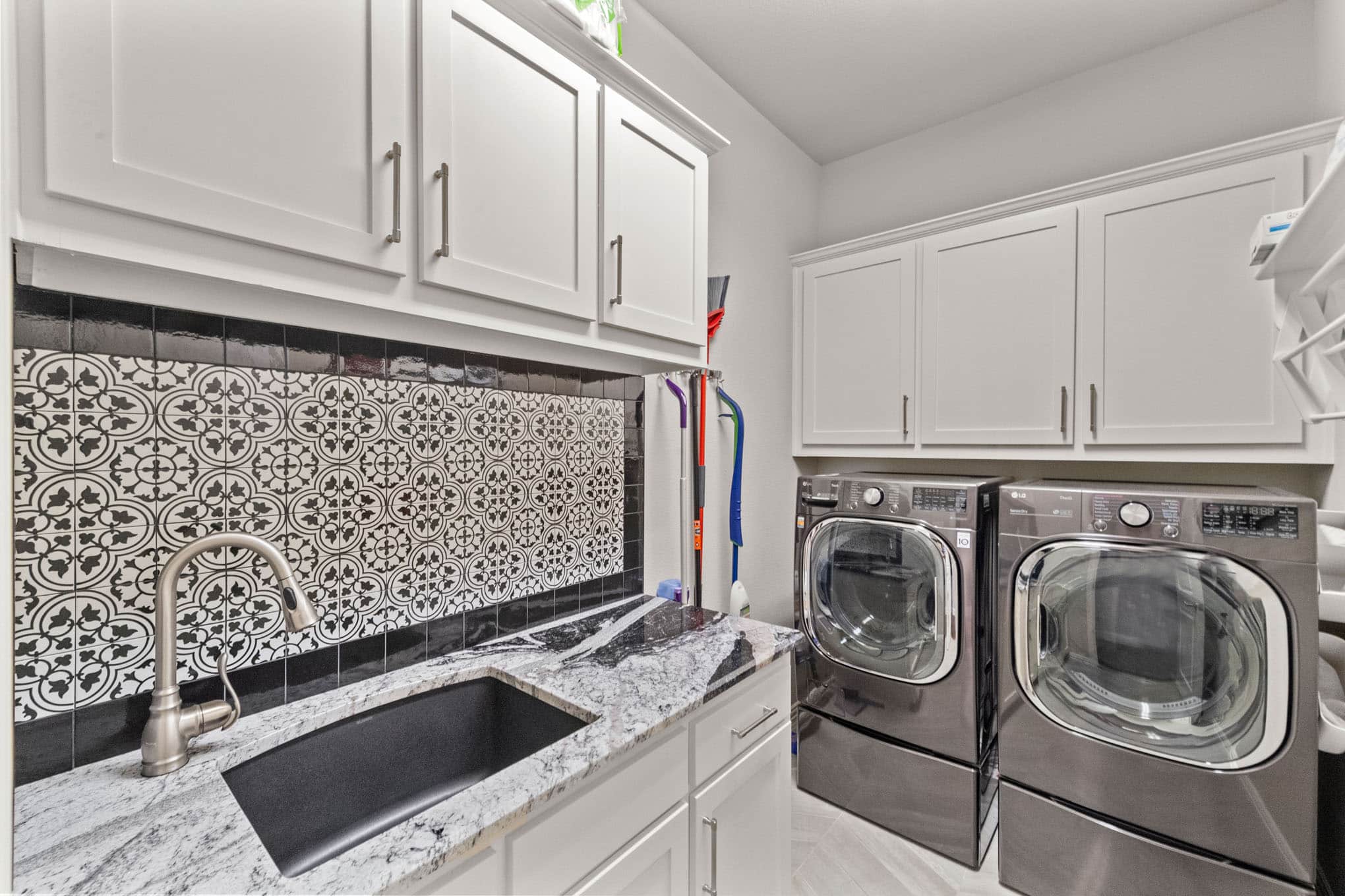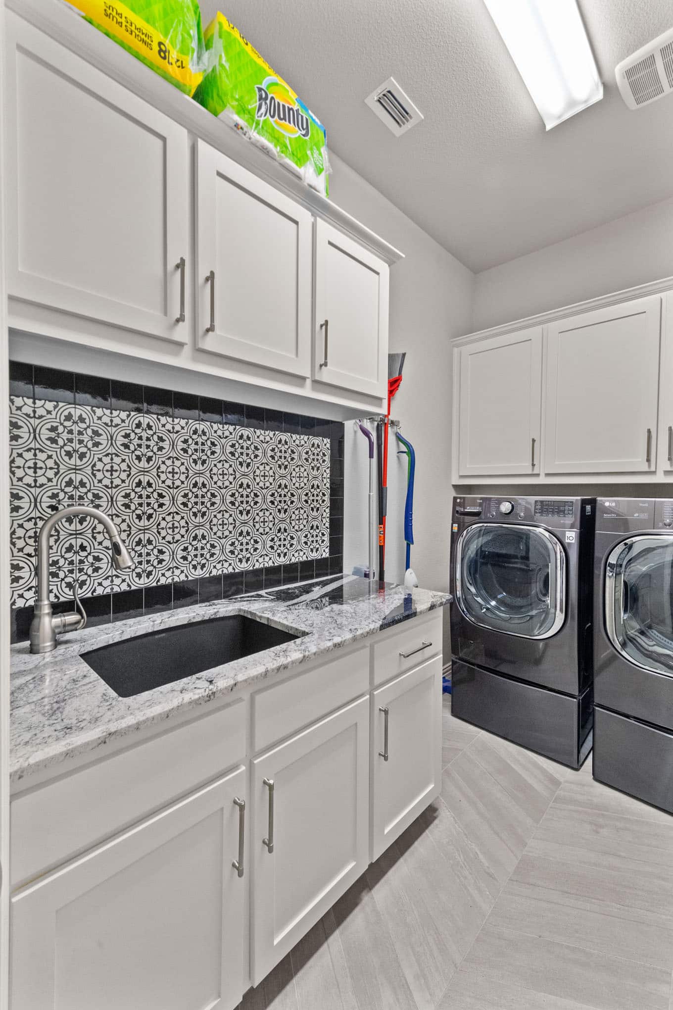This striking kitchen renovation in Frisco makes a bold statement with its dramatic black and white color palette. Crisp white cabinetry with clean lines creates a bright, airy foundation, while the spectacular black granite countertops and backsplash with dramatic veining serve as the showstopping focal point. The custom black range hood with polished chrome accents bridges these contrasting elements beautifully.