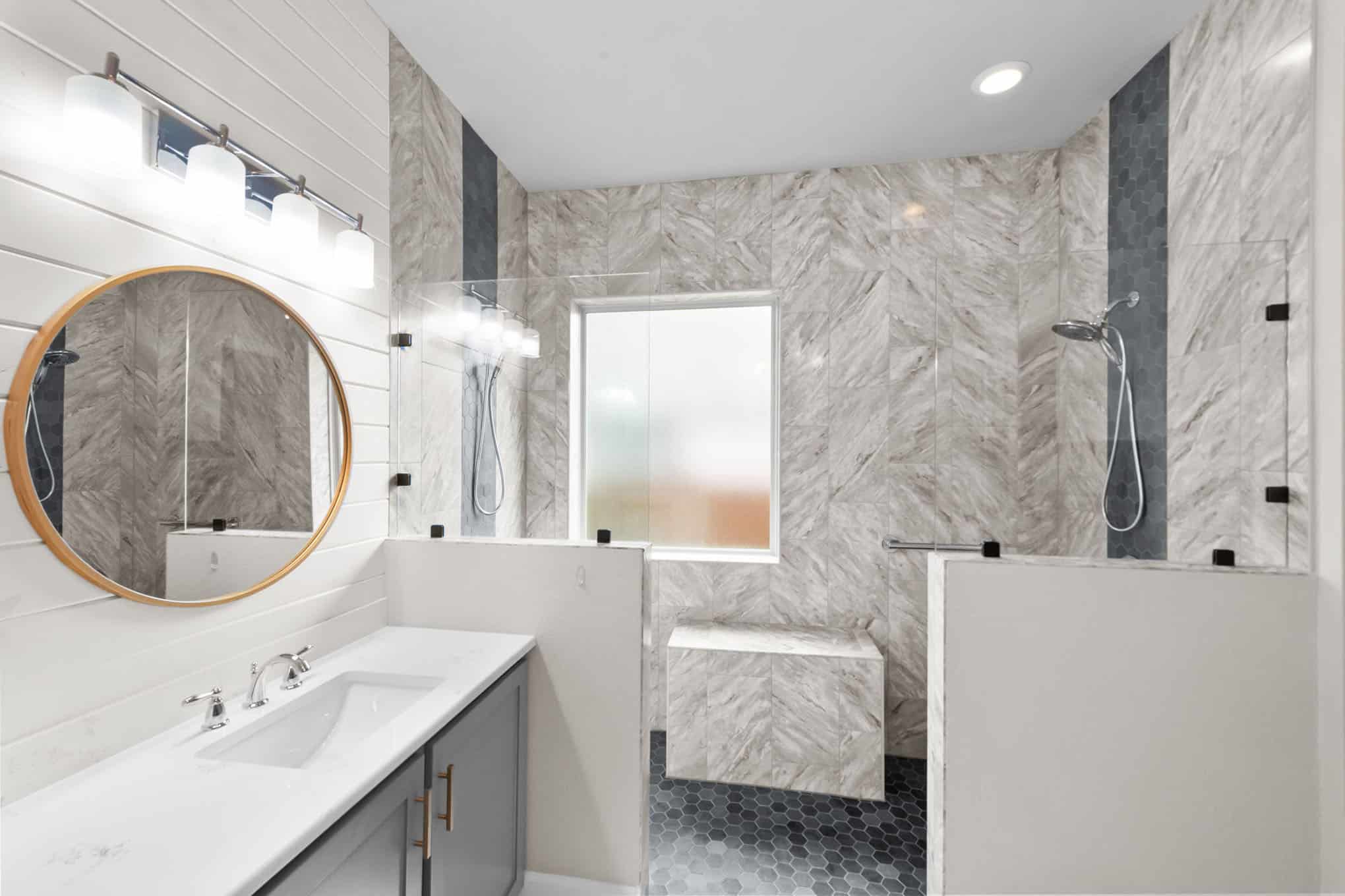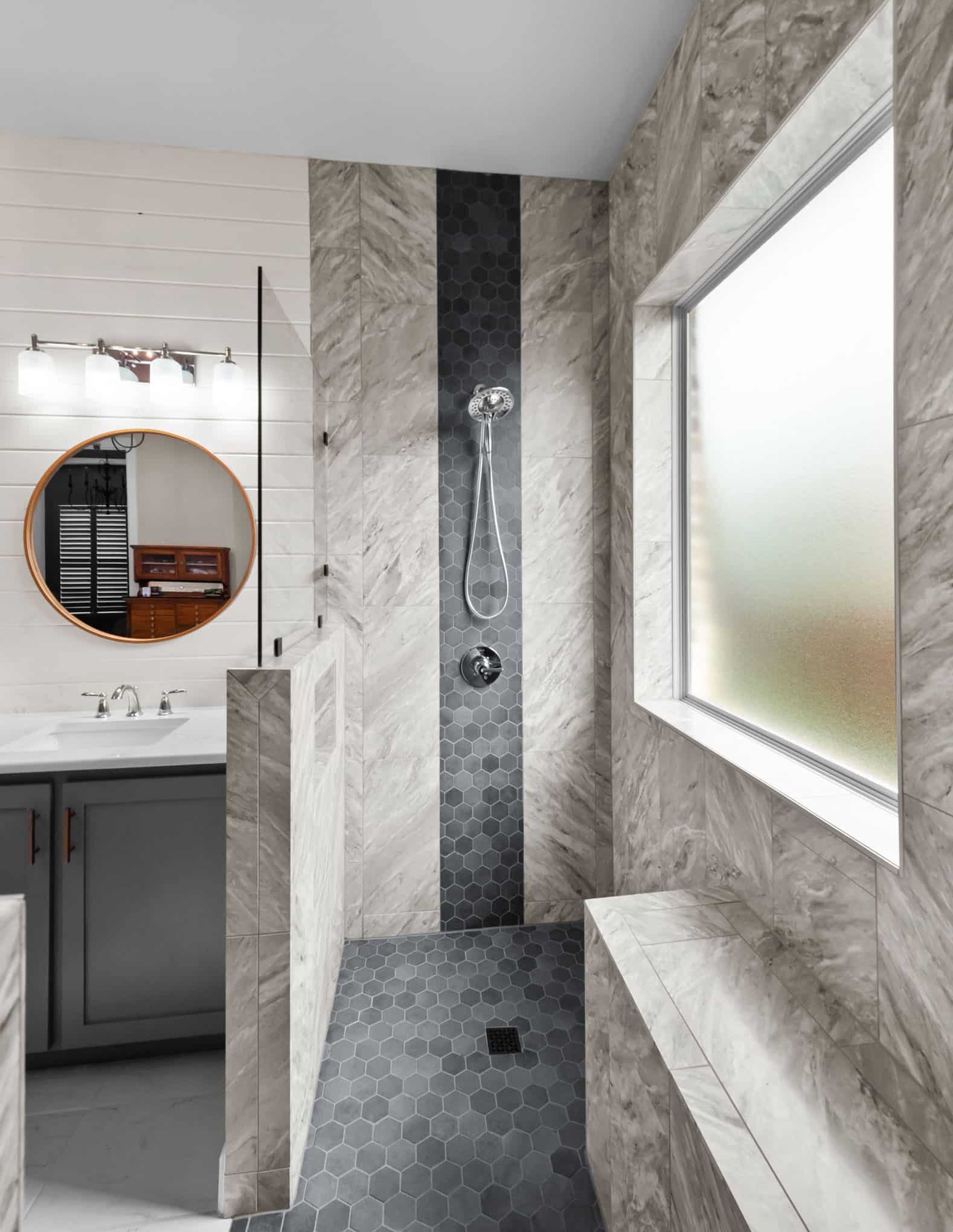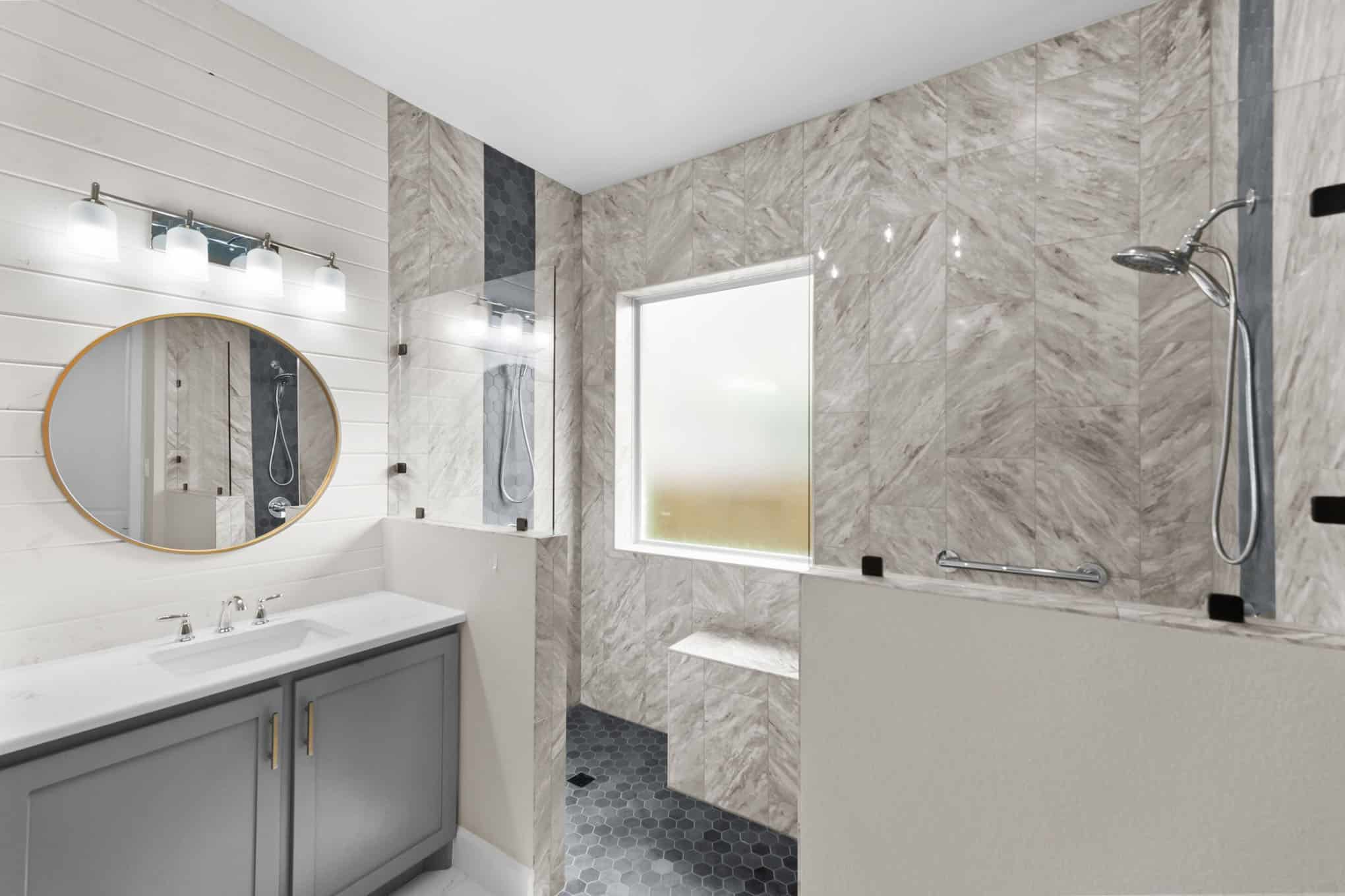 A floating bench seat provides convenience without sacrificing style, while the frameless glass enclosure maintains an open, airy feel. The custom gray vanity with quartz countertop complements the marble beautifully, and the round wooden-framed mirror and shiplap accent wall add warmth to balance the cool tones. This 2024 transformation delivers a spa-like sanctuary that feels both elegant and inviting.