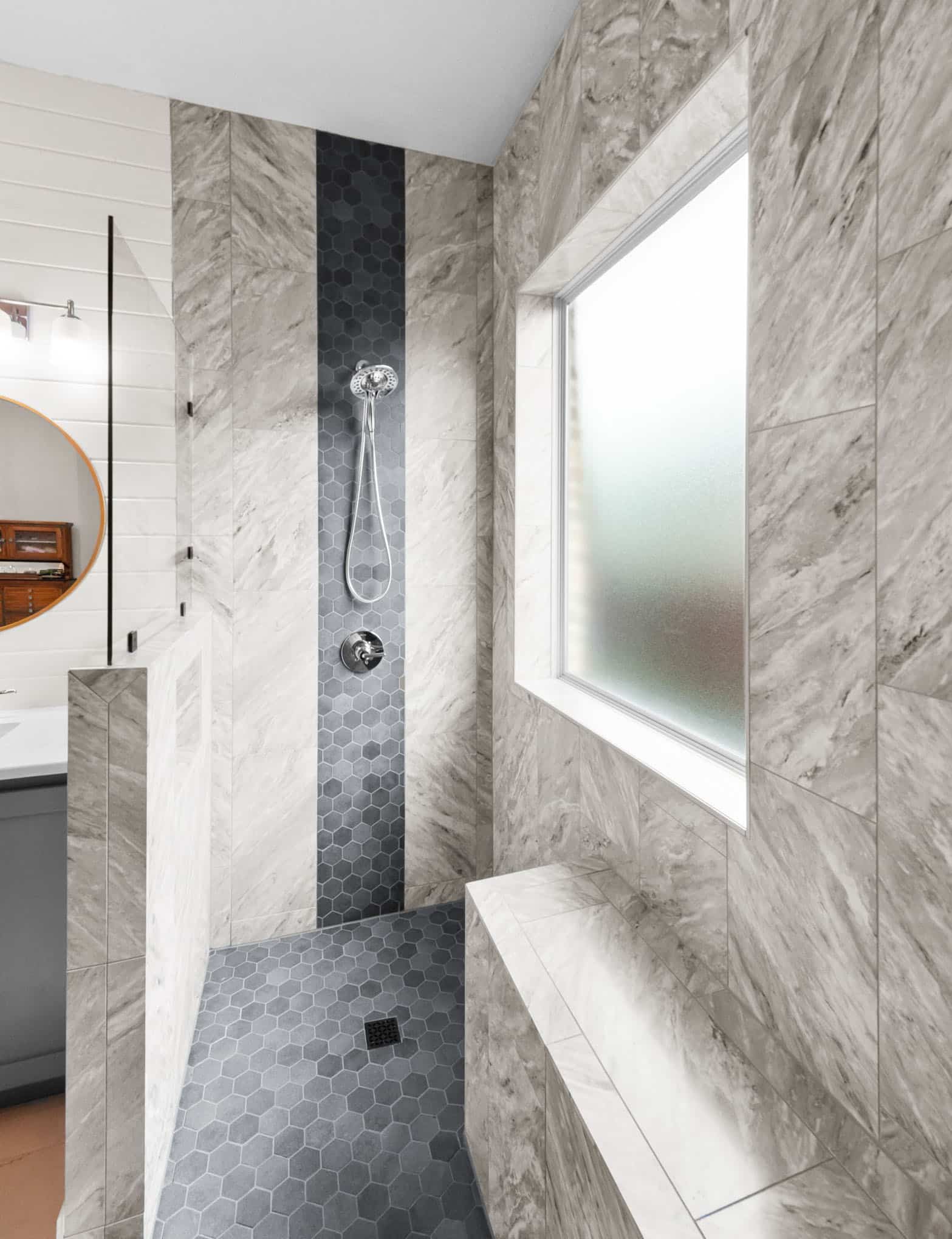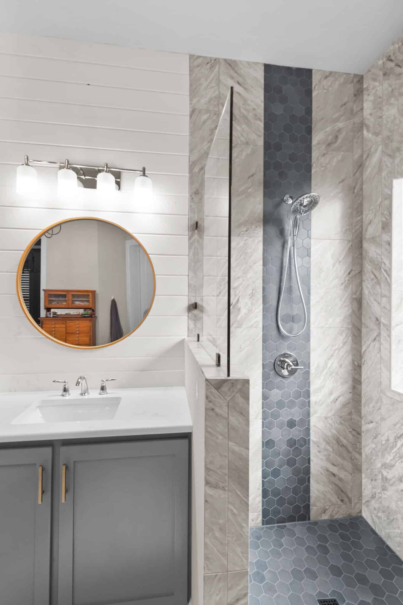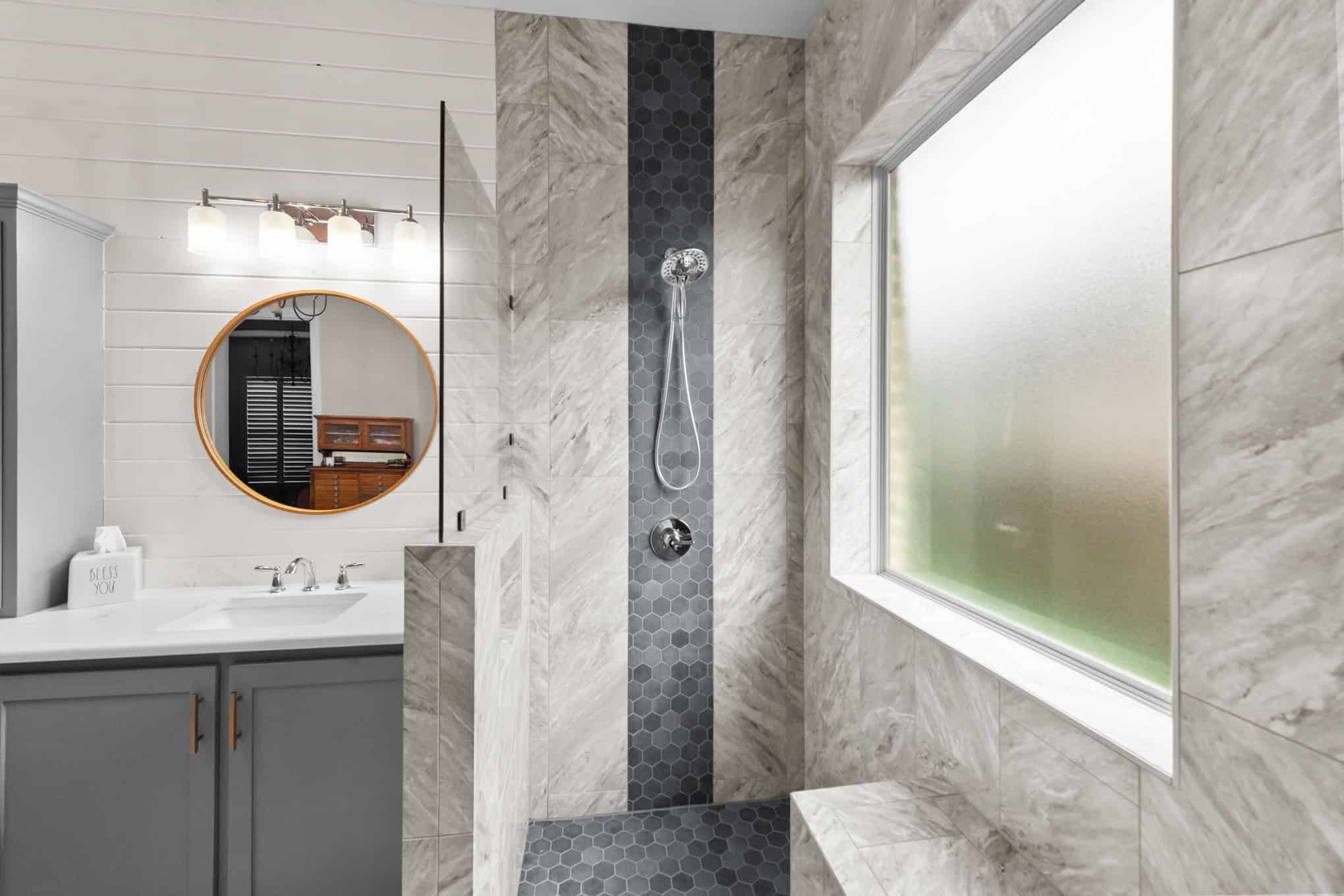 A floating bench seat provides convenience without sacrificing style, while the frameless glass enclosure maintains an open, airy feel. The custom gray vanity with quartz countertop complements the marble beautifully, and the round wooden-framed mirror and shiplap accent wall add warmth to balance the cool tones. This 2024 transformation delivers a spa-like sanctuary that feels both elegant and inviting.