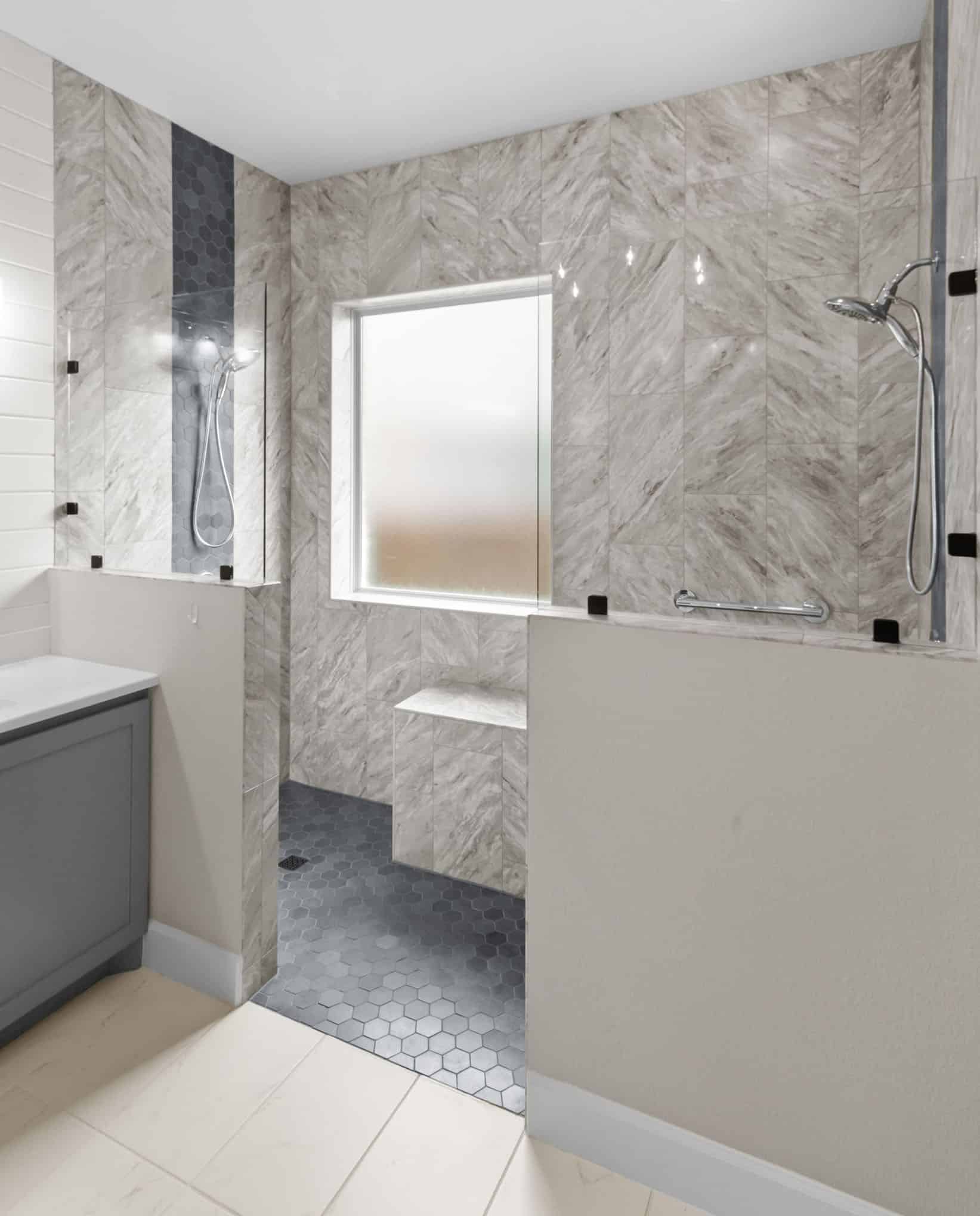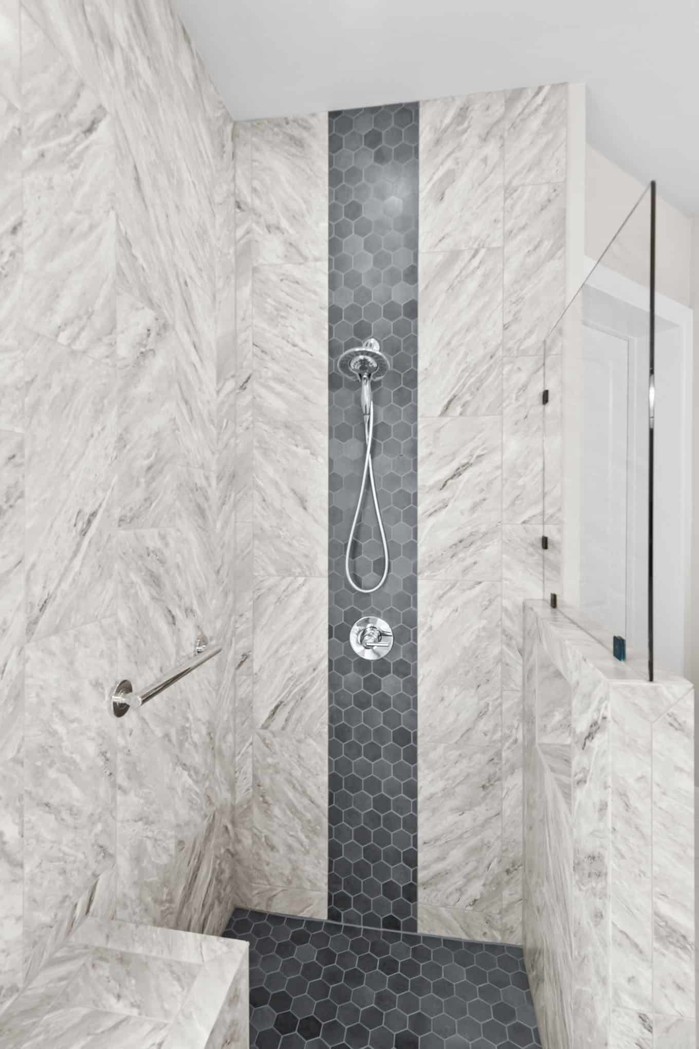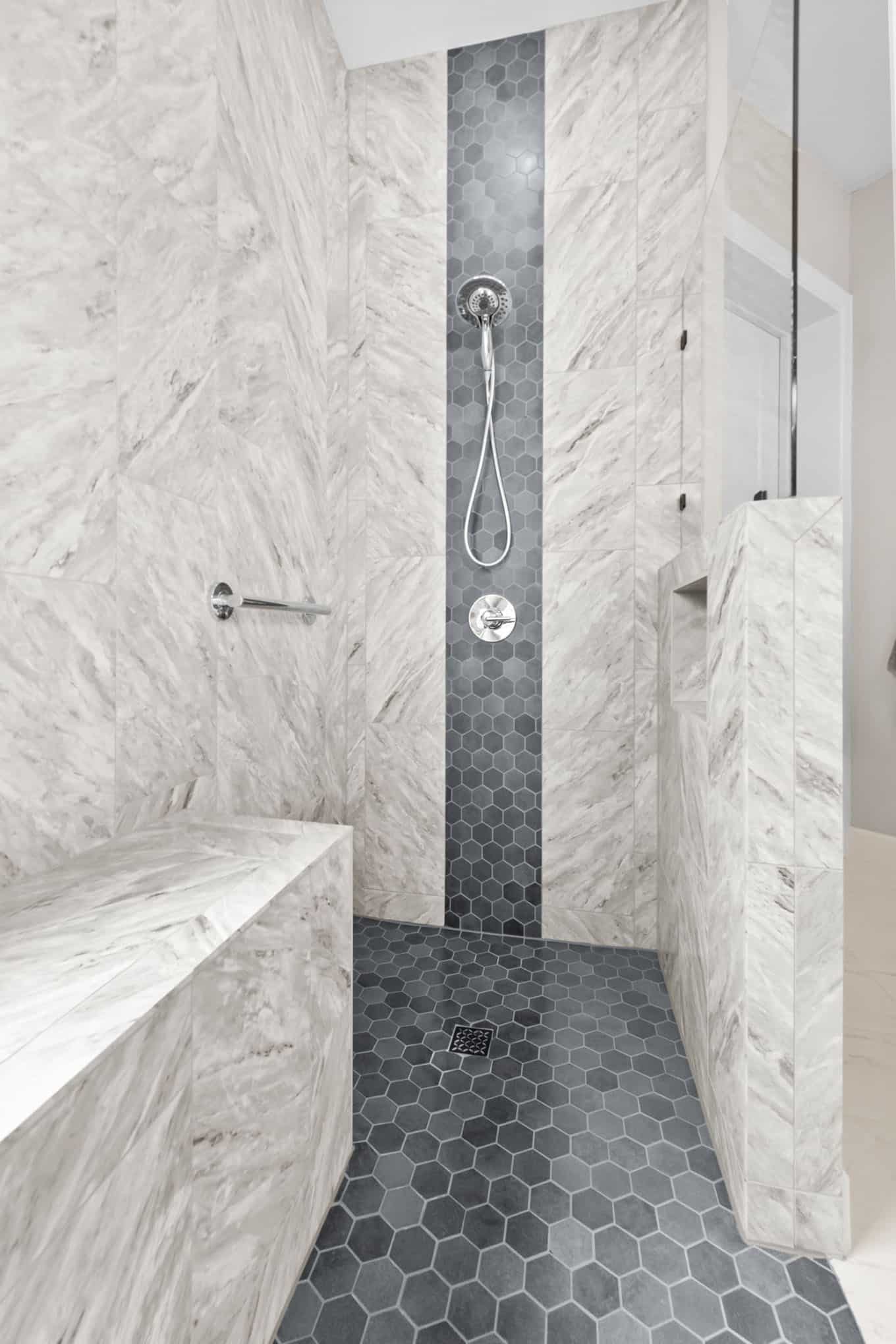 This stunning master bathroom renovation in Celina showcases the perfect marriage of contemporary design and timeless materials. Luxurious marble-look tile in a dramatic chevron pattern creates a sophisticated backdrop, while the striking dark gray hexagonal accent tiles add architectural interest to the walk-in shower. The dual-headed shower system with sleek chrome fixtures offers both practicality and indulgence.