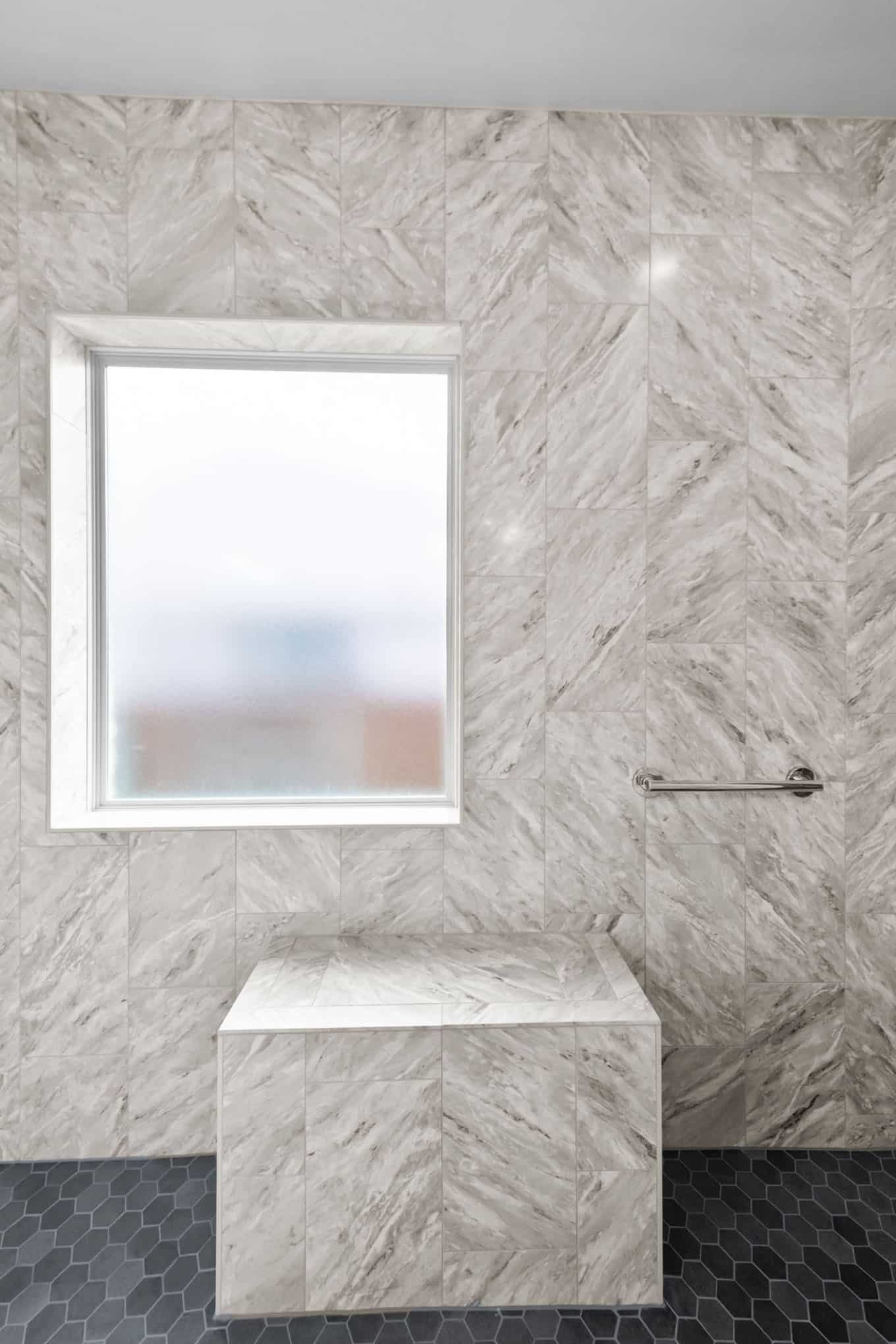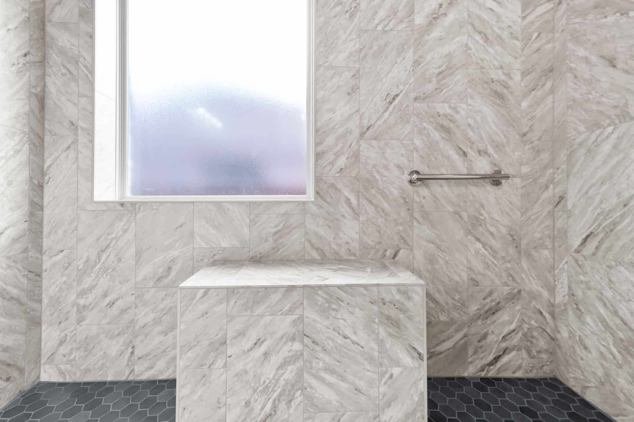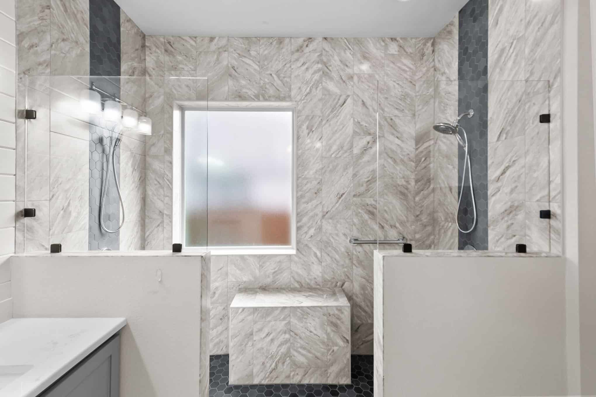 This stunning master bathroom renovation in Celina showcases the perfect marriage of contemporary design and timeless materials. Luxurious marble-look tile in a dramatic chevron pattern creates a sophisticated backdrop, while the striking dark gray hexagonal accent tiles add architectural interest to the walk-in shower. The dual-headed shower system with sleek chrome fixtures offers both practicality and indulgence.