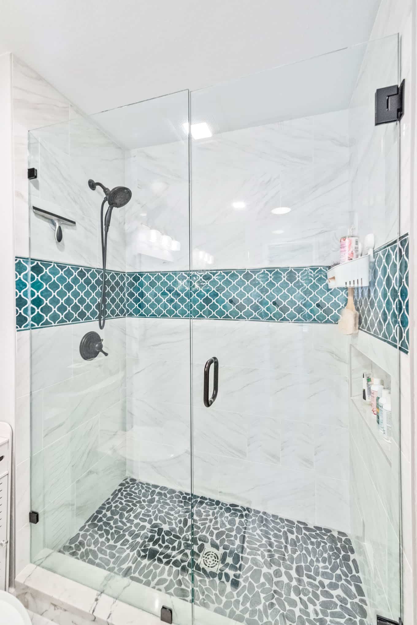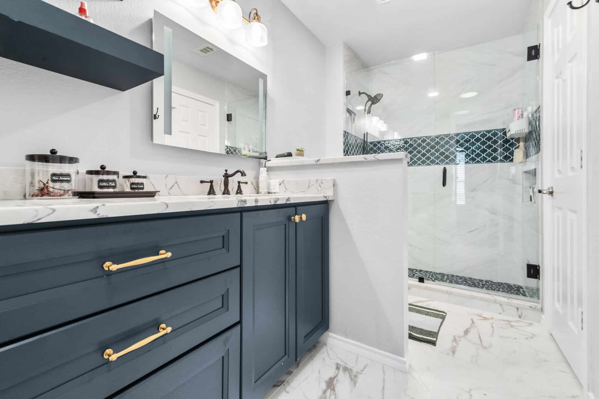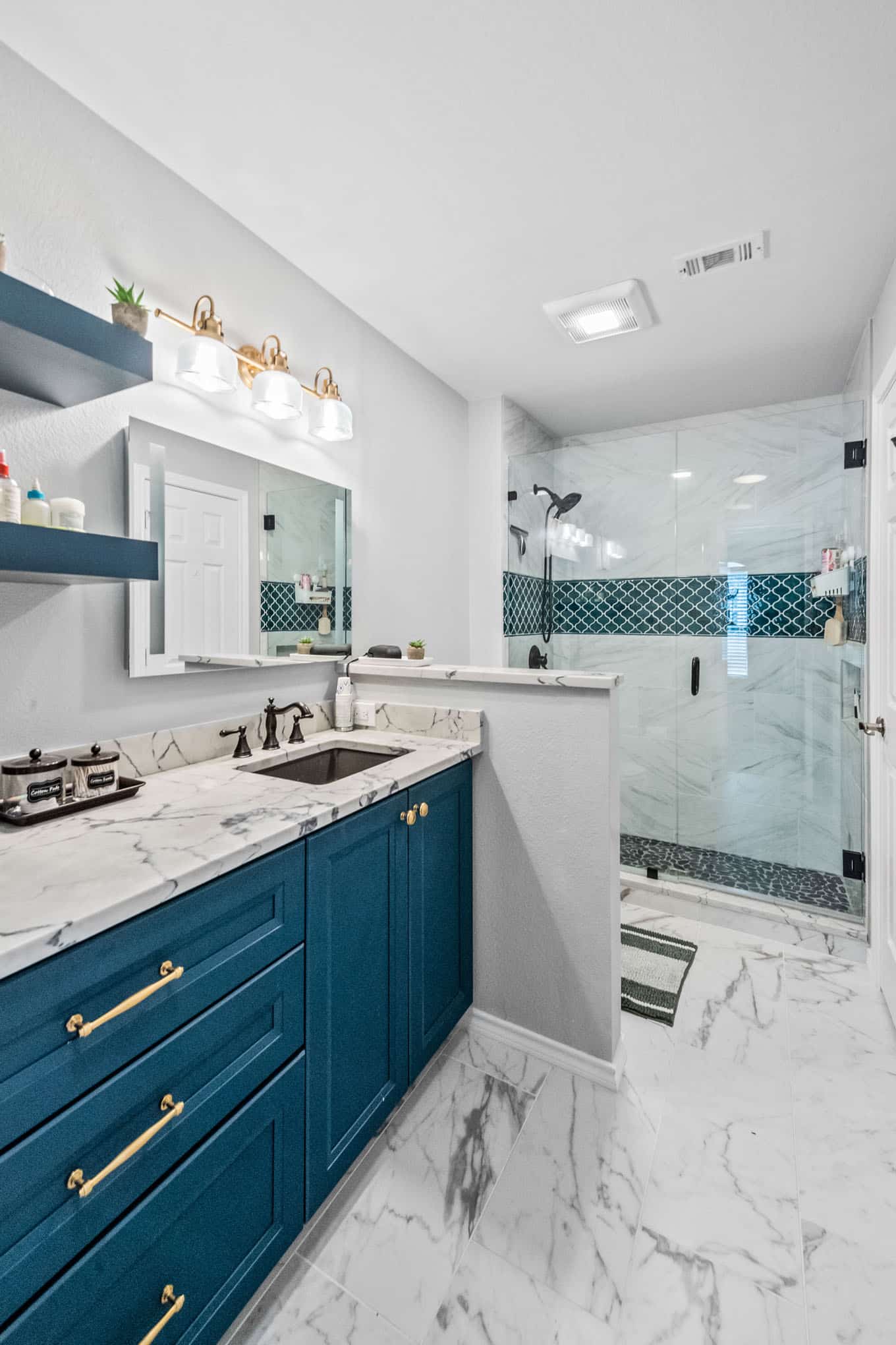 Completed in 2023, this stylish Frisco guest bathroom renovation perfectly balances modern aesthetics with practical functionality. The design features deep navy blue cabinetry with elegant gold hardware that creates a striking contrast against the luxurious white marble-look countertops and flooring. A frameless glass shower enclosure showcases beautiful white marble-inspired tile with a distinctive teal arabesque accent band that adds visual interest and ties into the vanity color.