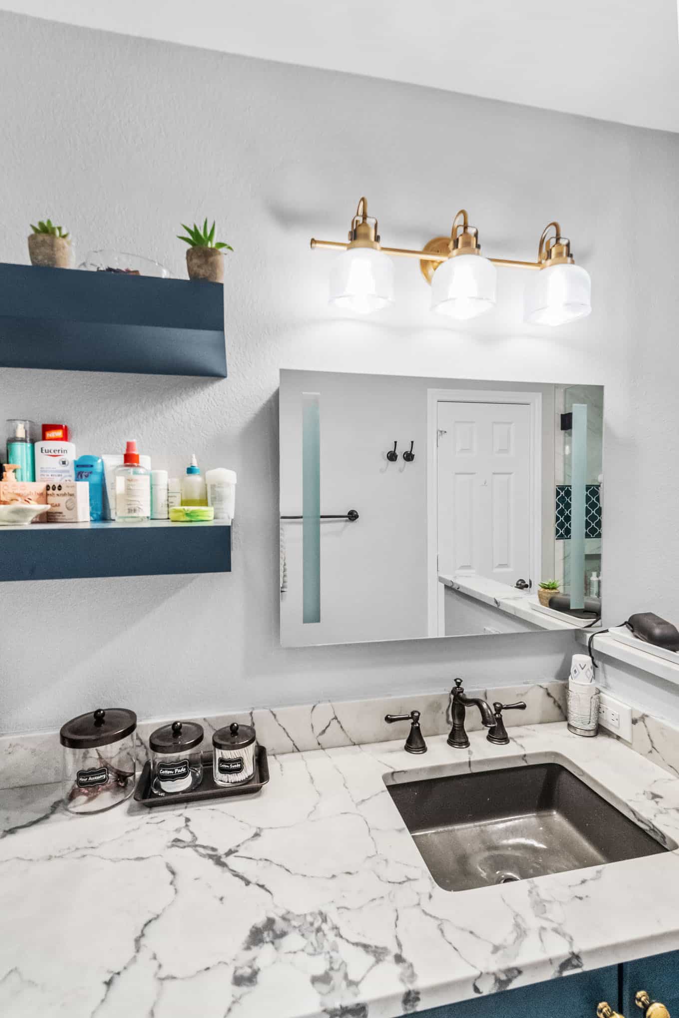Custom floating shelves in matching navy provide convenient storage while maintaining the bathroom’s clean, uncluttered appearance. Brushed brass fixtures, including the statement three-light vanity fixture, add warmth and sophistication to the space. This renovation demonstrates our ability to transform a standard guest bathroom into a stunning retreat that combines high-end finishes with thoughtful design details for both beauty and functionality.