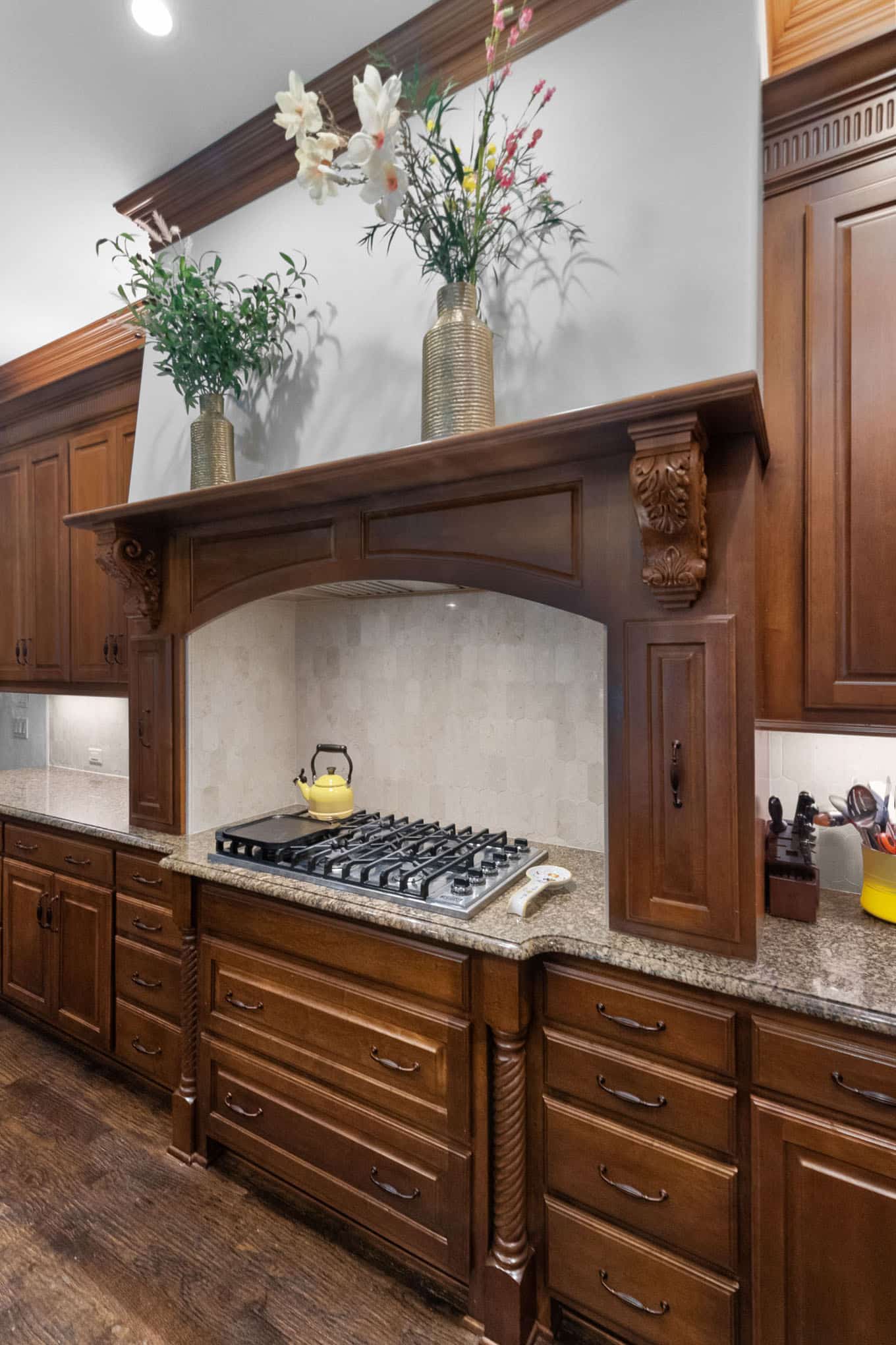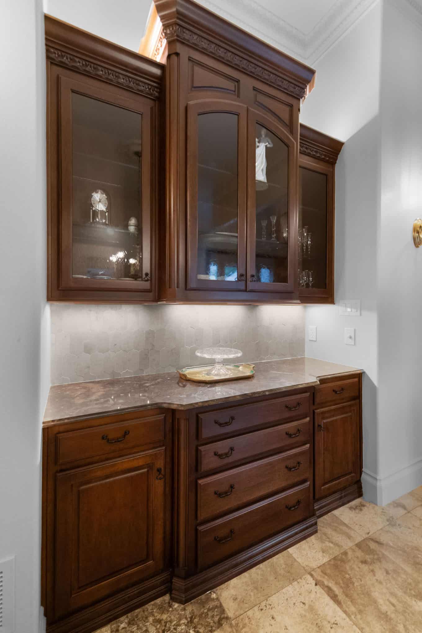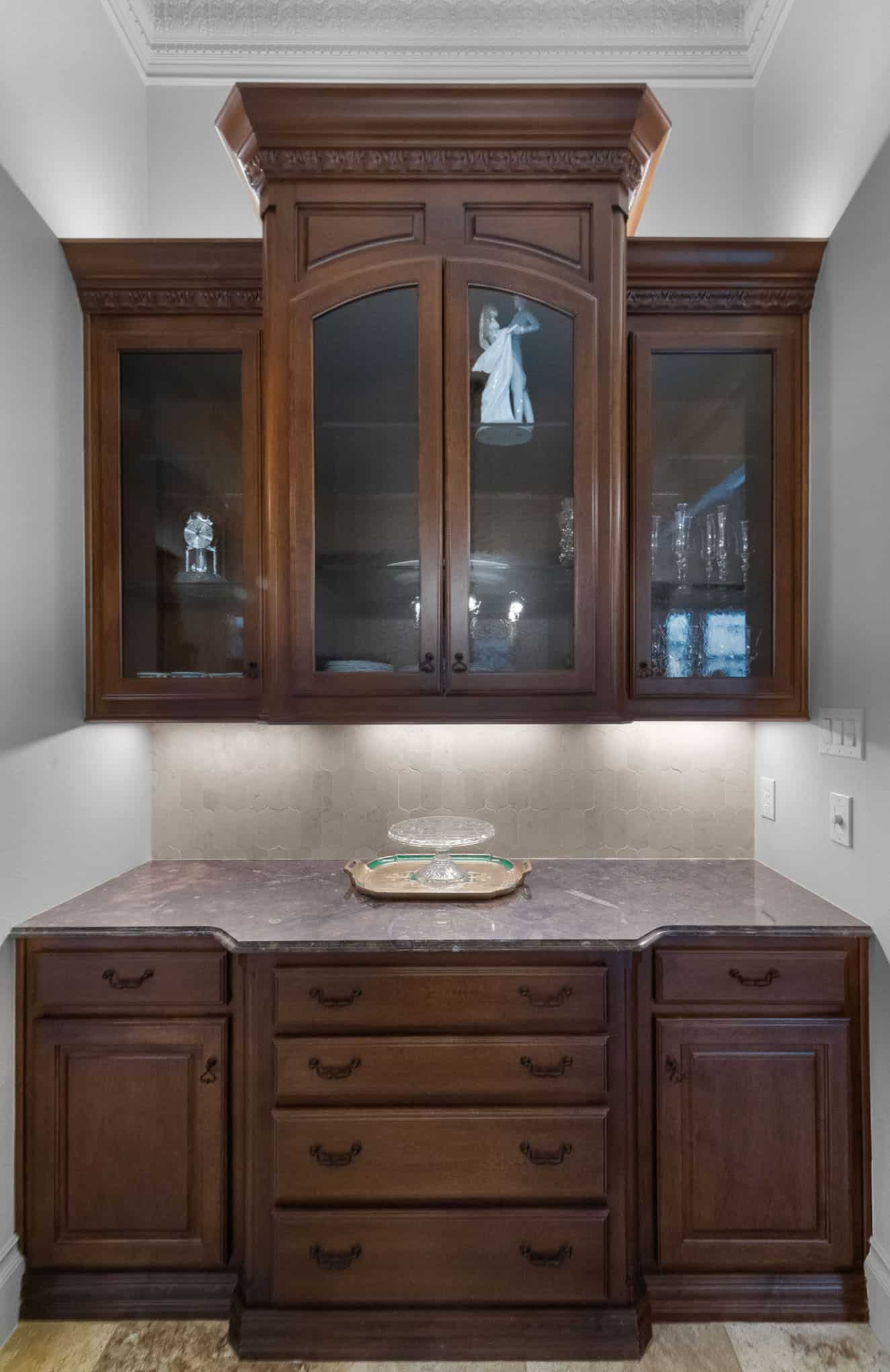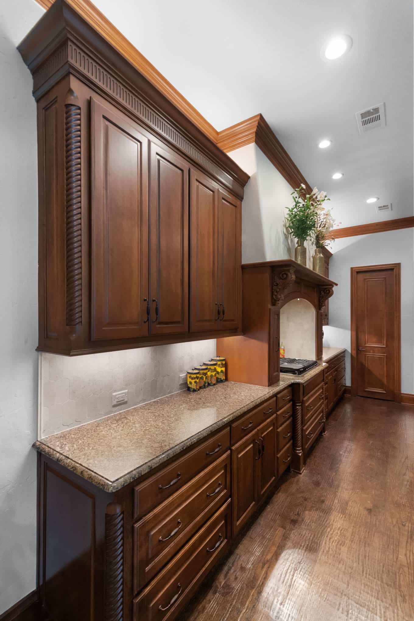 This refined Frisco renovation showcases our commitment to timeless craftsmanship and attention to detail. The gourmet kitchen features rich cherry cabinetry with intricate crown molding and decorative corbels, complemented by stunning granite countertops and a custom range hood with ornate woodwork. We designed multiple wet bar areas with illuminated glass-front display cabinets perfect for showcasing fine glassware and spirits, enhanced by subtle under-cabinet lighting and hexagonal stone backsplash.