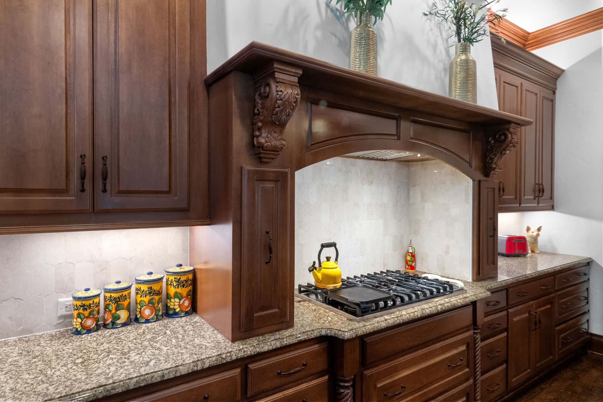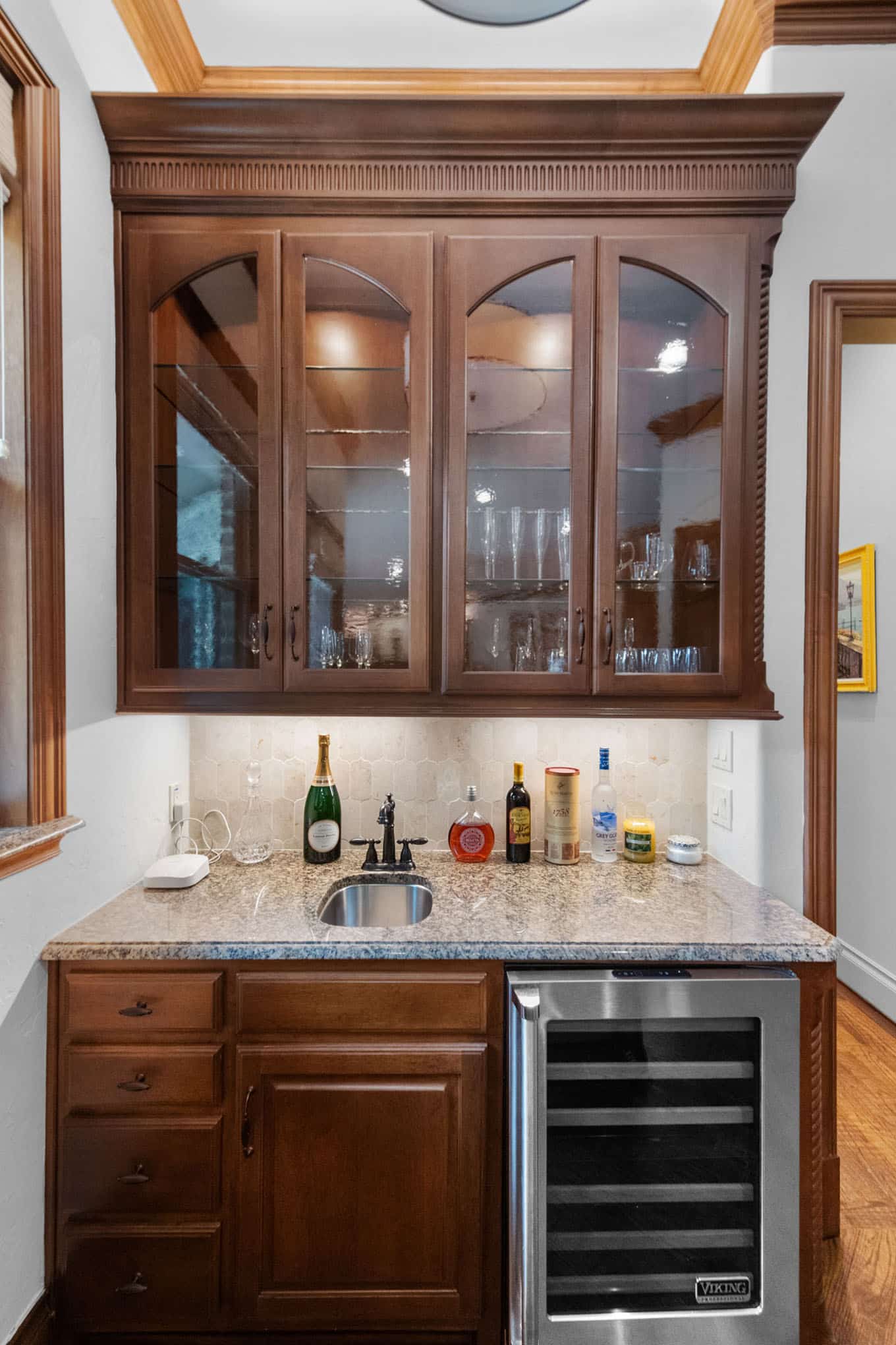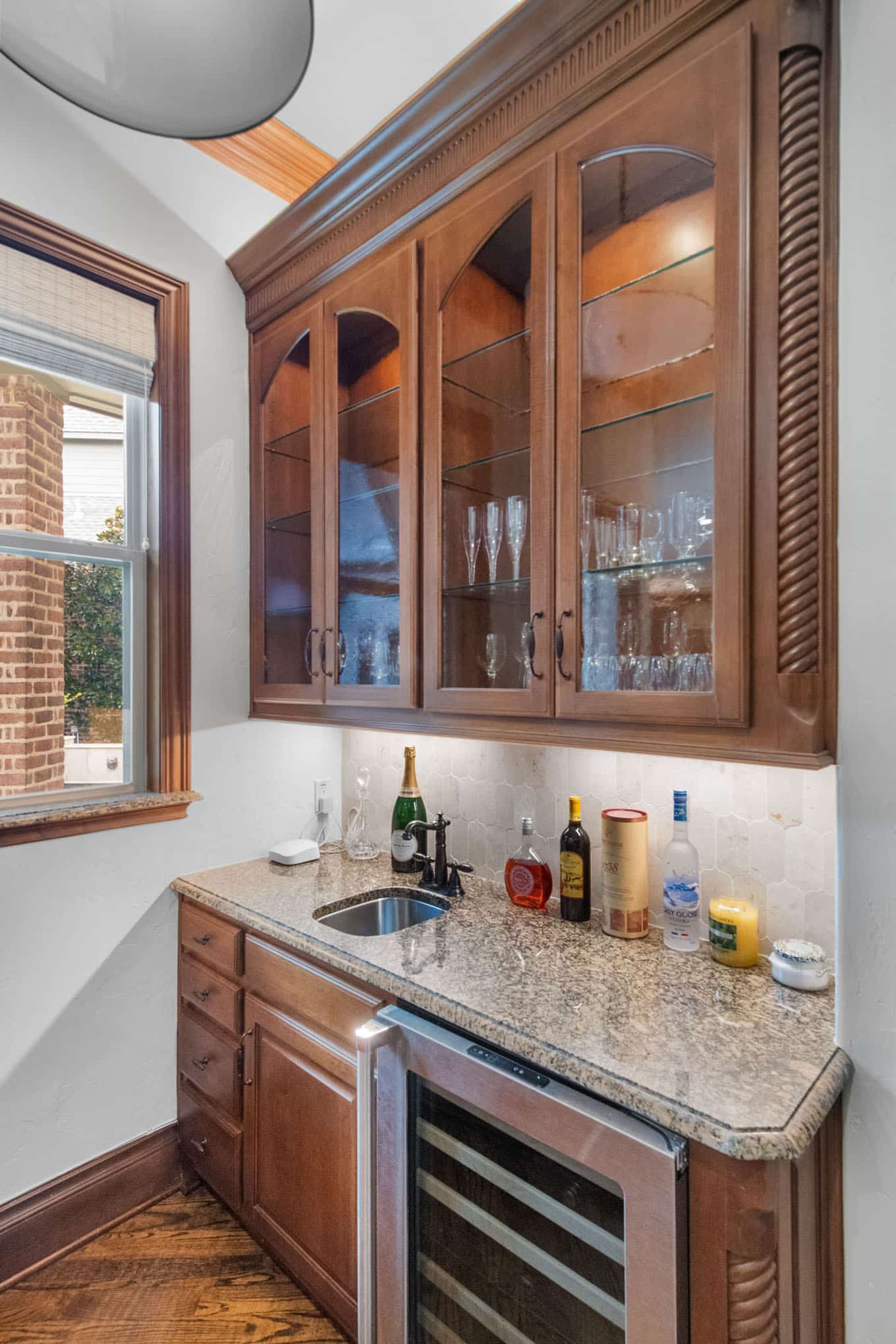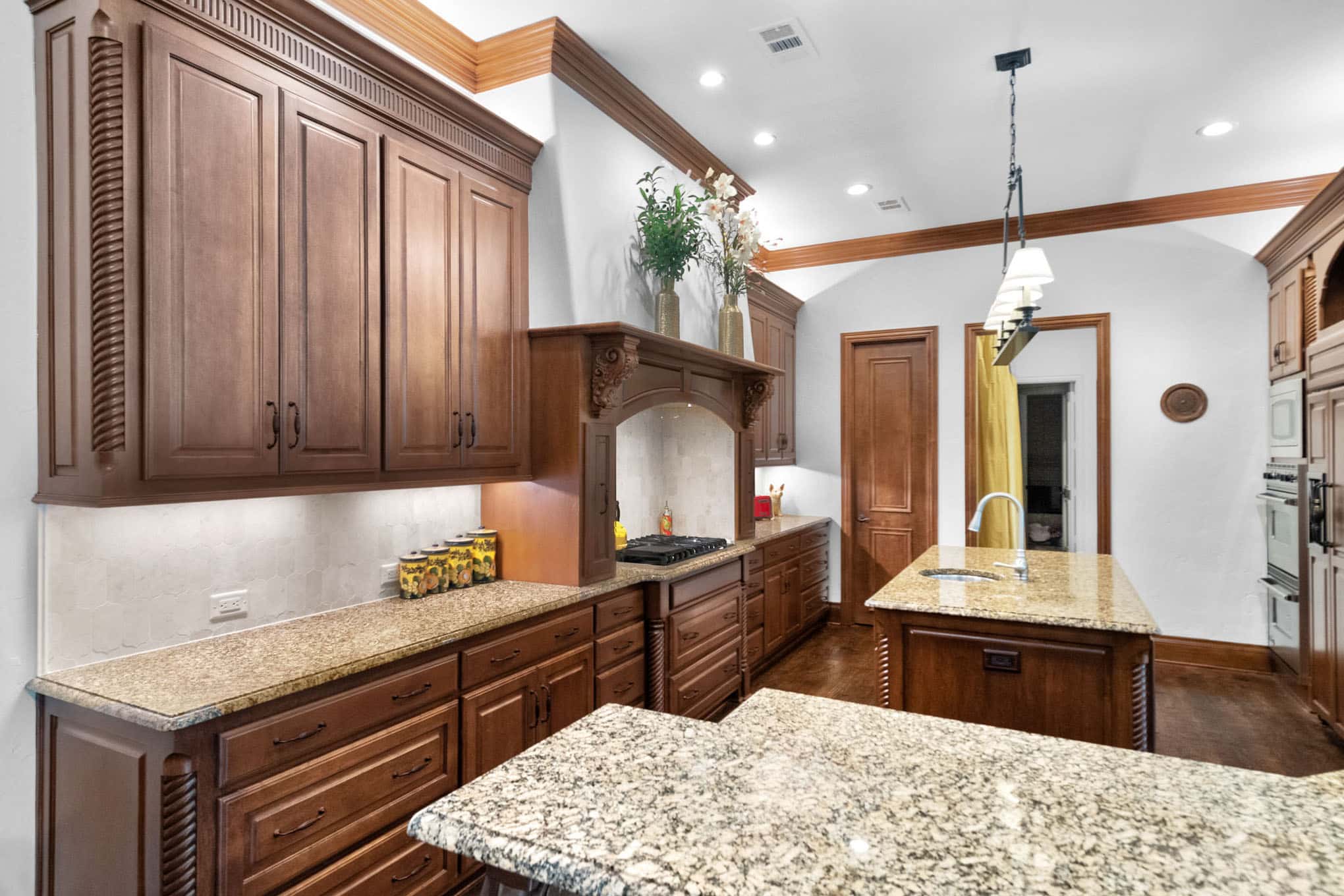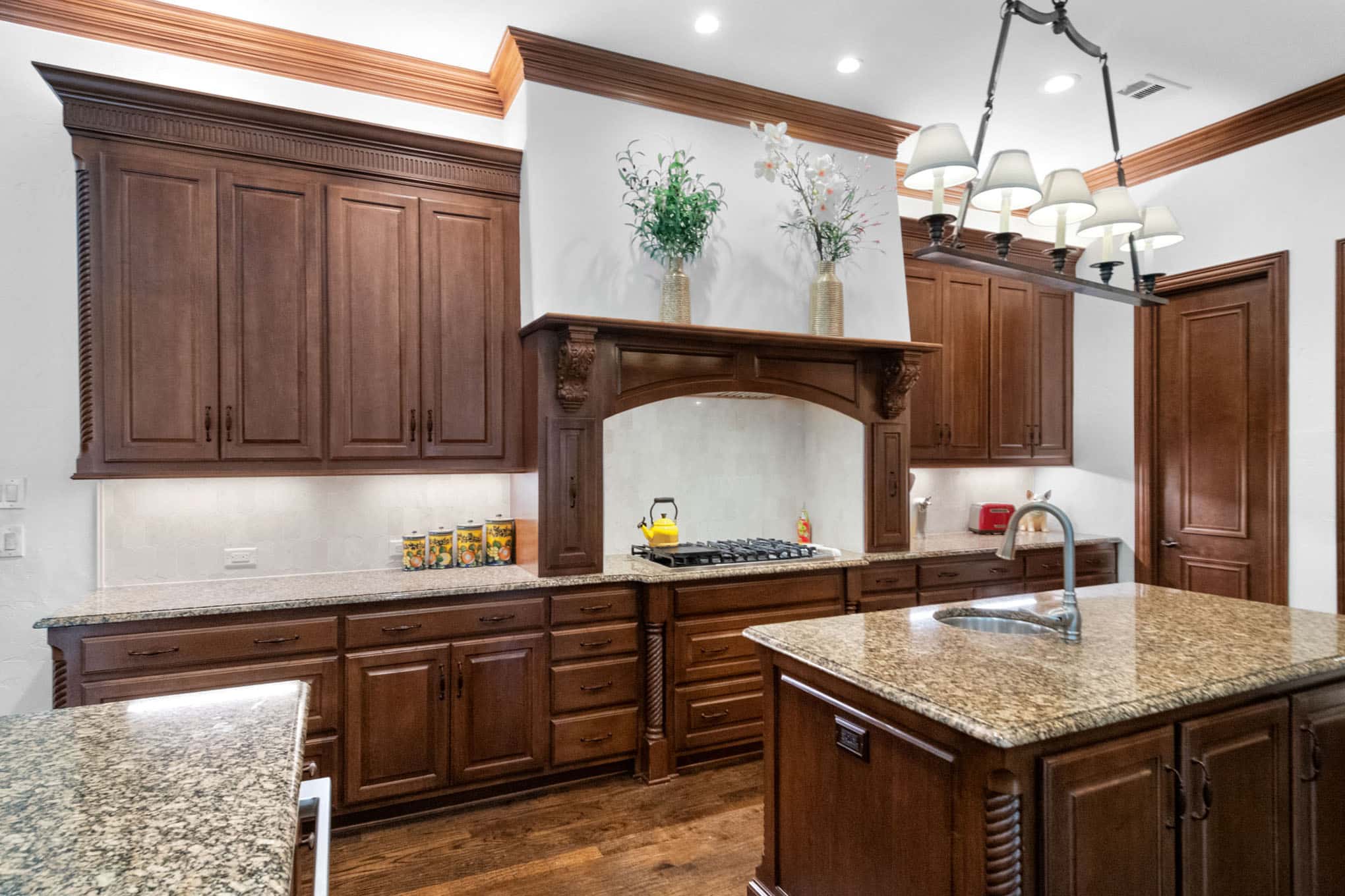 This refined Frisco renovation showcases our commitment to timeless craftsmanship and attention to detail. The gourmet kitchen features rich cherry cabinetry with intricate crown molding and decorative corbels, complemented by stunning granite countertops and a custom range hood with ornate woodwork. We designed multiple wet bar areas with illuminated glass-front display cabinets perfect for showcasing fine glassware and spirits, enhanced by subtle under-cabinet lighting and hexagonal stone backsplash.