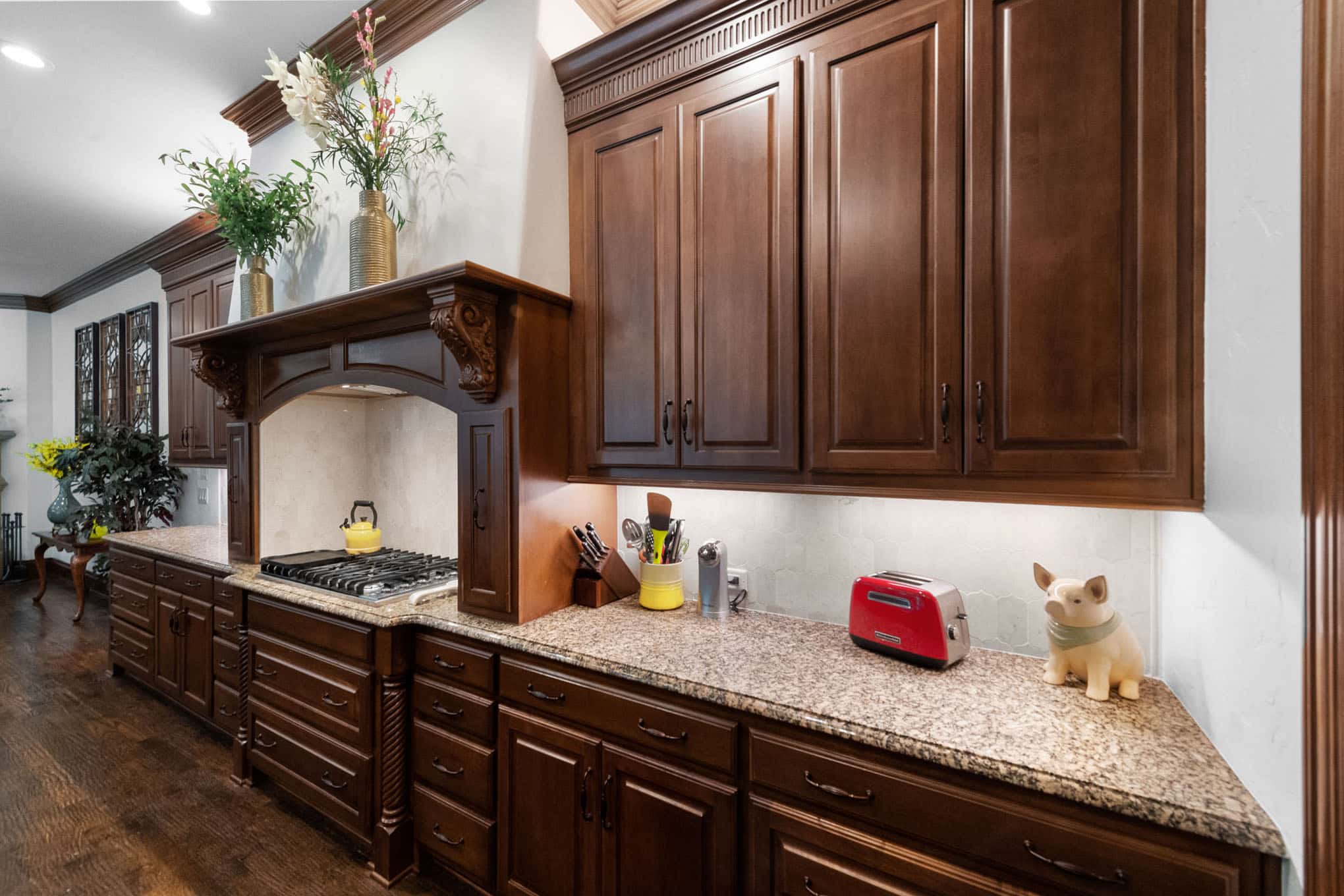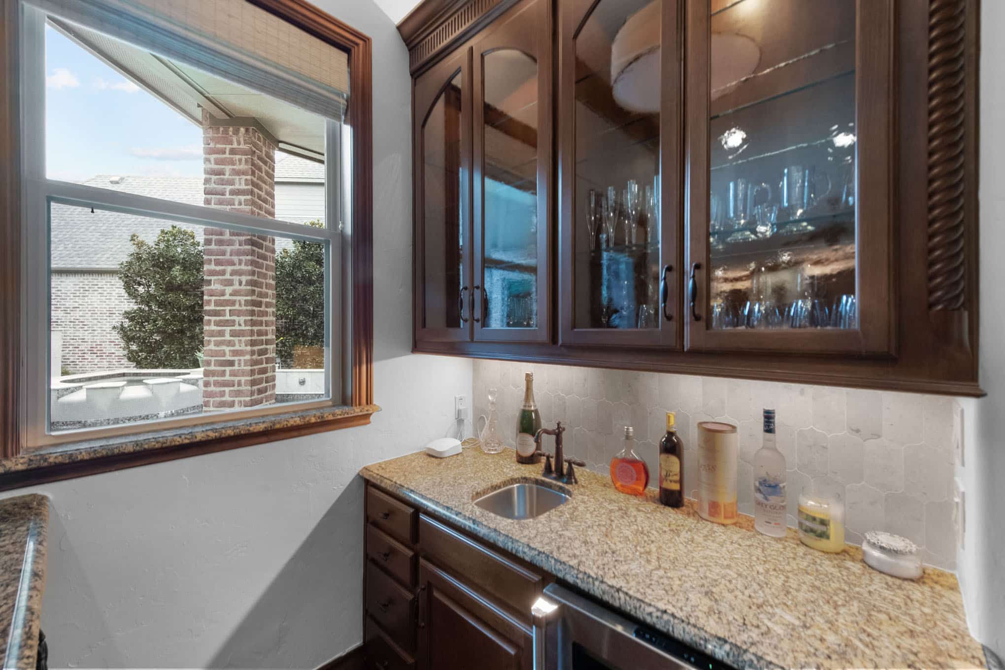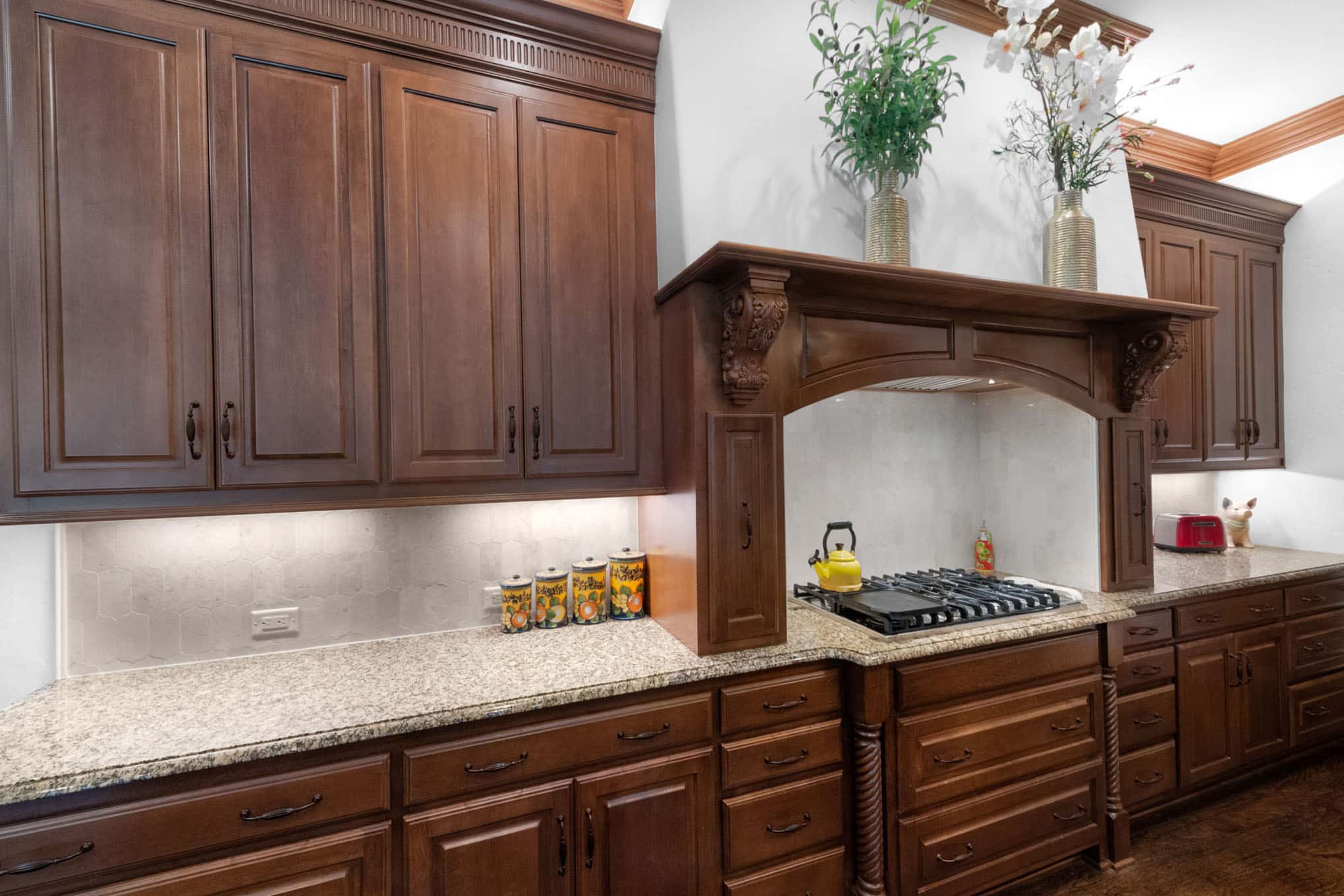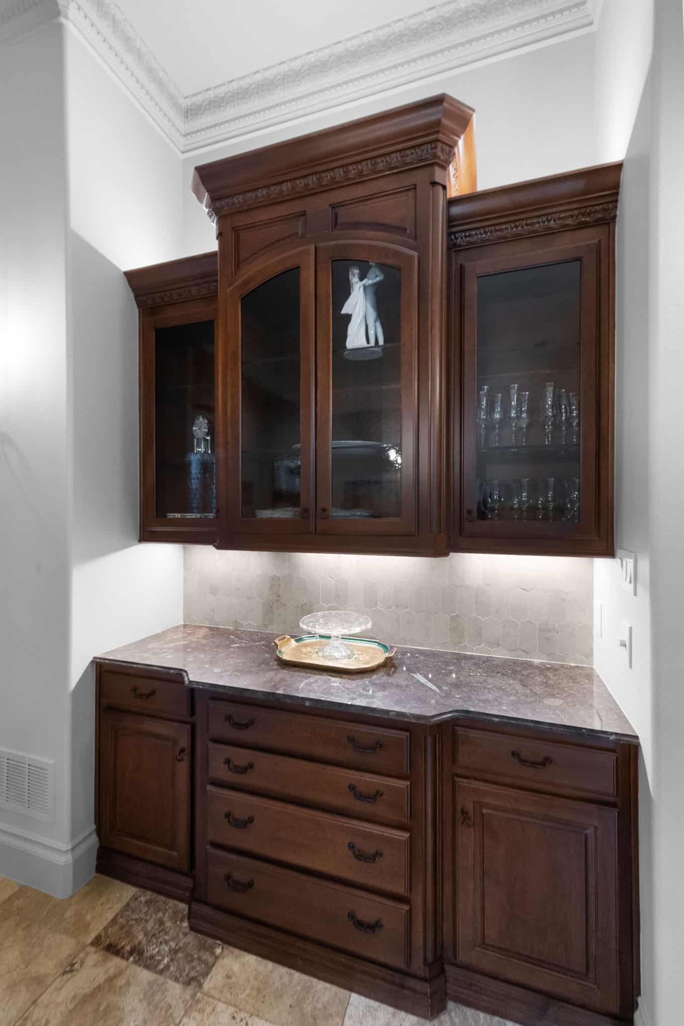 This refined Frisco renovation showcases our commitment to timeless craftsmanship and attention to detail. The gourmet kitchen features rich cherry cabinetry with intricate crown molding and decorative corbels, complemented by stunning granite countertops and a custom range hood with ornate woodwork. We designed multiple wet bar areas with illuminated glass-front display cabinets perfect for showcasing fine glassware and spirits, enhanced by subtle under-cabinet lighting and hexagonal stone backsplash.