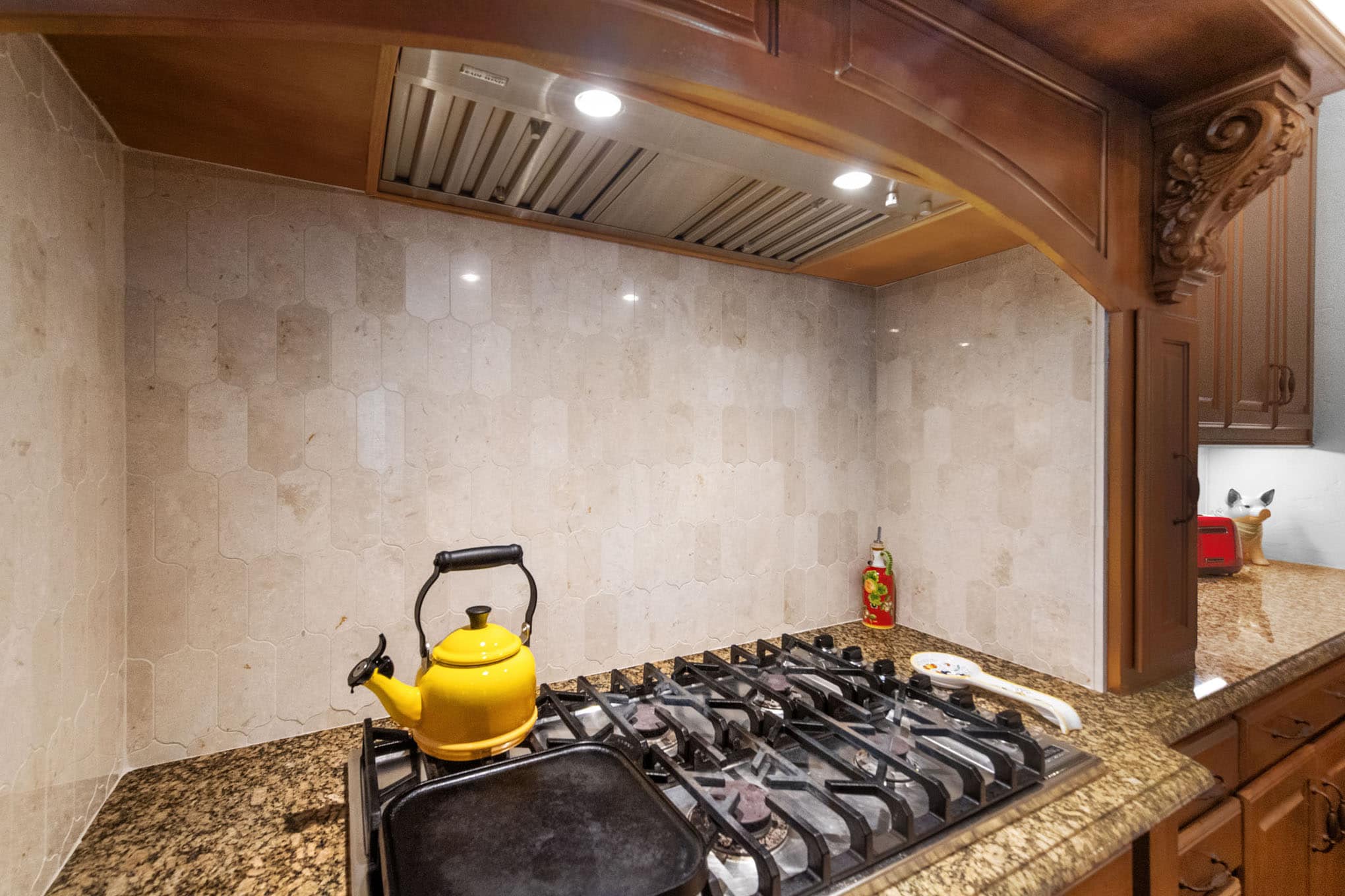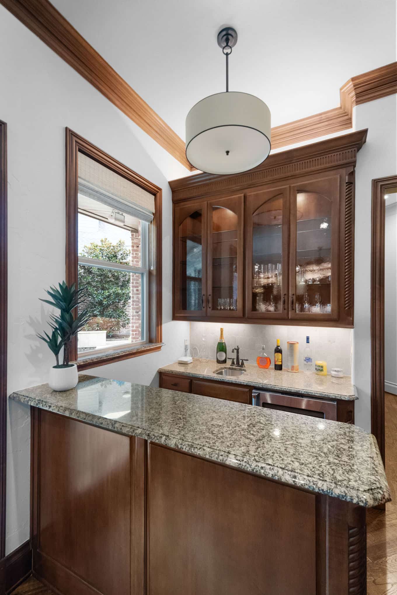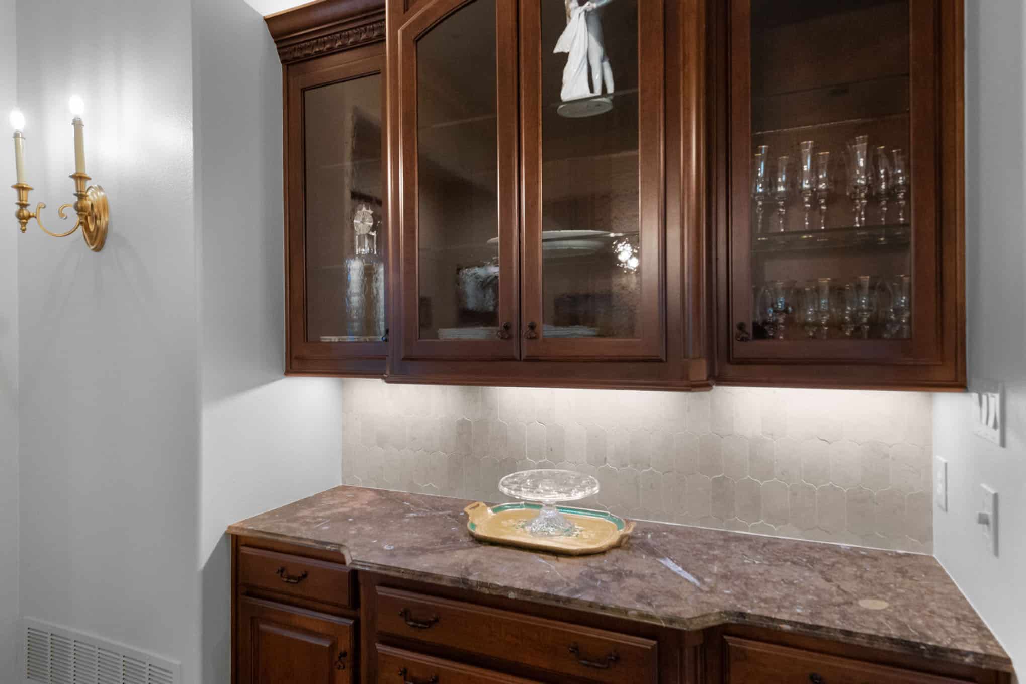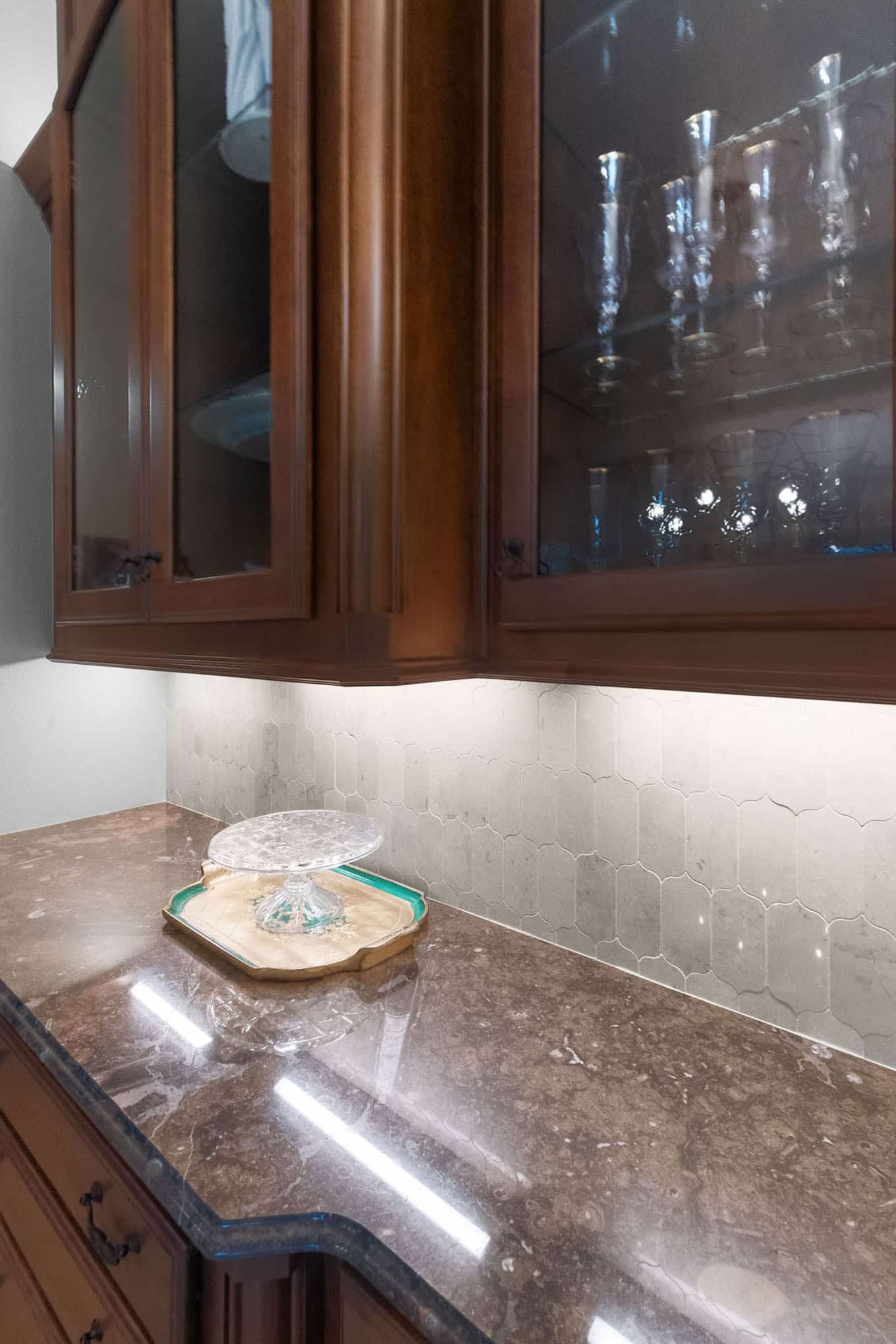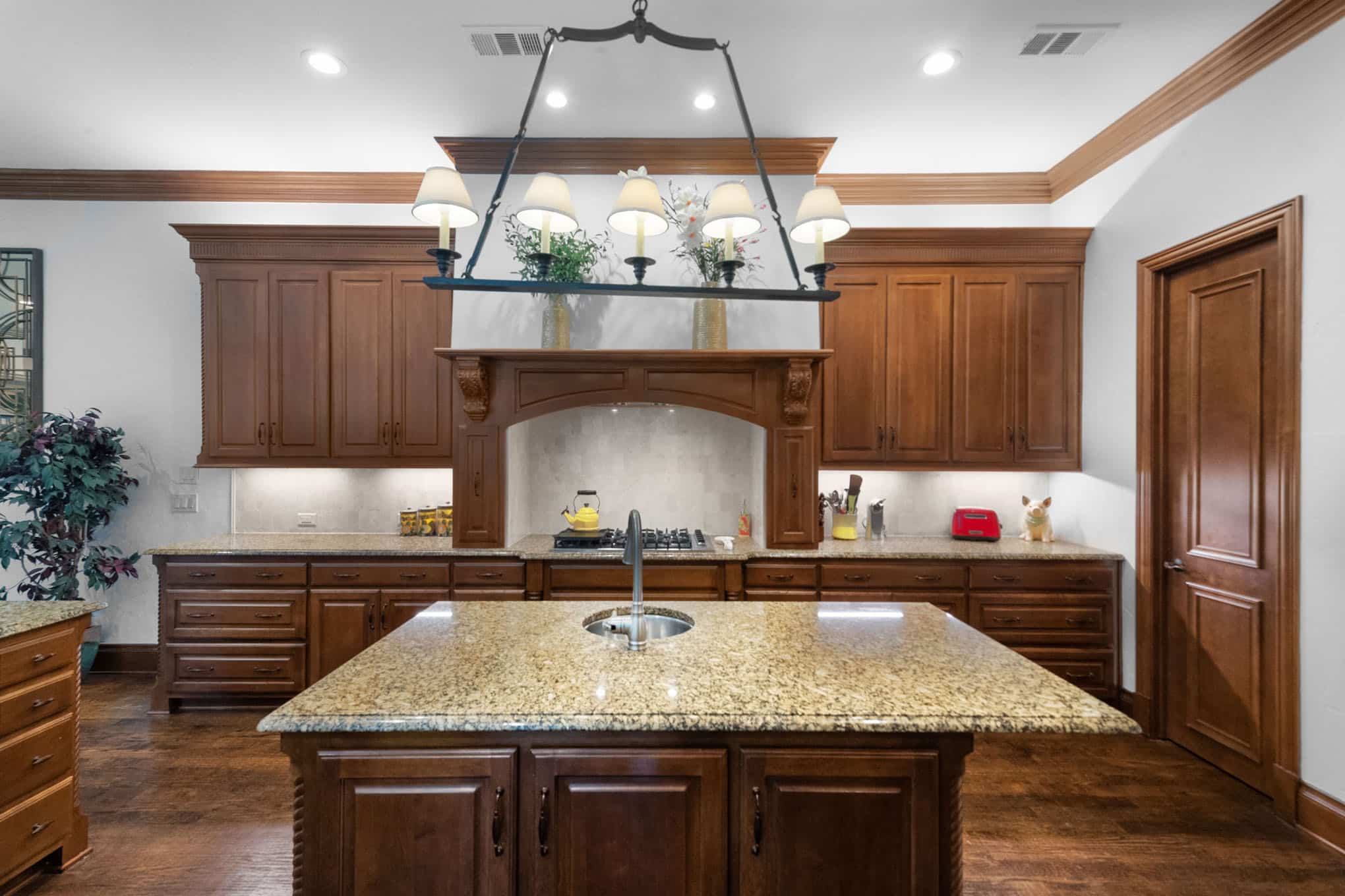 This refined Frisco renovation showcases our commitment to timeless craftsmanship and attention to detail. The gourmet kitchen features rich cherry cabinetry with intricate crown molding and decorative corbels, complemented by stunning granite countertops and a custom range hood with ornate woodwork. We designed multiple wet bar areas with illuminated glass-front display cabinets perfect for showcasing fine glassware and spirits, enhanced by subtle under-cabinet lighting and hexagonal stone backsplash.