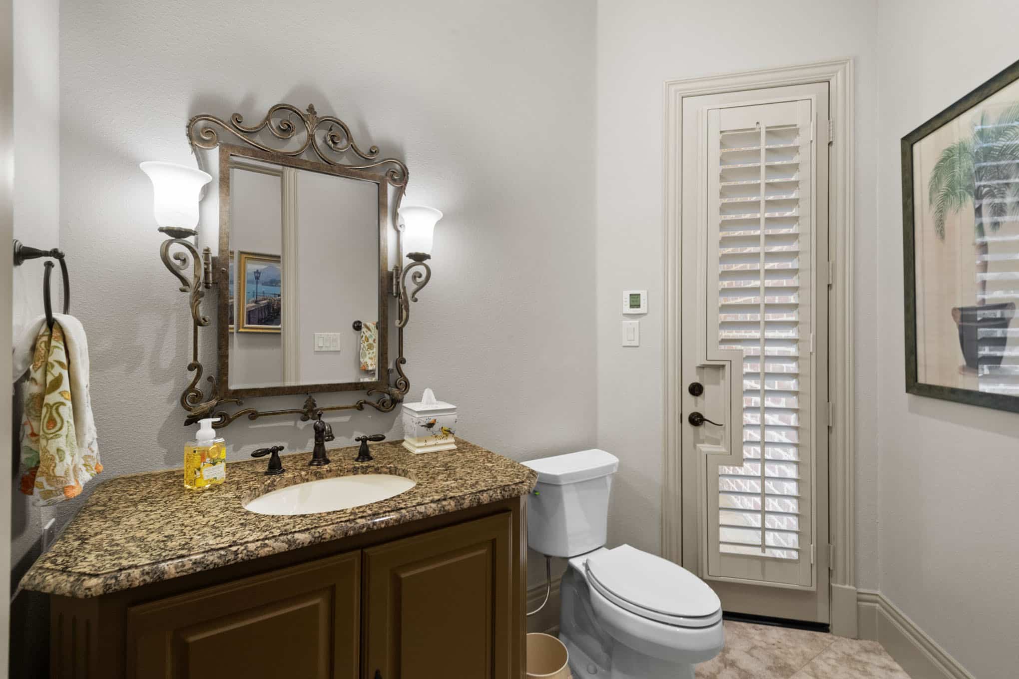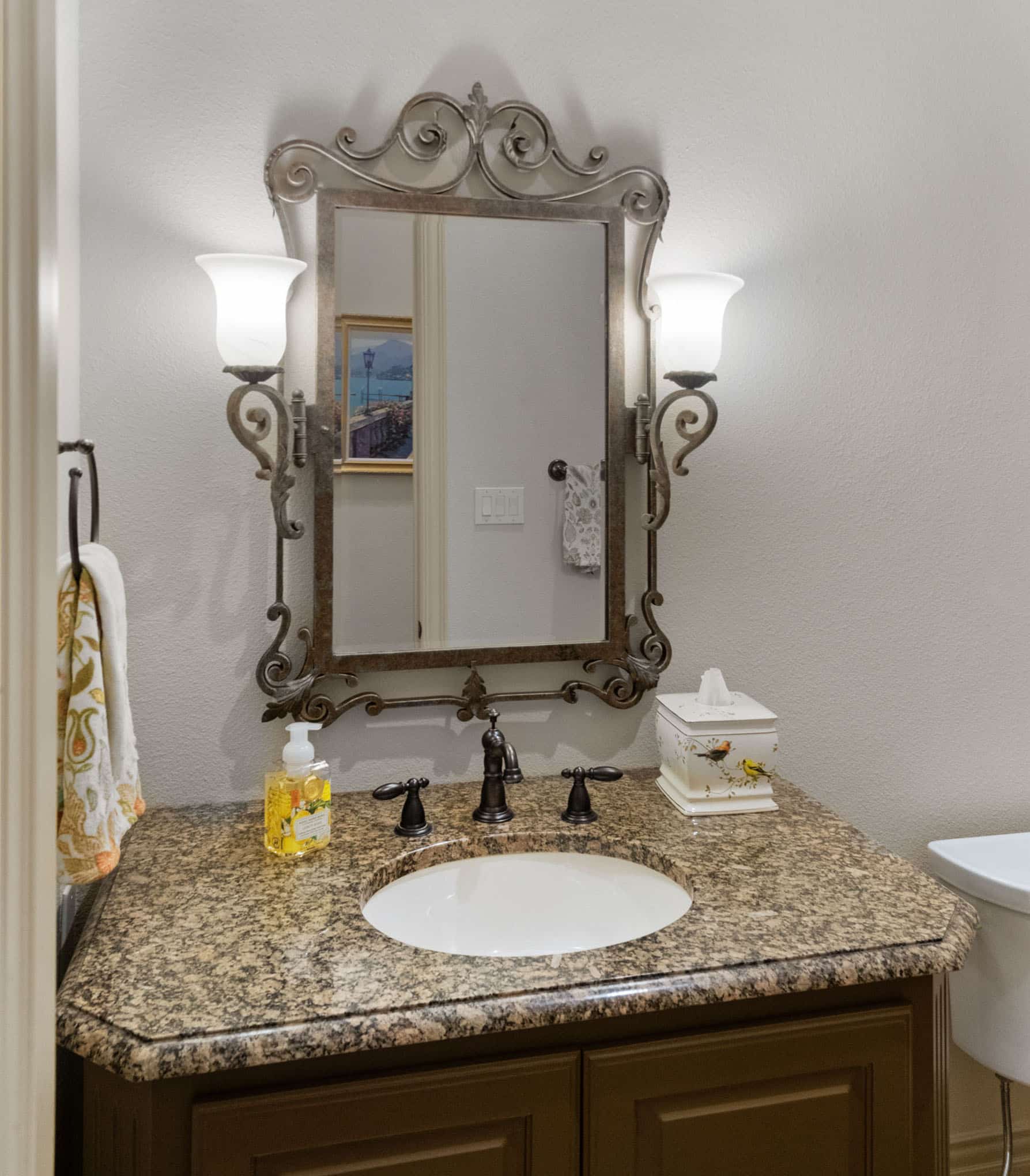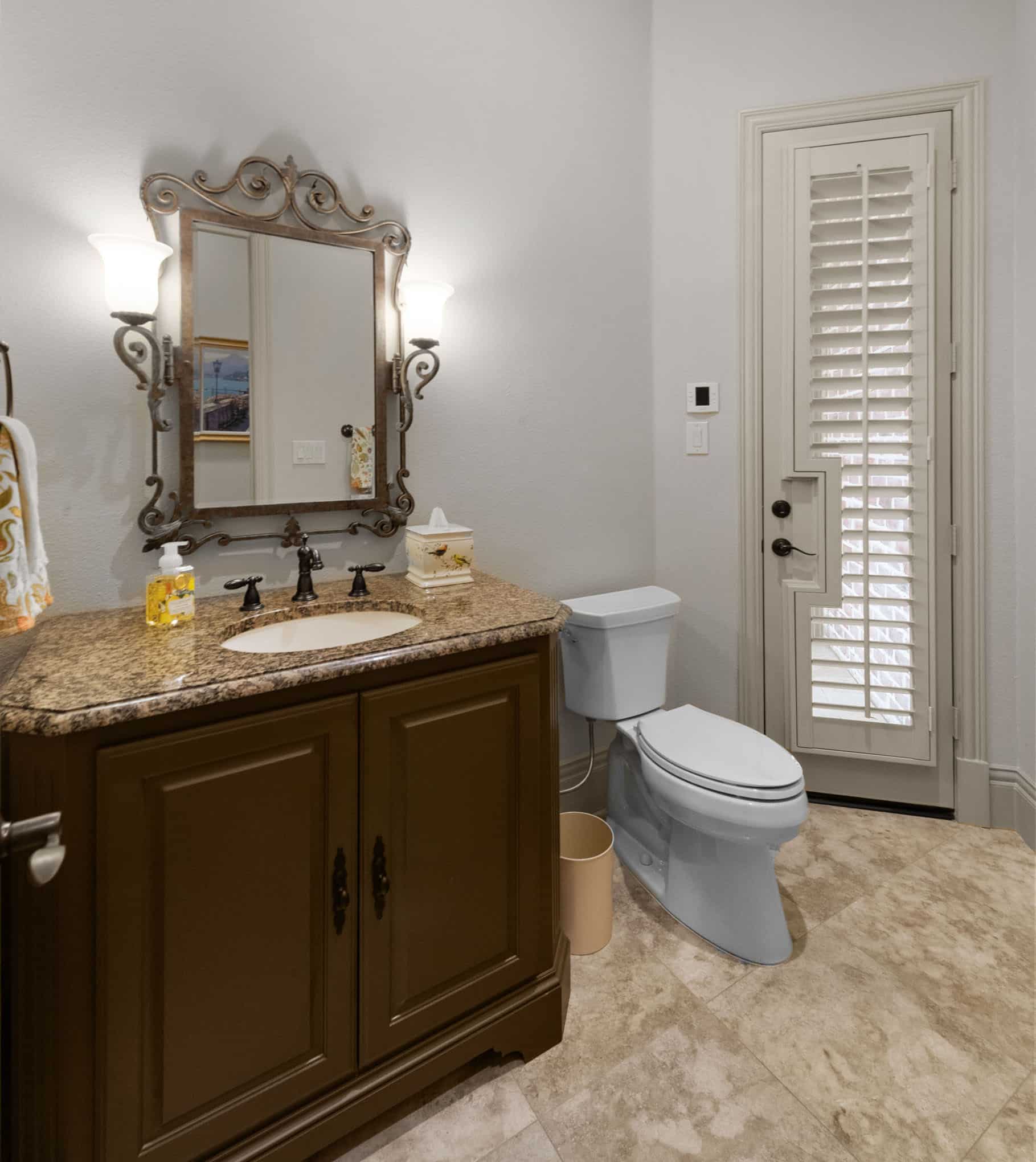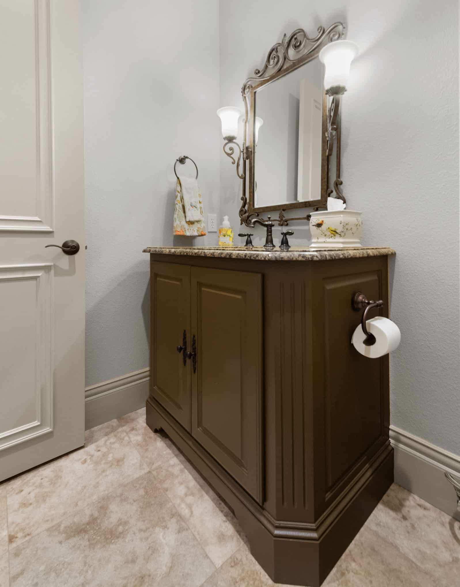 The powder room renovation continues the sophisticated aesthetic with a custom vanity, ornate mirror, and coordinating fixtures. Throughout the project, we incorporated clever storage solutions, premium finishes, and architectural details that honor the home’s traditional character while providing modern functionality. This comprehensive renovation demonstrates our ability to create cohesive, elegant spaces that balance classic design with contemporary convenience.