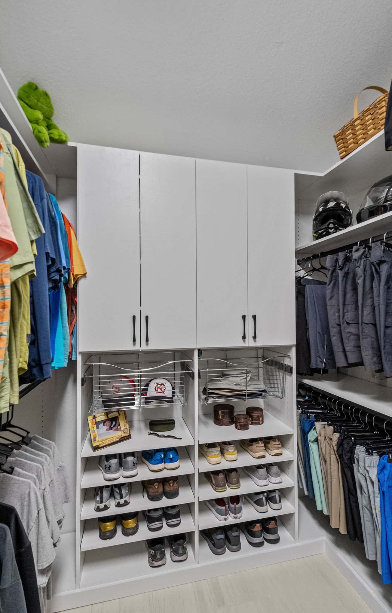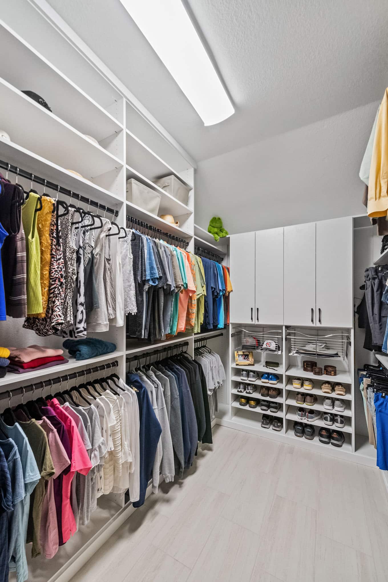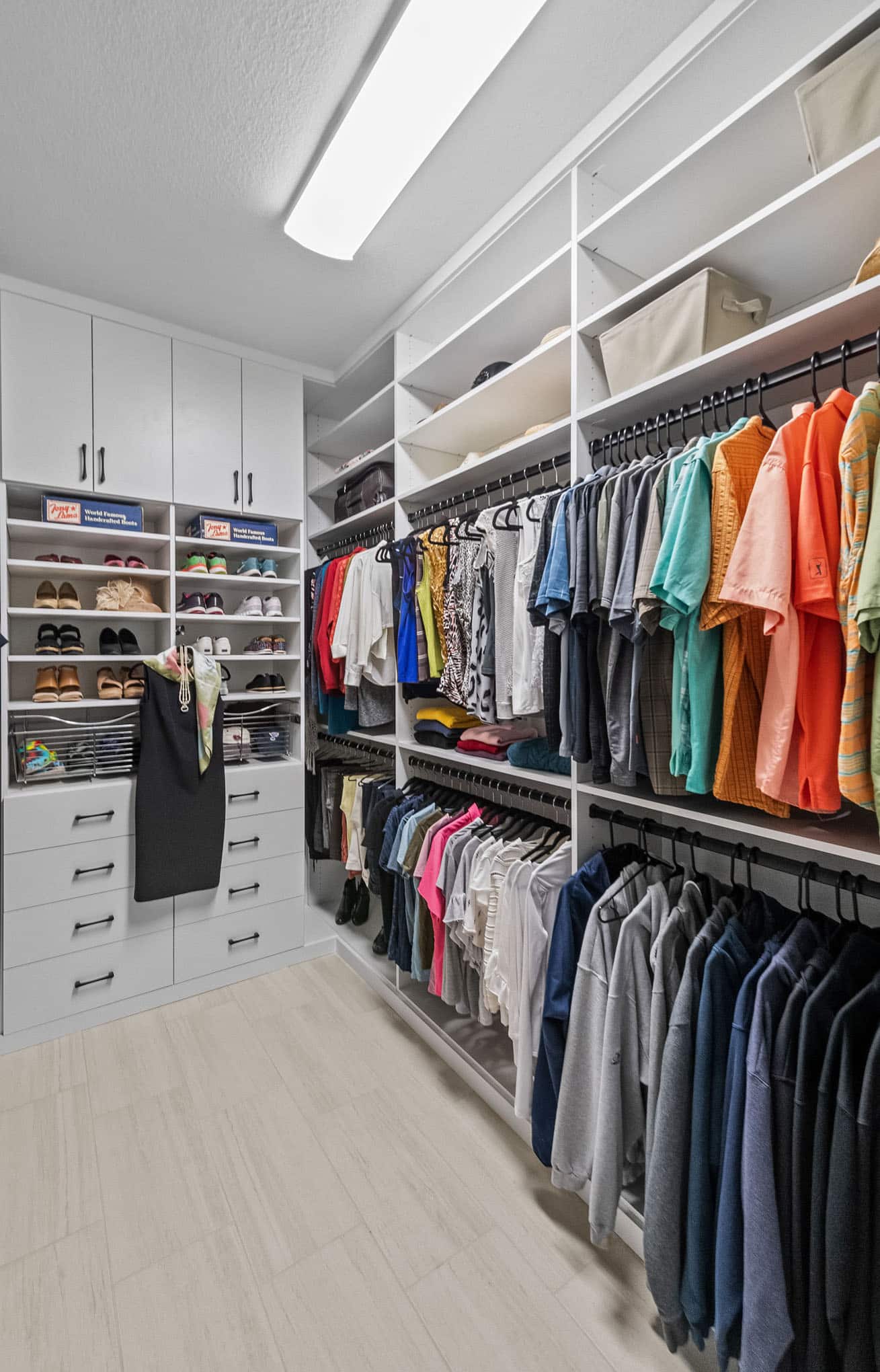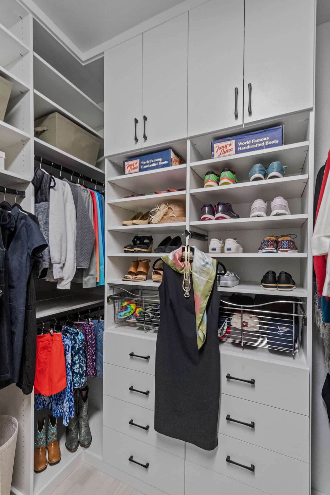 This 2024 master closet renovation in Fort Worth showcases our commitment to combining functionality with elegant design. The custom all-white cabinetry creates a bright, organized space with dedicated zones for hanging clothes, folded items, and an extensive shoe collection. Multiple hanging rods maximize vertical space while providing separate areas for different clothing types. The thoughtfully designed drawer system offers convenient storage for smaller accessories, while upper shelving accommodates seasonal items and storage bins. Light-colored flooring complements the crisp white built-ins, enhancing the sense of spaciousness in this practical yet sophisticated walk-in closet.