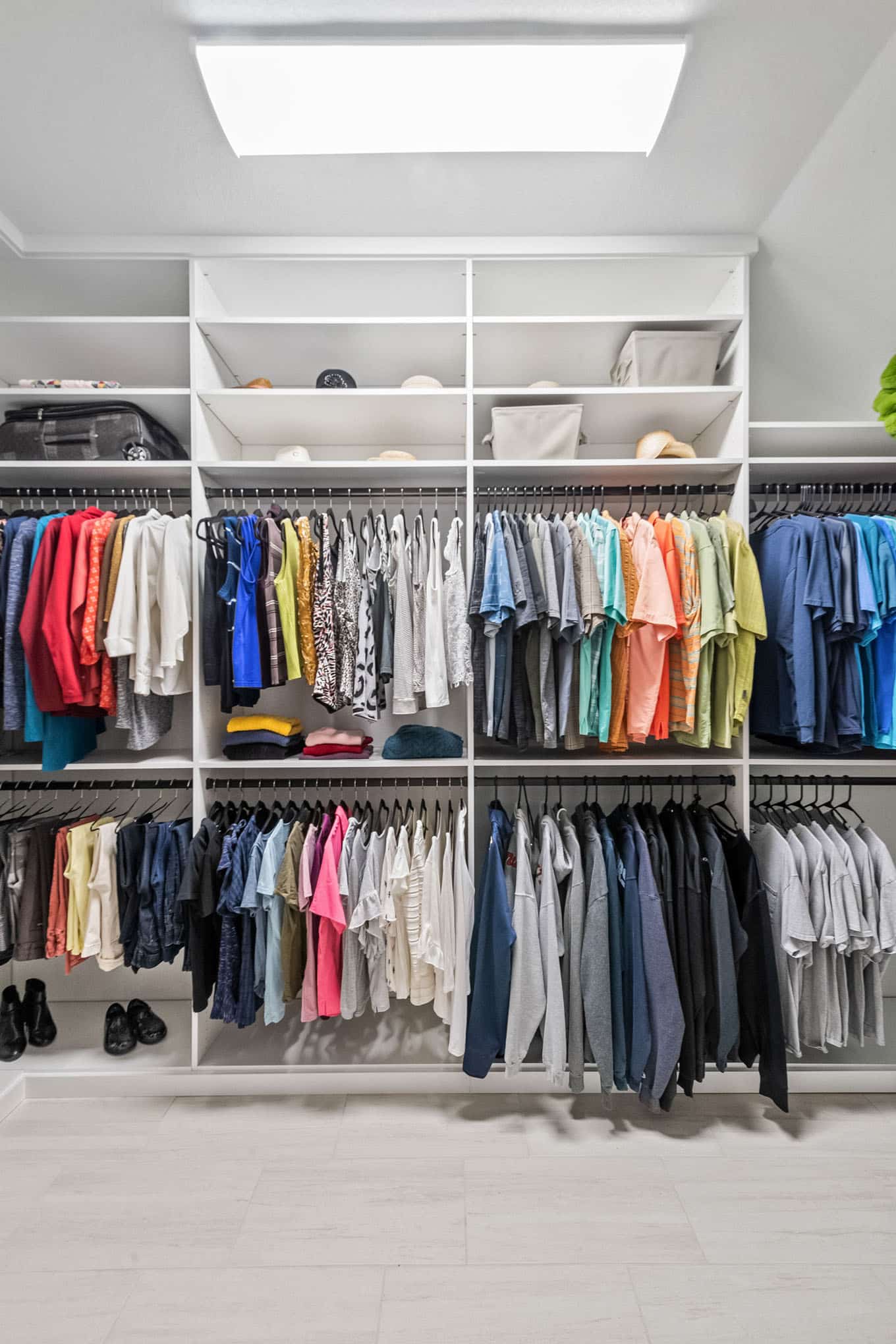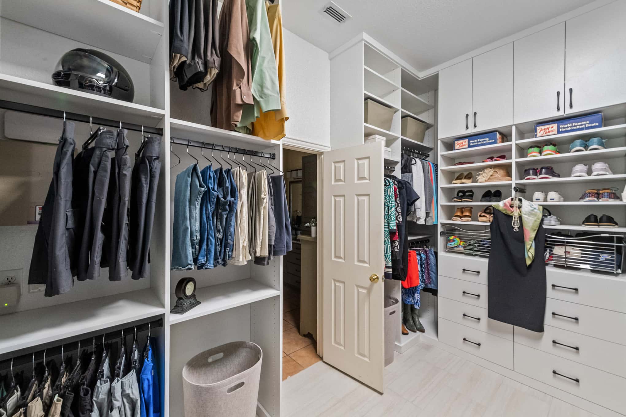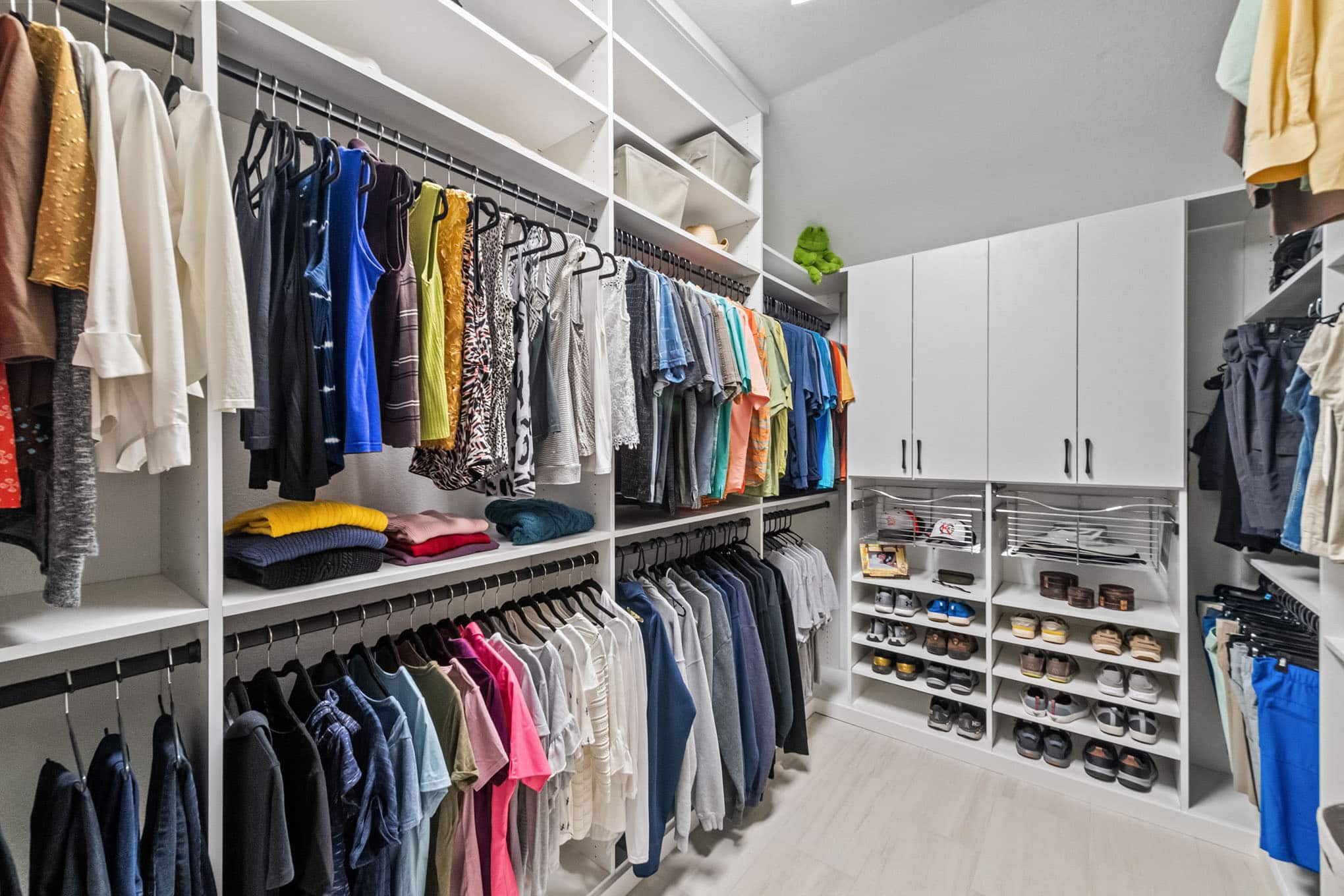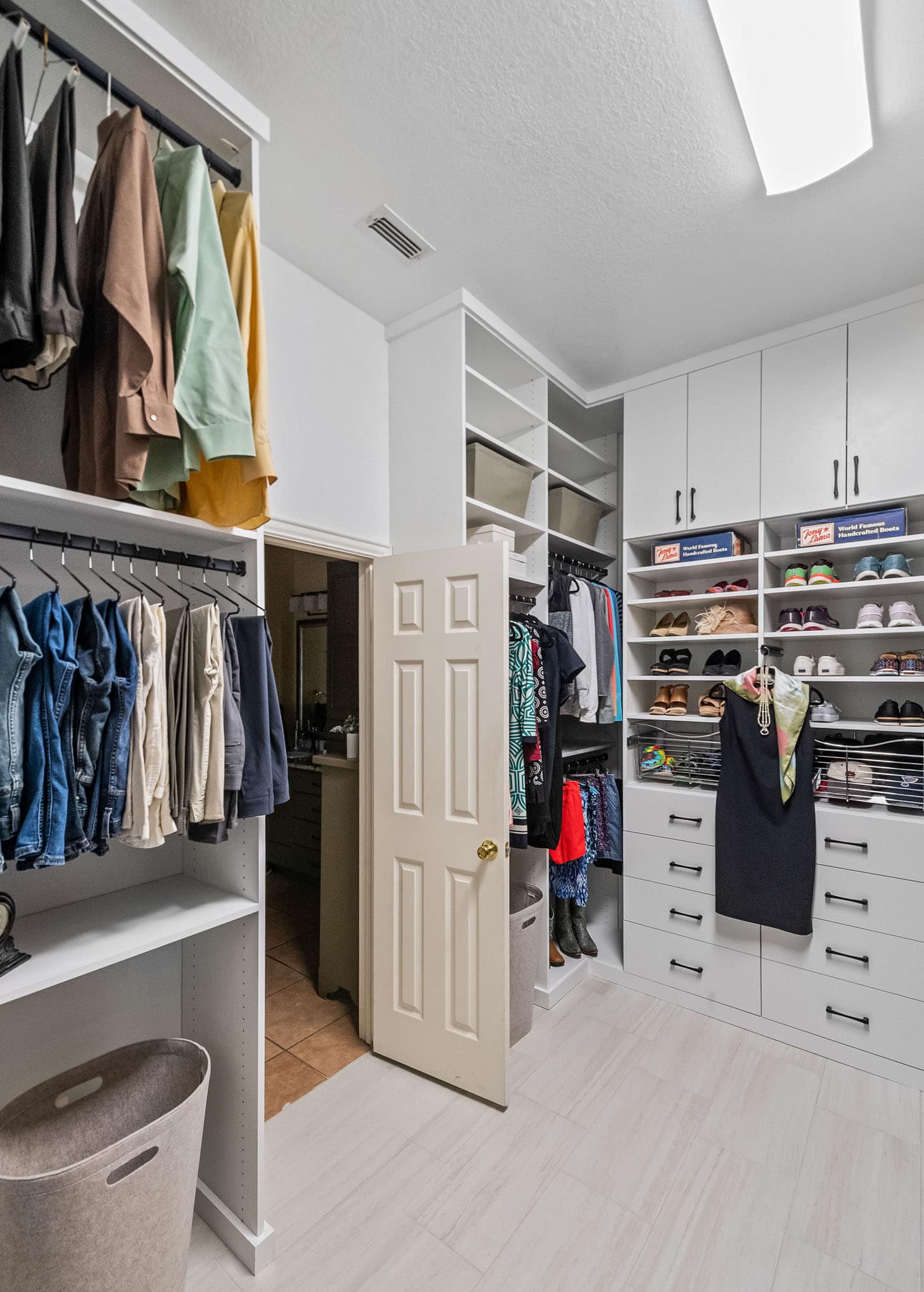 This 2024 master closet renovation in Fort Worth showcases our commitment to combining functionality with elegant design. The custom all-white cabinetry creates a bright, organized space with dedicated zones for hanging clothes, folded items, and an extensive shoe collection. Multiple hanging rods maximize vertical space while providing separate areas for different clothing types. The thoughtfully designed drawer system offers convenient storage for smaller accessories, while upper shelving accommodates seasonal items and storage bins. Light-colored flooring complements the crisp white built-ins, enhancing the sense of spaciousness in this practical yet sophisticated walk-in closet.