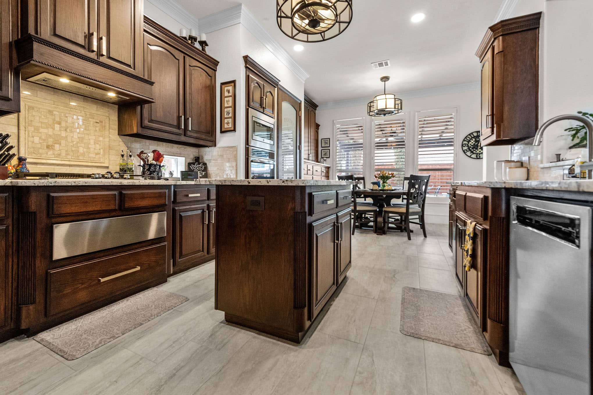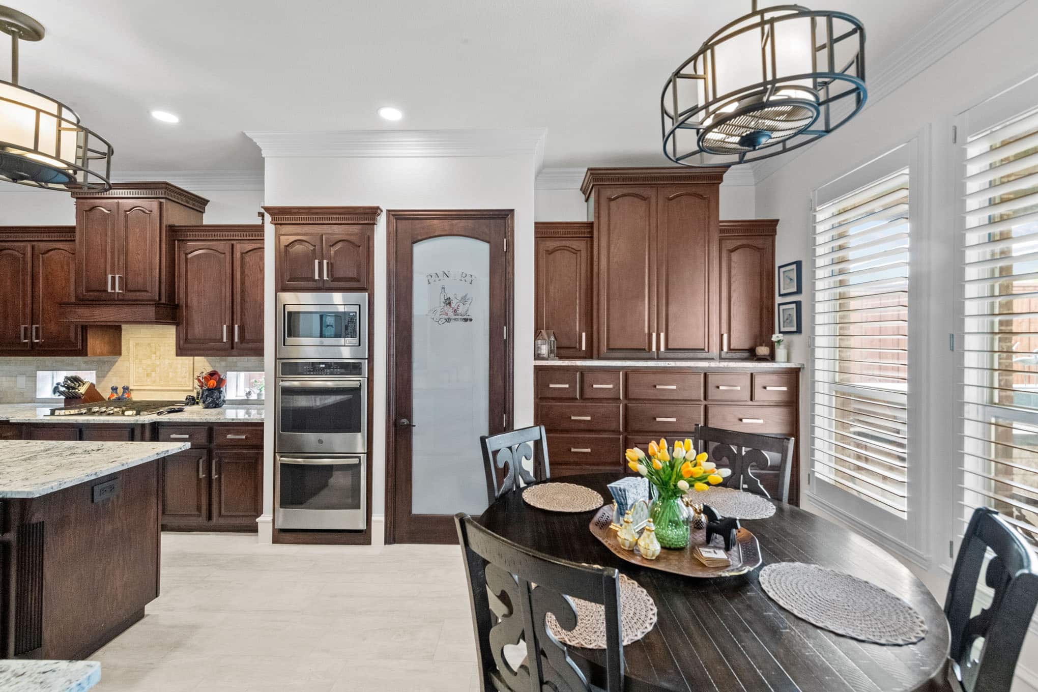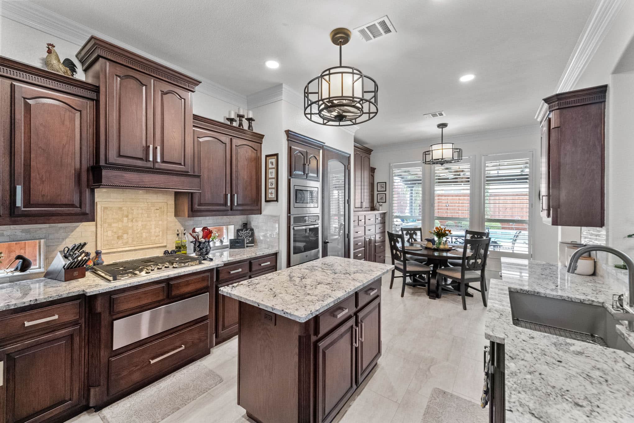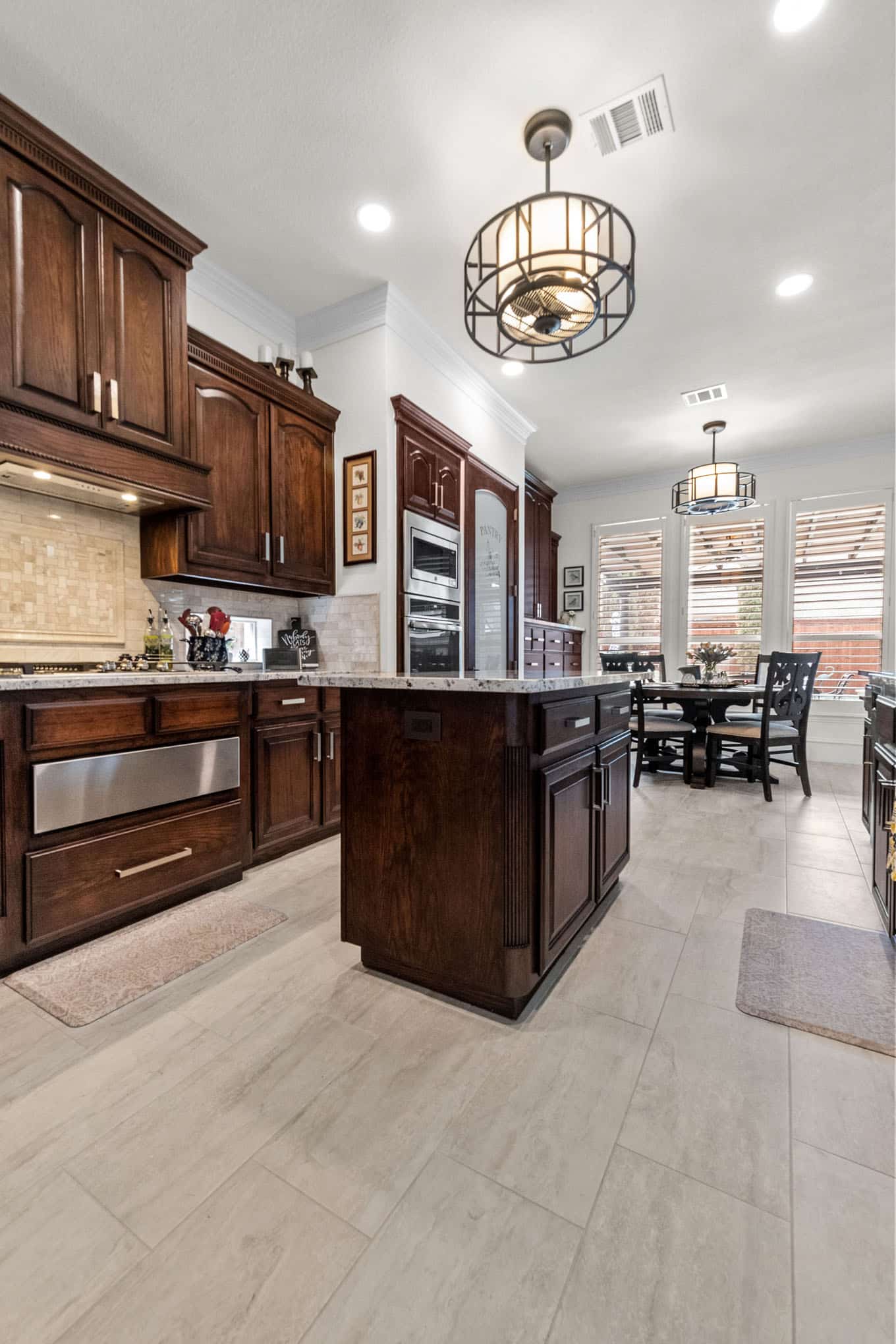 This elegant Frisco transformation showcases Elite Remodeling’s commitment to traditional craftsmanship blended with modern functionality. The expansive kitchen renovation features rich walnut cabinetry complemented by luminous white granite countertops, creating a timeless aesthetic with contemporary appeal. Professional-grade stainless steel appliances and distinctive lighting fixtures with industrial-inspired elements enhance both performance and visual interest. The thoughtfully designed layout creates multiple work zones, including a central island and breakfast nook, perfect for both entertaining and everyday living.