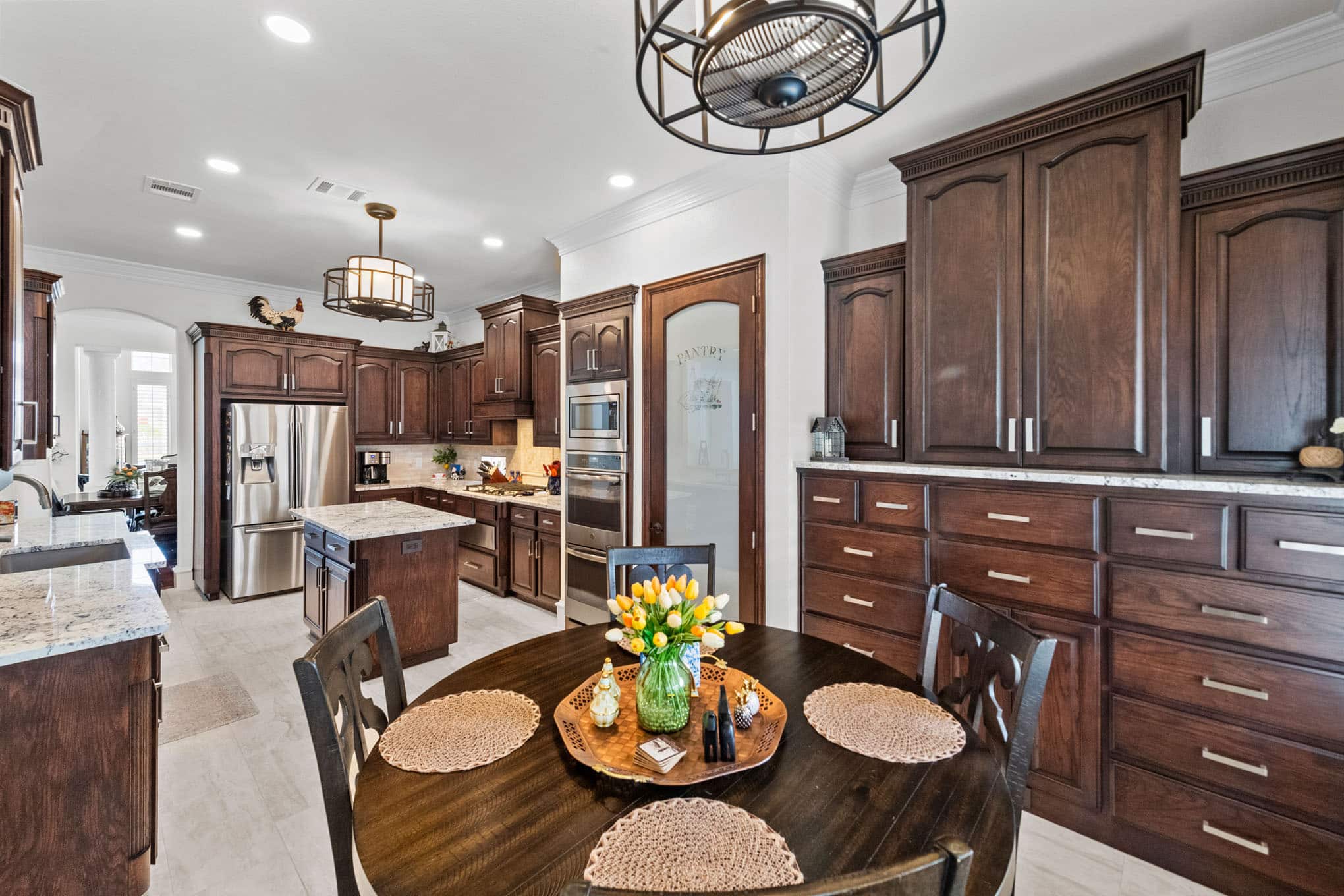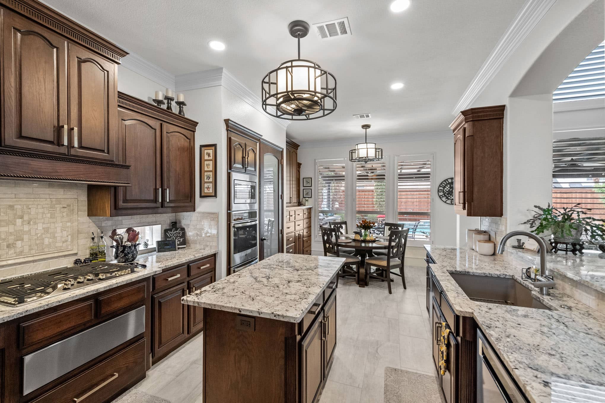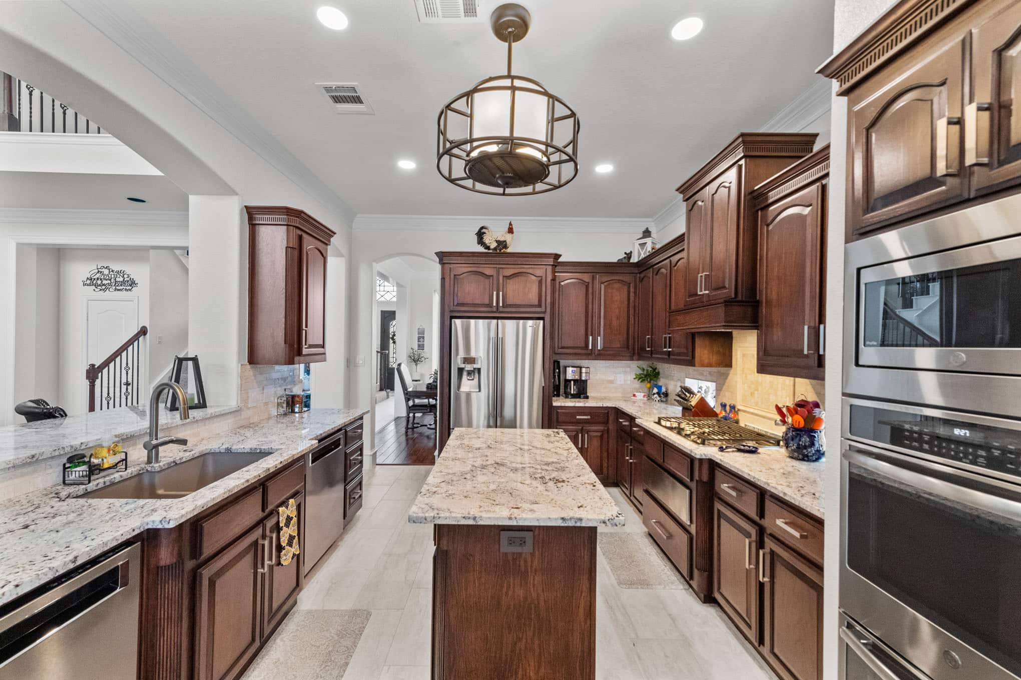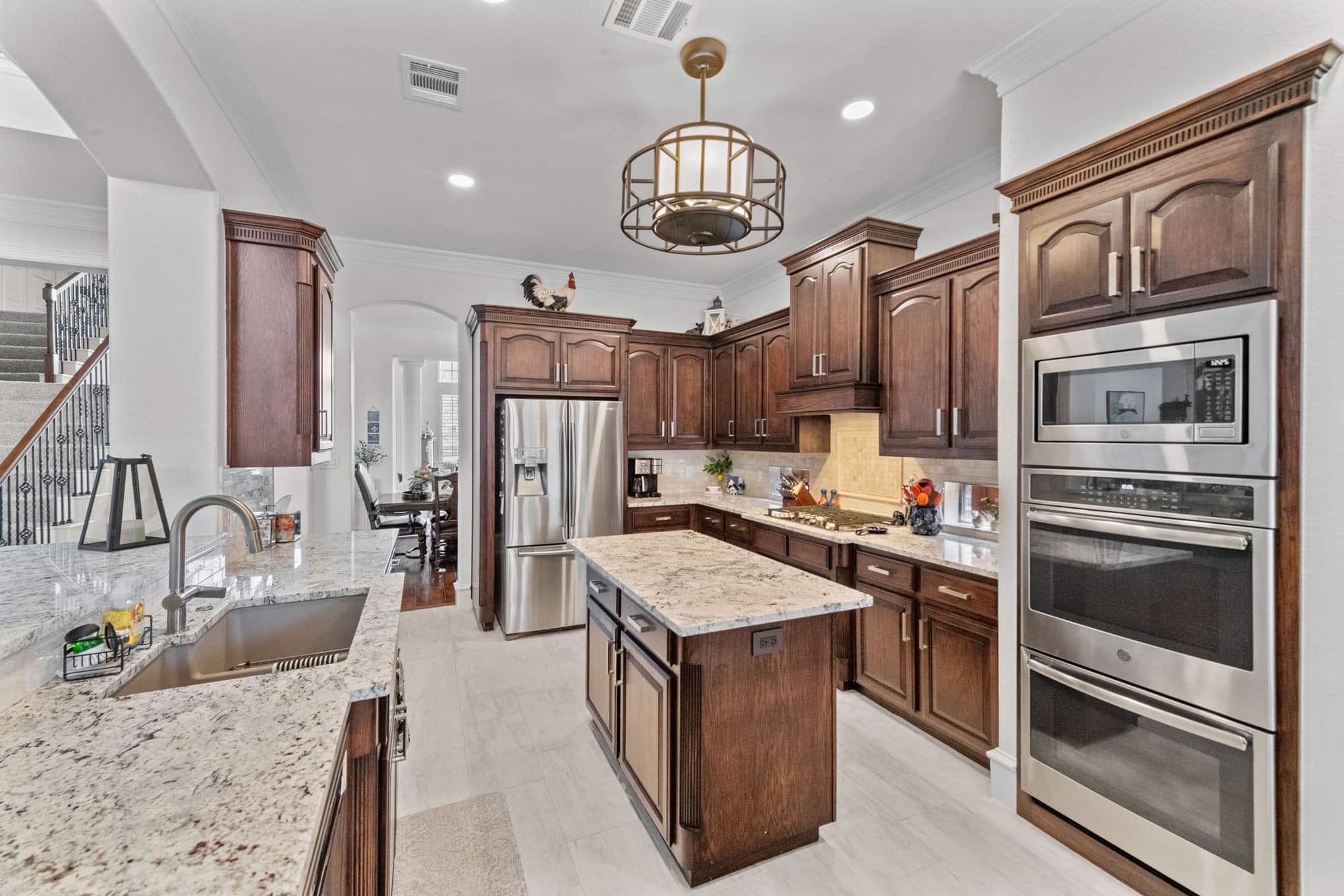 This elegant Frisco transformation showcases Elite Remodeling’s commitment to traditional craftsmanship blended with modern functionality. The expansive kitchen renovation features rich walnut cabinetry complemented by luminous white granite countertops, creating a timeless aesthetic with contemporary appeal. Professional-grade stainless steel appliances and distinctive lighting fixtures with industrial-inspired elements enhance both performance and visual interest. The thoughtfully designed layout creates multiple work zones, including a central island and breakfast nook, perfect for both entertaining and everyday living.