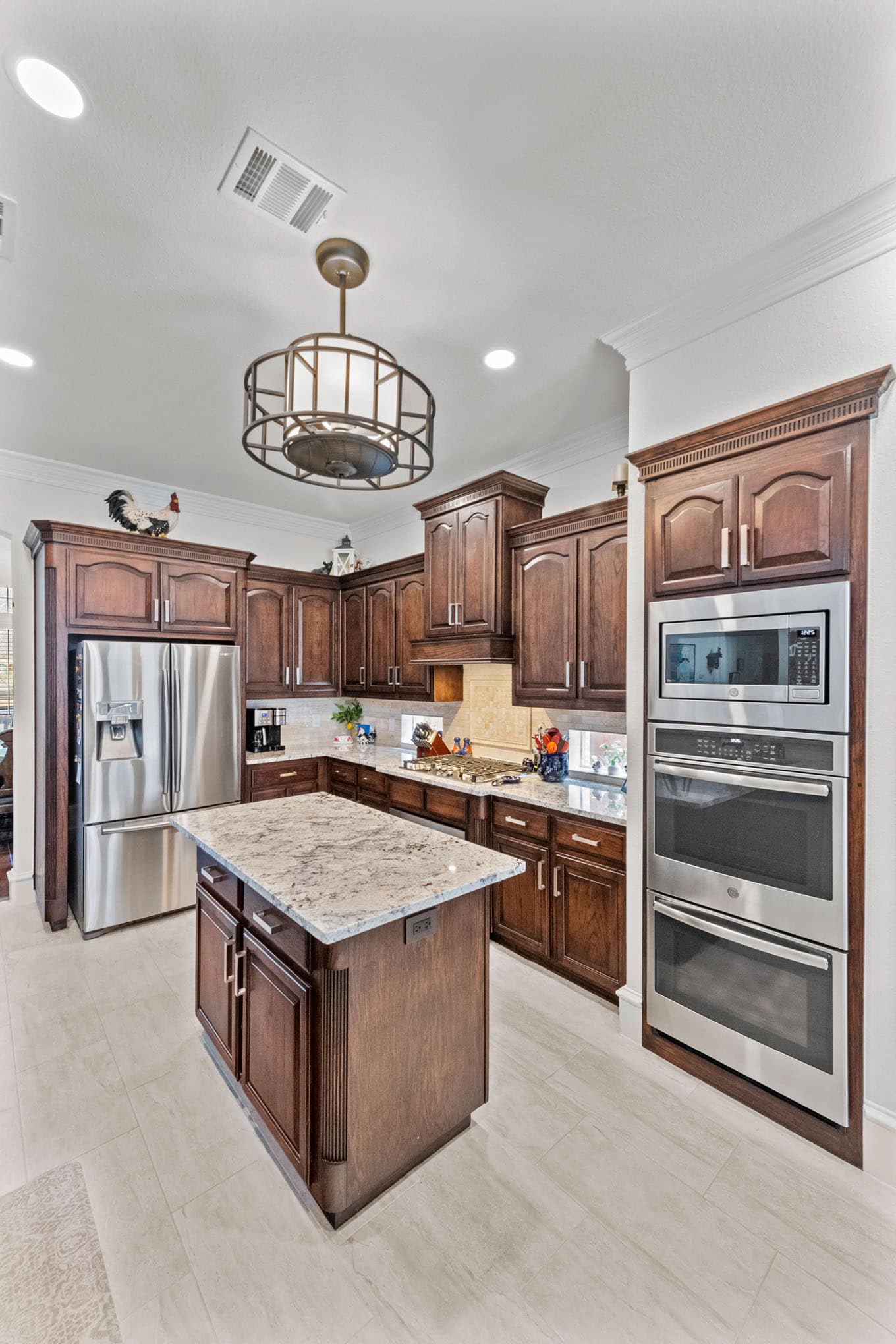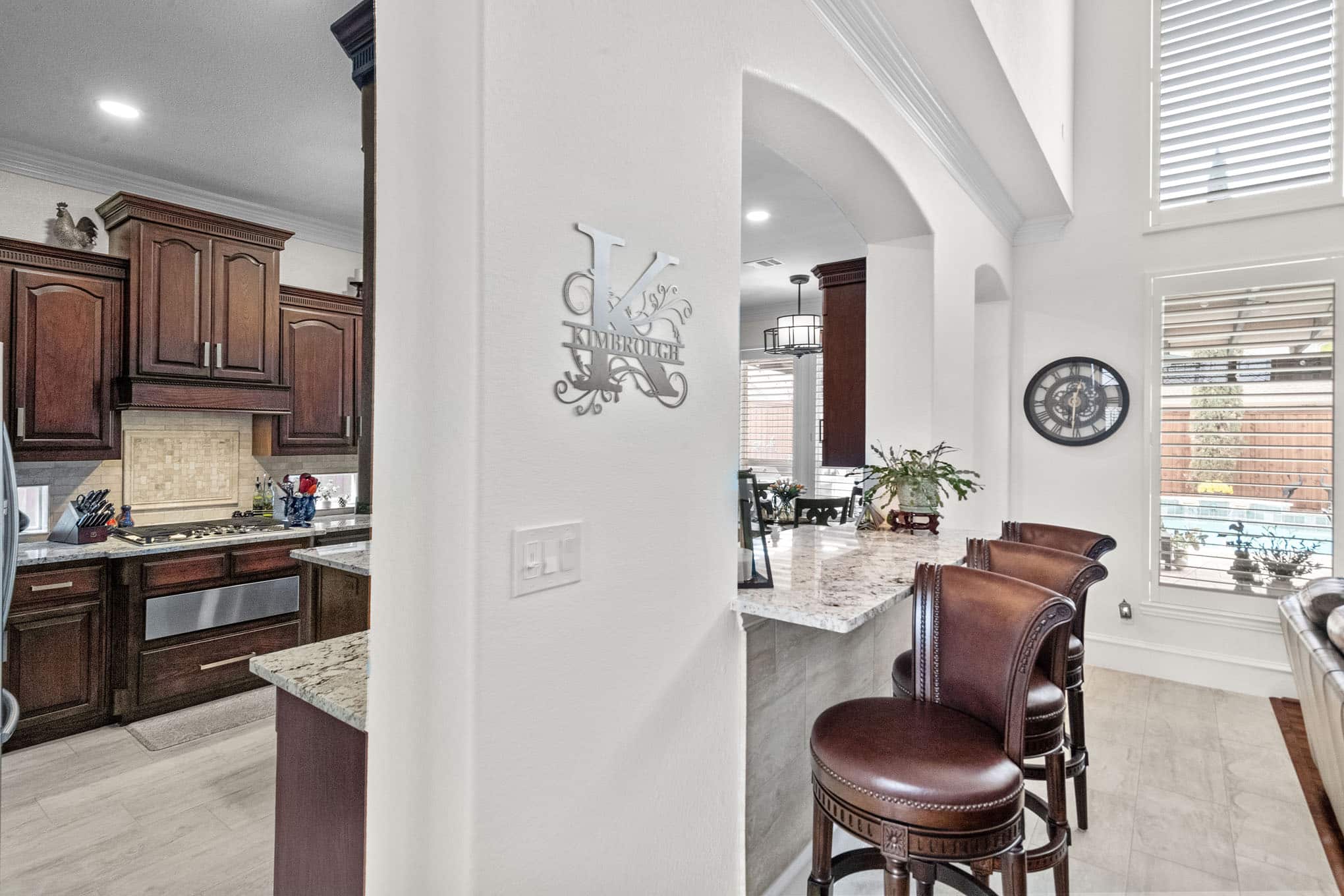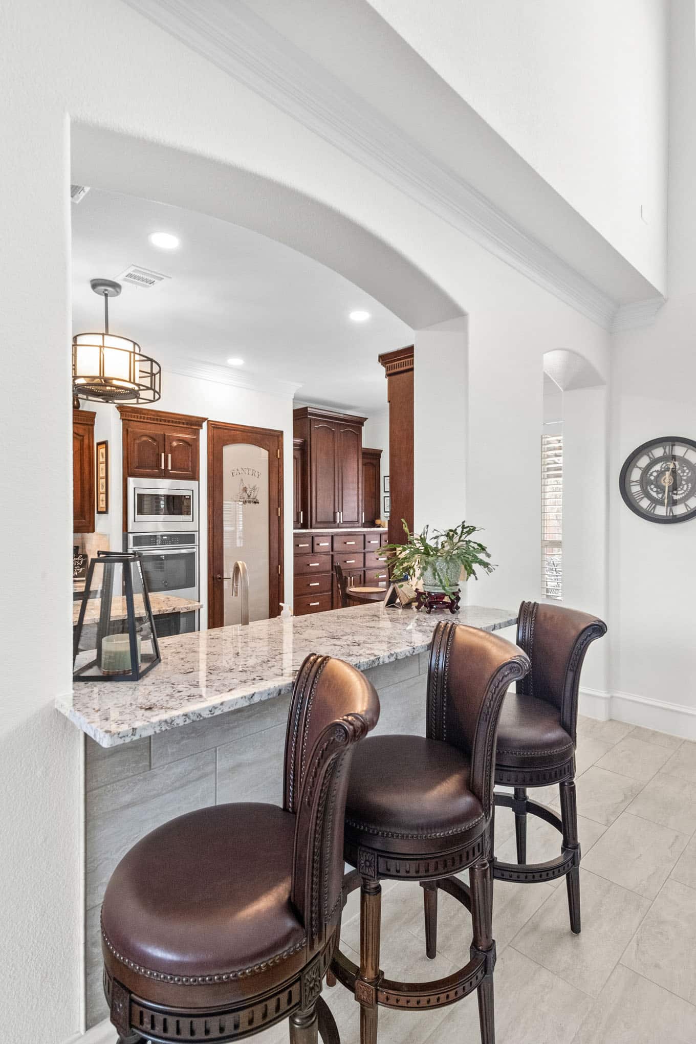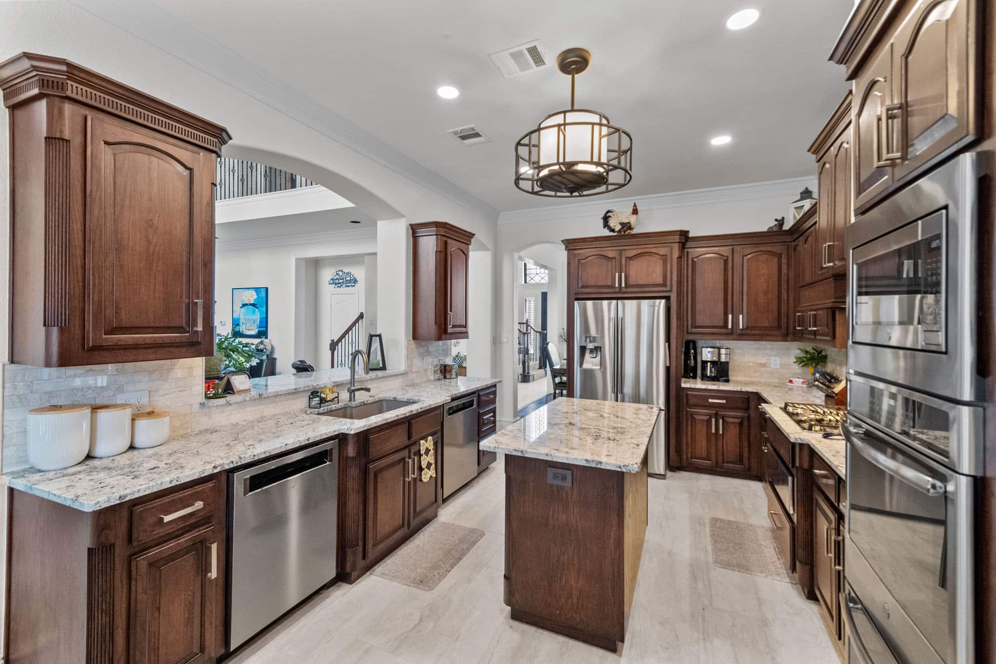 This elegant Frisco transformation showcases Elite Remodeling’s commitment to traditional craftsmanship blended with modern functionality. The expansive kitchen renovation features rich walnut cabinetry complemented by luminous white granite countertops, creating a timeless aesthetic with contemporary appeal. Professional-grade stainless steel appliances and distinctive lighting fixtures with industrial-inspired elements enhance both performance and visual interest. The thoughtfully designed layout creates multiple work zones, including a central island and breakfast nook, perfect for both entertaining and everyday living.