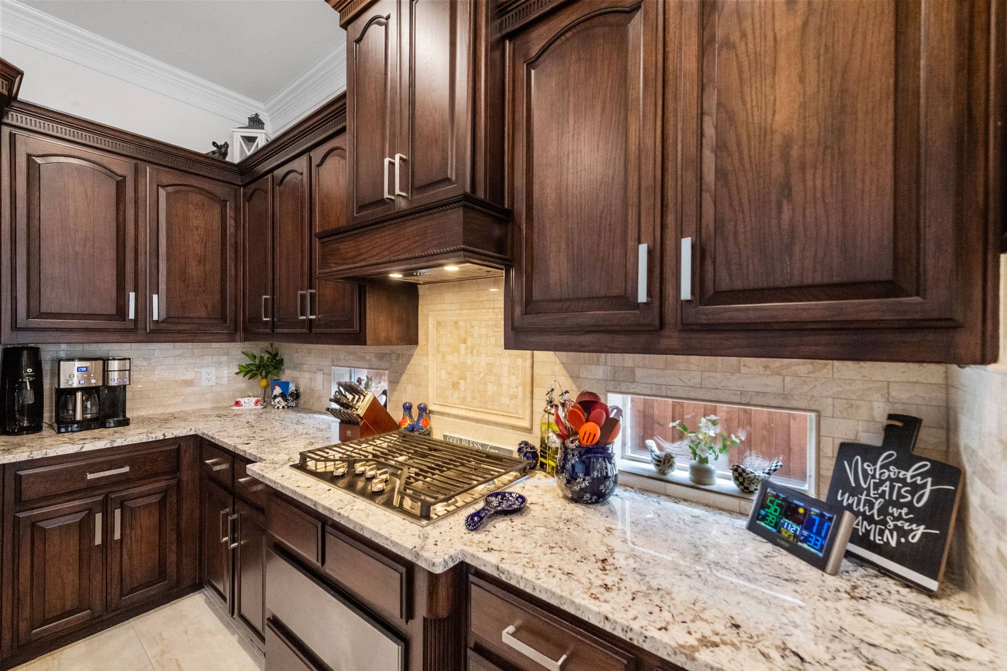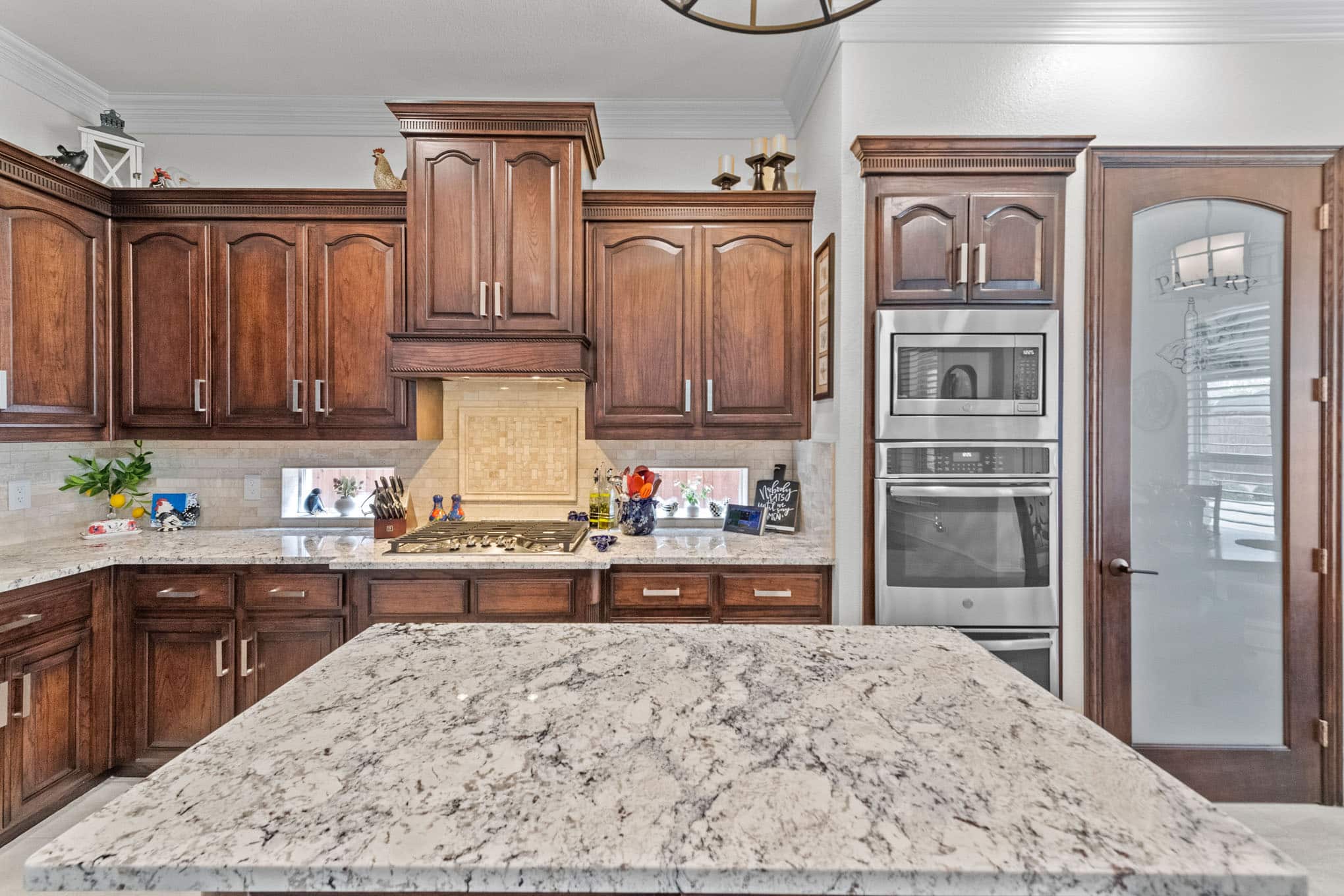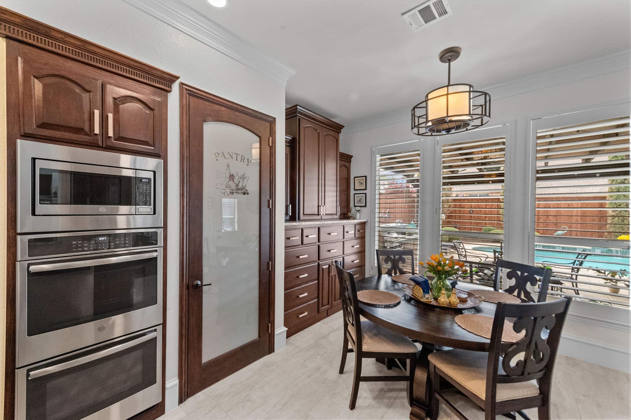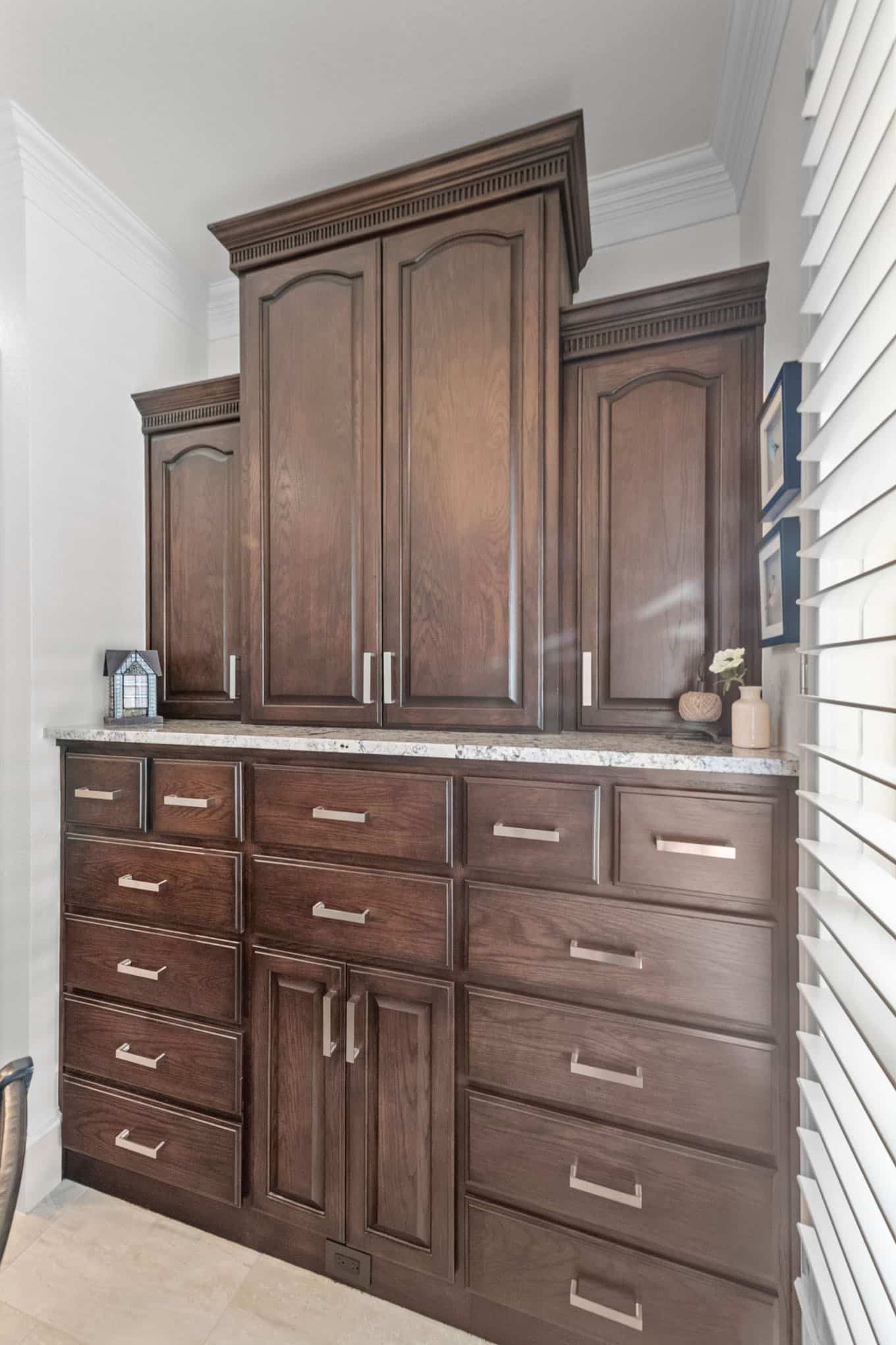 This elegant Frisco transformation showcases Elite Remodeling’s commitment to traditional craftsmanship blended with modern functionality. The expansive kitchen renovation features rich walnut cabinetry complemented by luminous white granite countertops, creating a timeless aesthetic with contemporary appeal. Professional-grade stainless steel appliances and distinctive lighting fixtures with industrial-inspired elements enhance both performance and visual interest. The thoughtfully designed layout creates multiple work zones, including a central island and breakfast nook, perfect for both entertaining and everyday living.