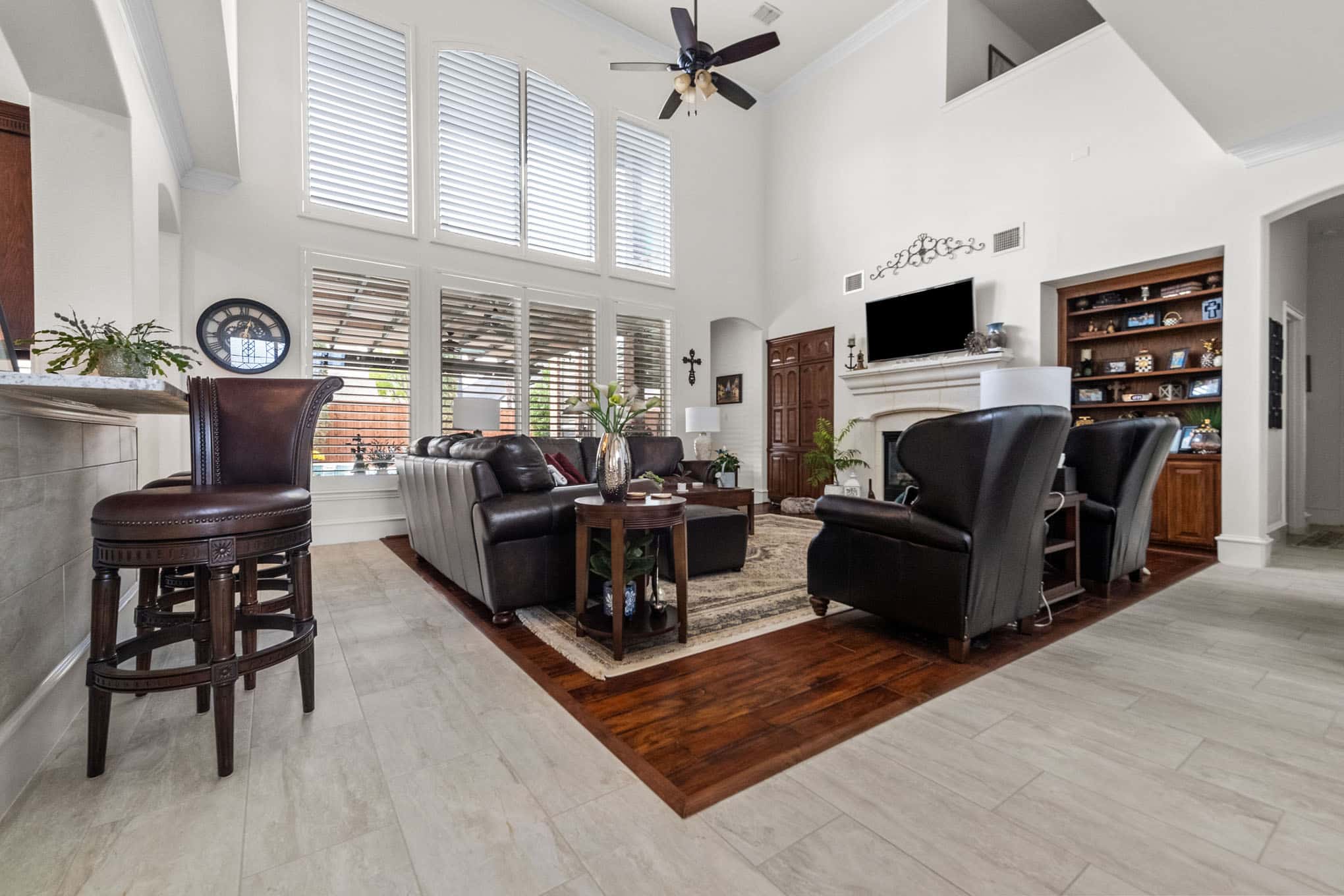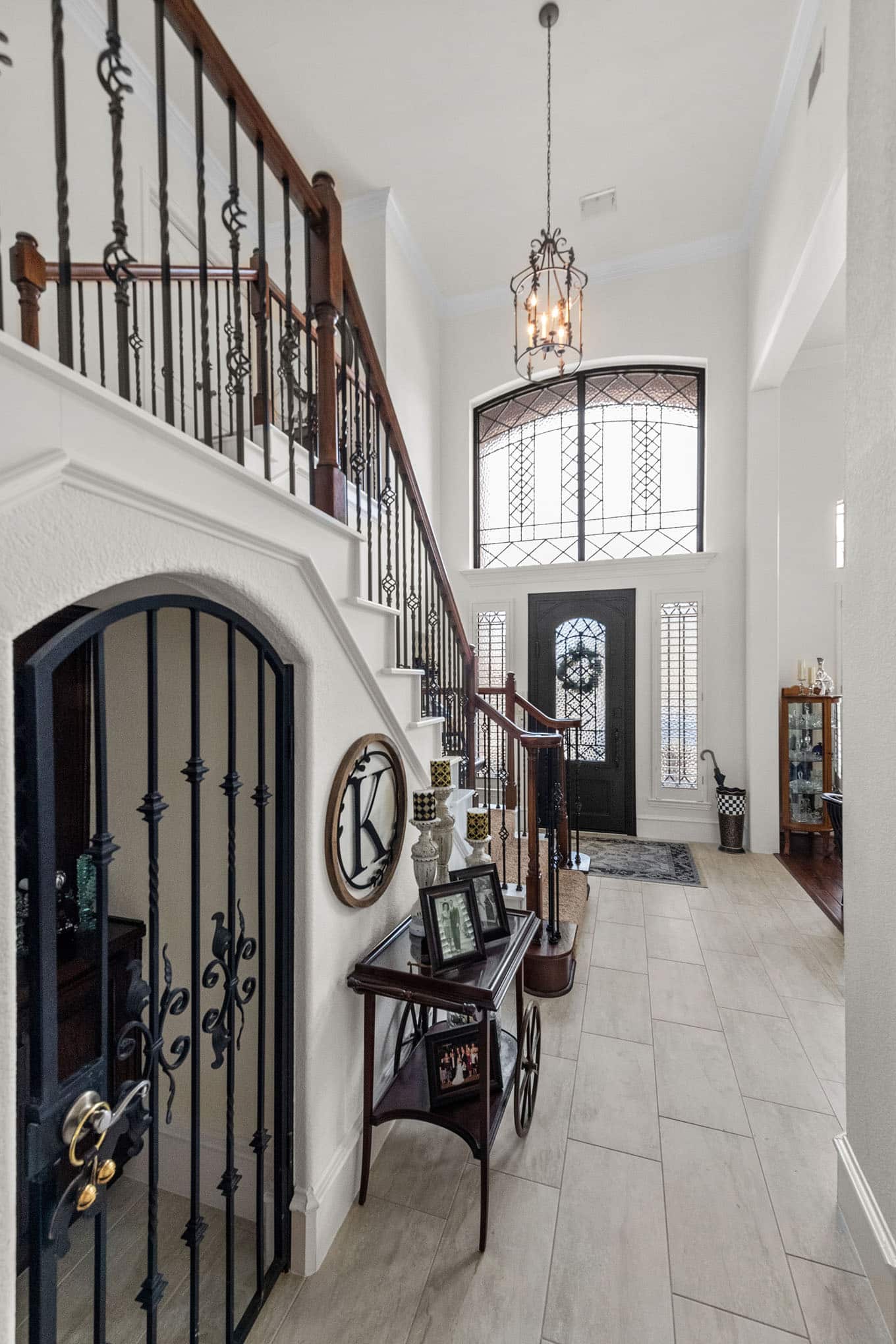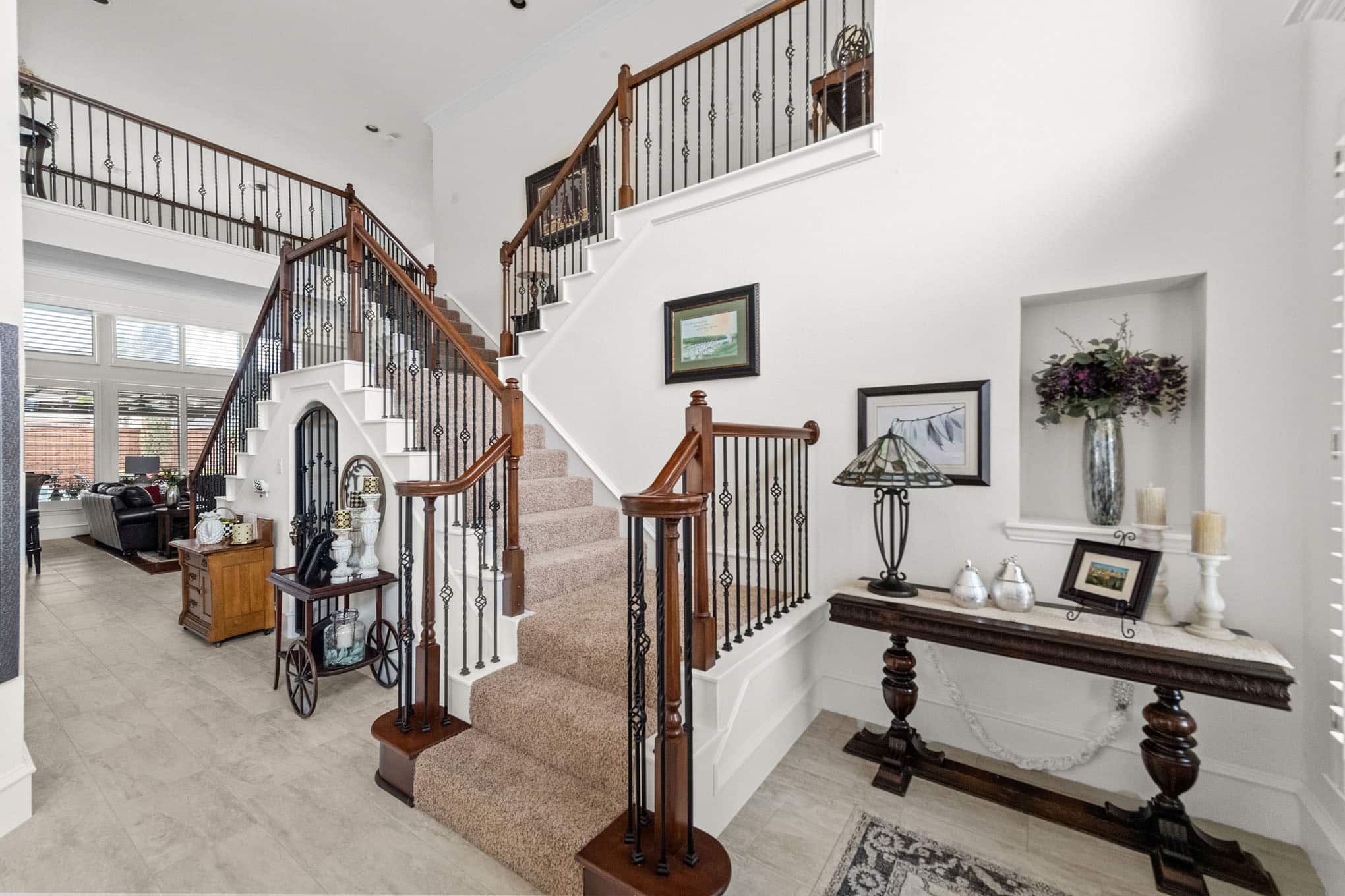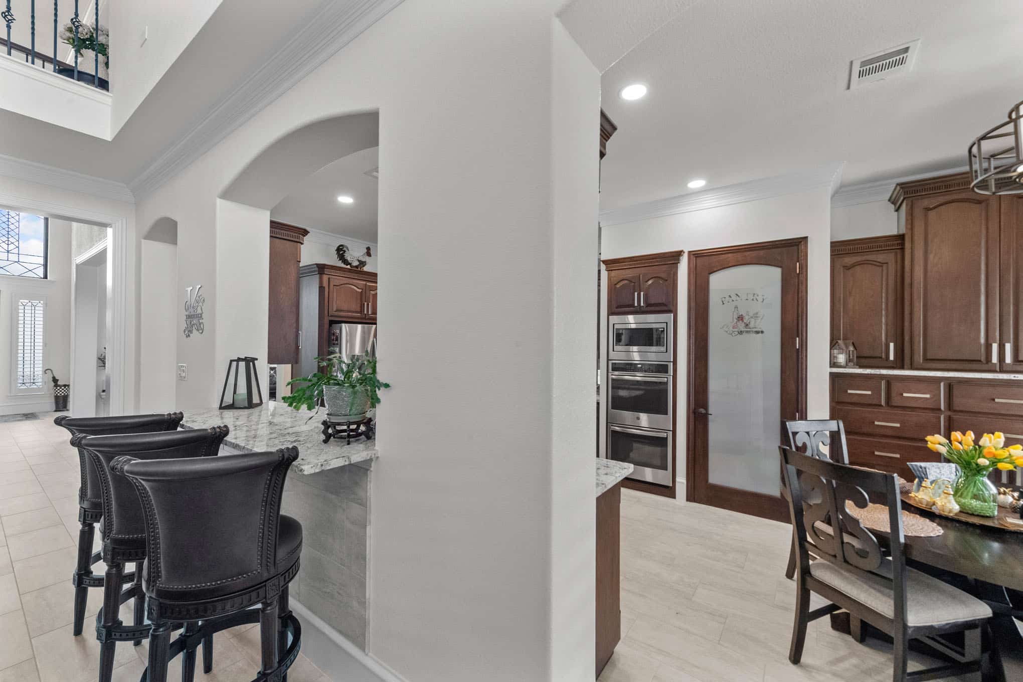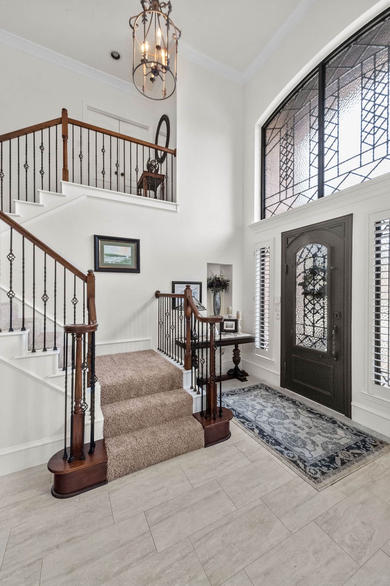 The project seamlessly extends throughout the home’s entryway and living spaces, where soaring ceilings and architectural details are accentuated by crisp white walls and rich wood accents. Custom millwork throughout maintains design continuity, while the strategic use of tile and hardwood flooring creates defined zones within the open concept. Completed in 2024, this comprehensive renovation demonstrates Elite Remodeling’s expertise in balancing sophisticated design with practical family-friendly spaces that will serve the homeowners beautifully for years to come.