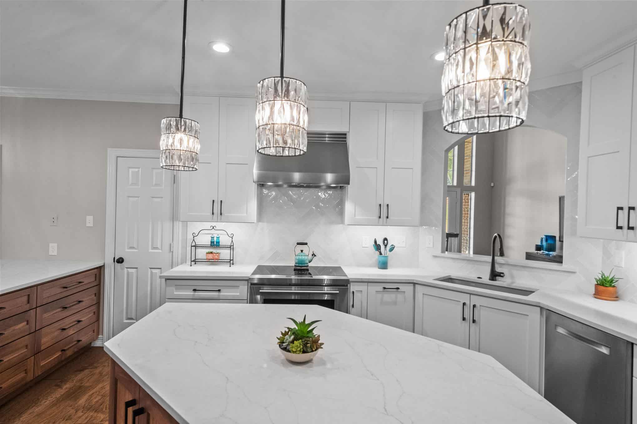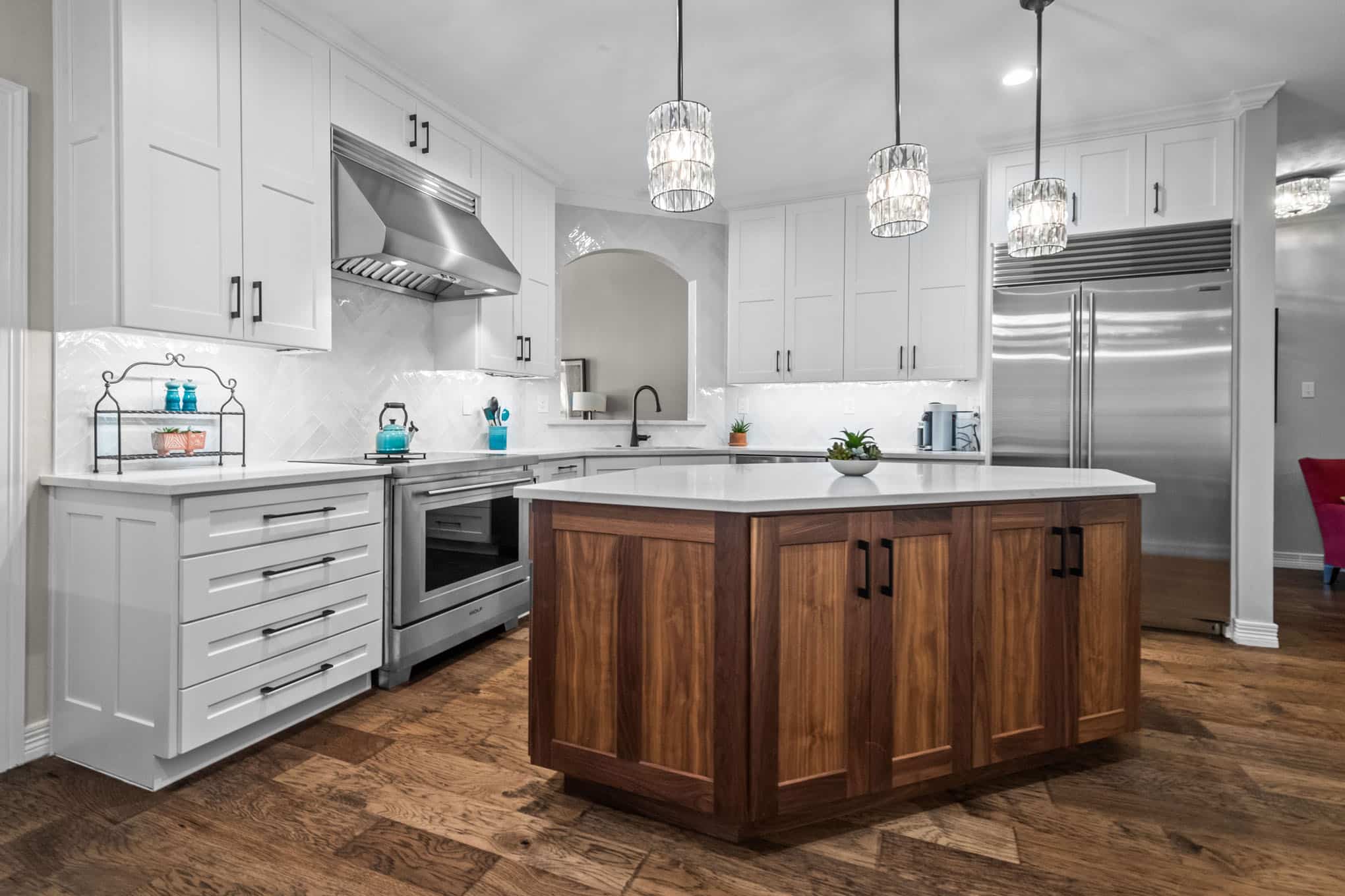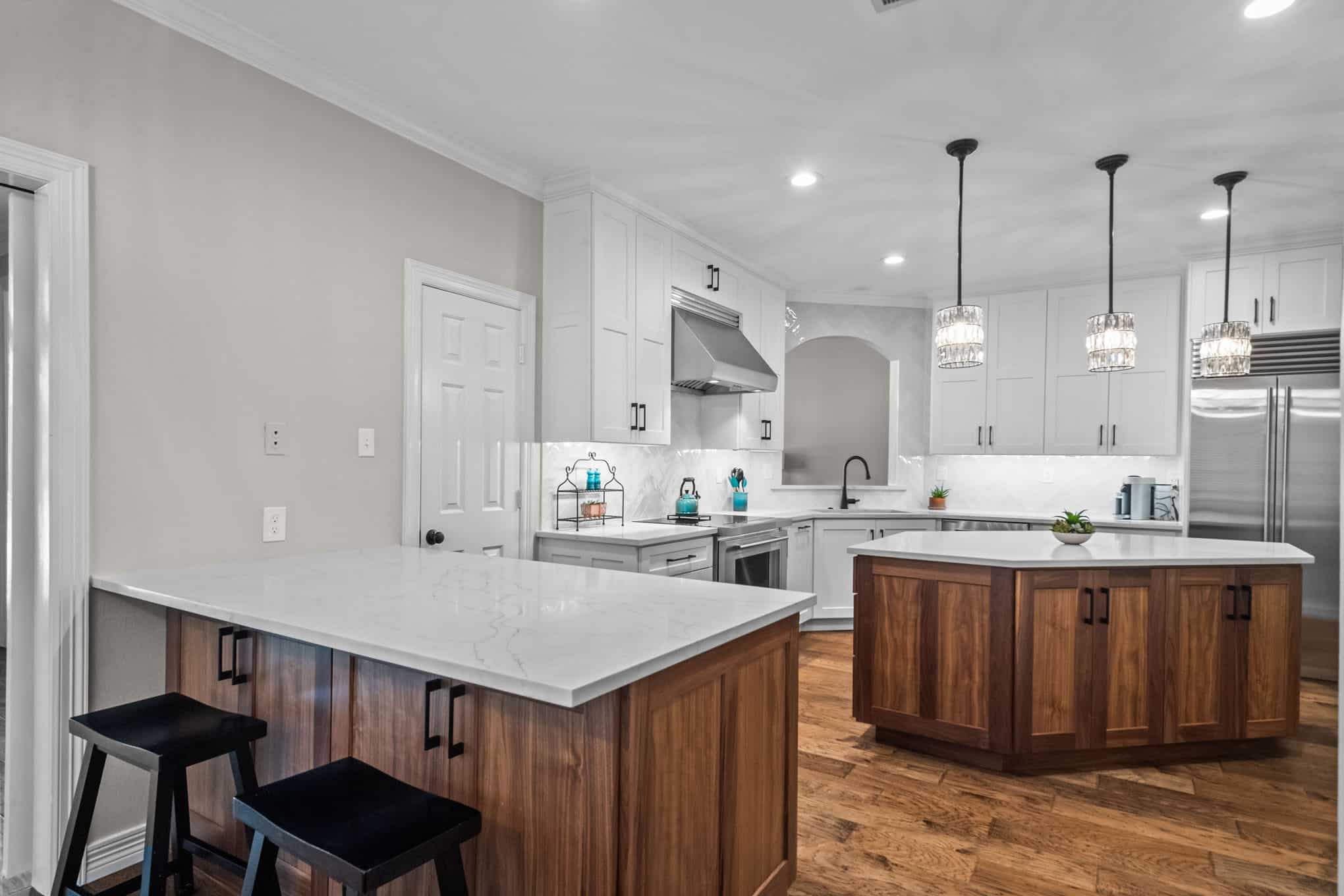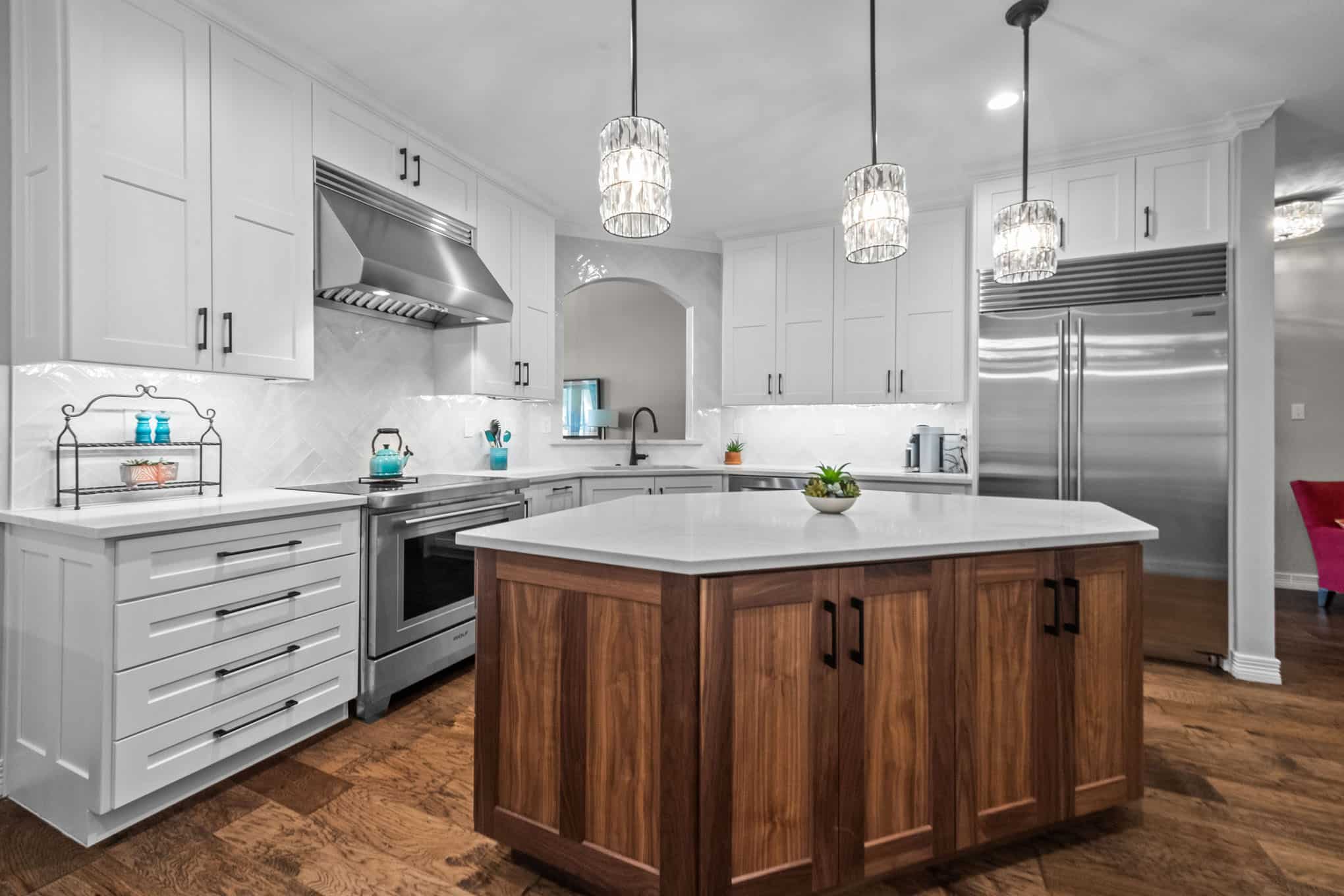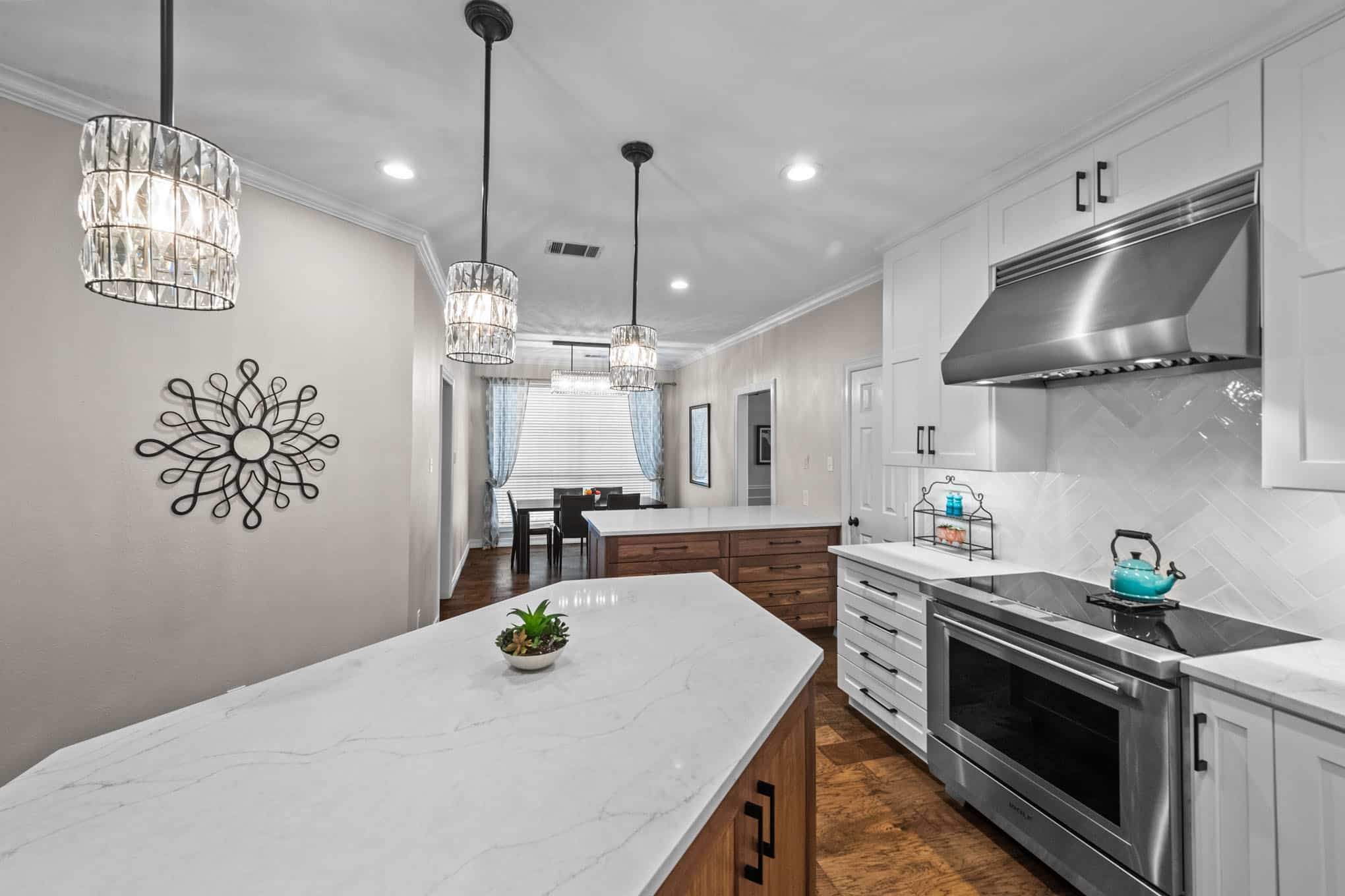 This stunning Plano transformation showcases Elite Remodeling’s commitment to sophisticated design and expert craftsmanship. The kitchen renovation features a harmonious blend of crisp white cabinetry with warm walnut accents, creating a timeless yet contemporary aesthetic. Premium finishes include quartz countertops, professional-grade stainless appliances, and elegant crystal pendant lighting that elevates the entire space. The herringbone backsplash adds visual interest while maintaining the kitchen’s refined character.