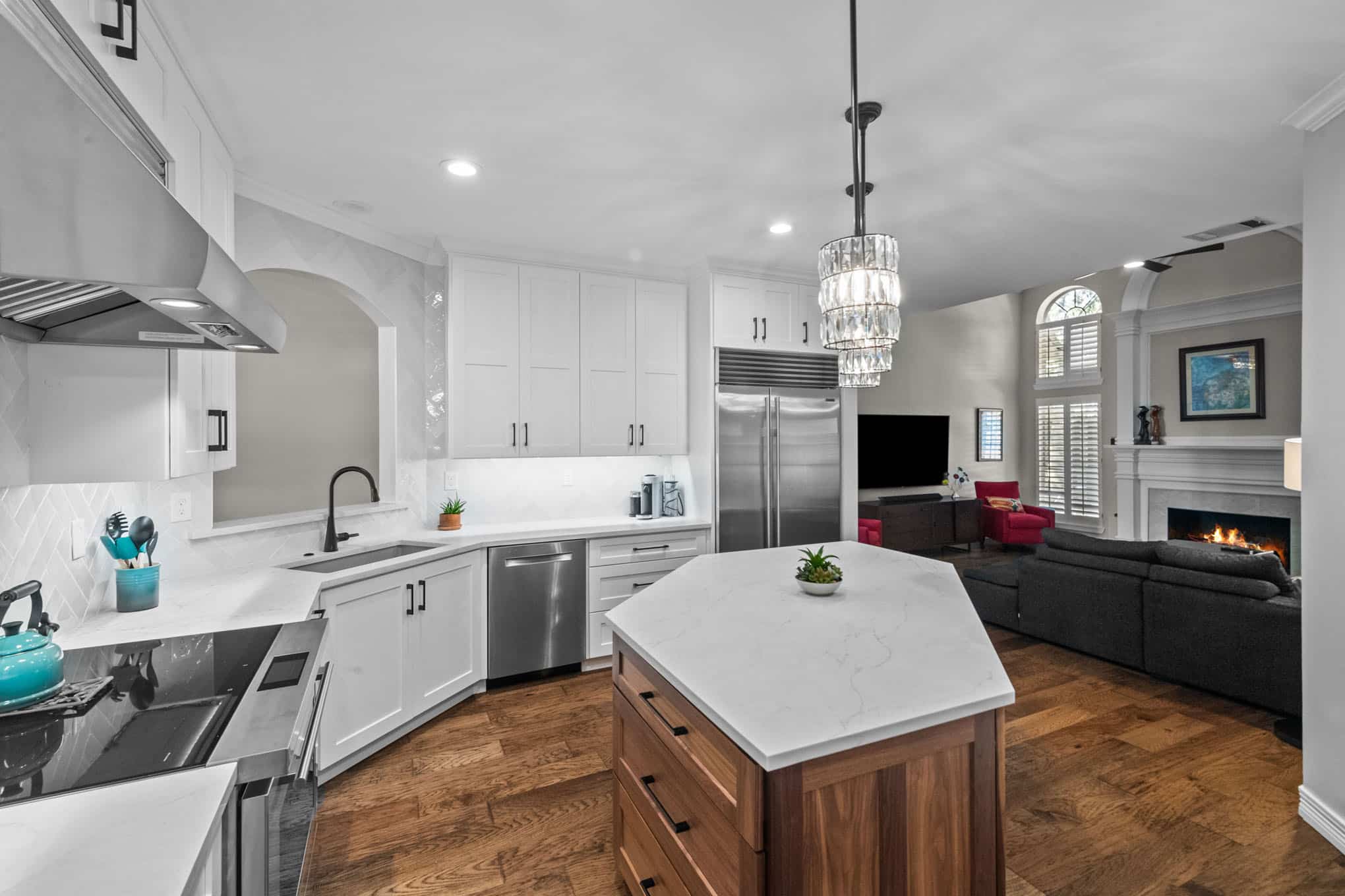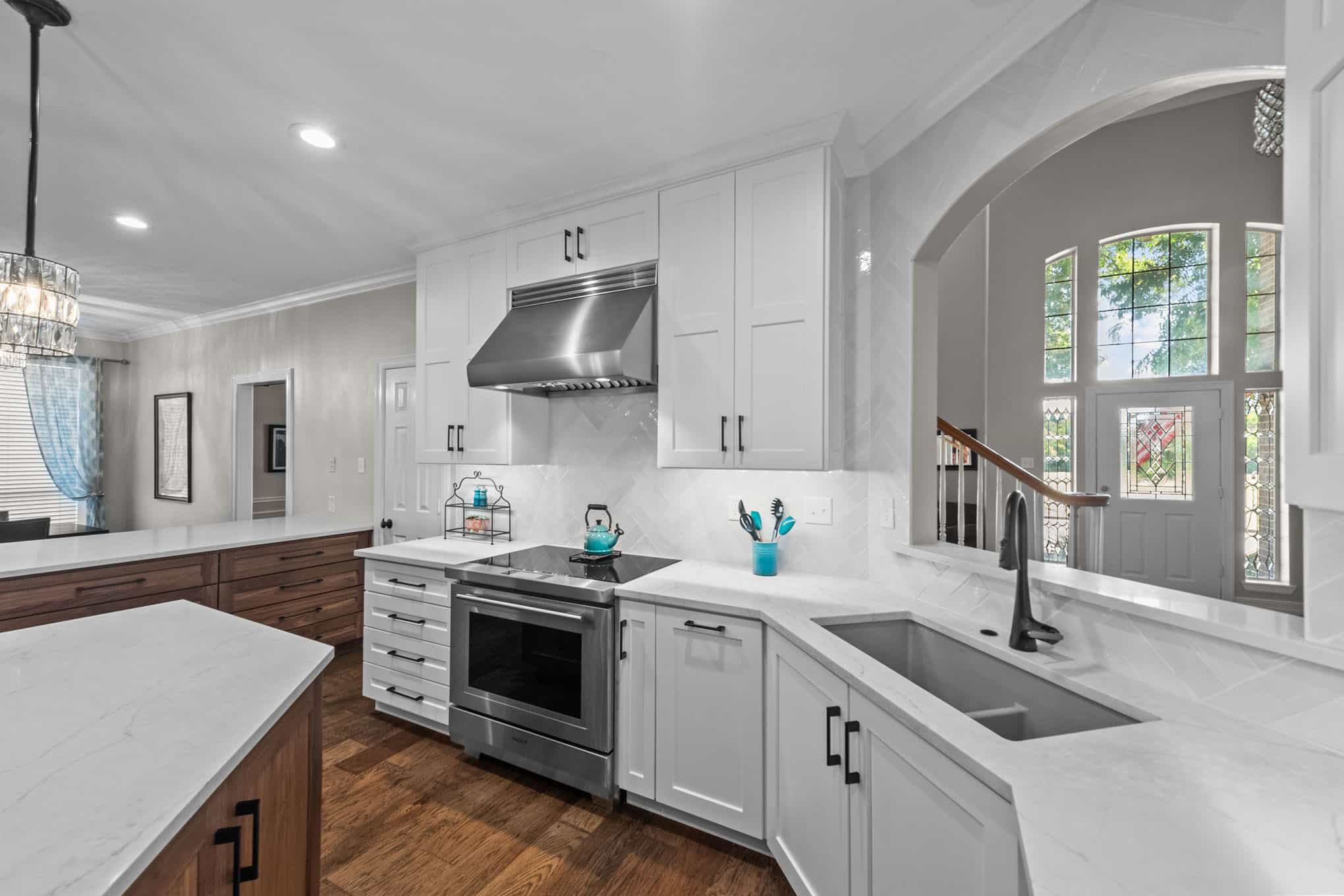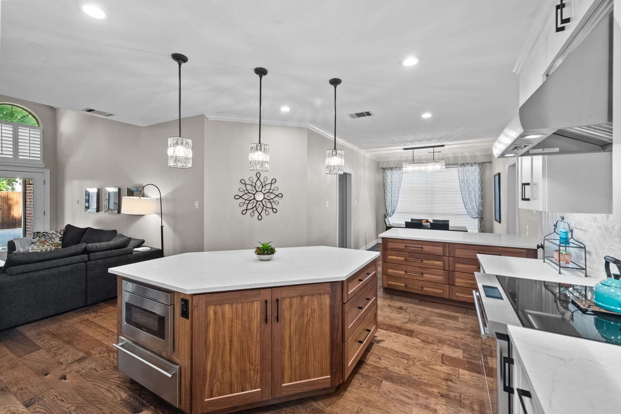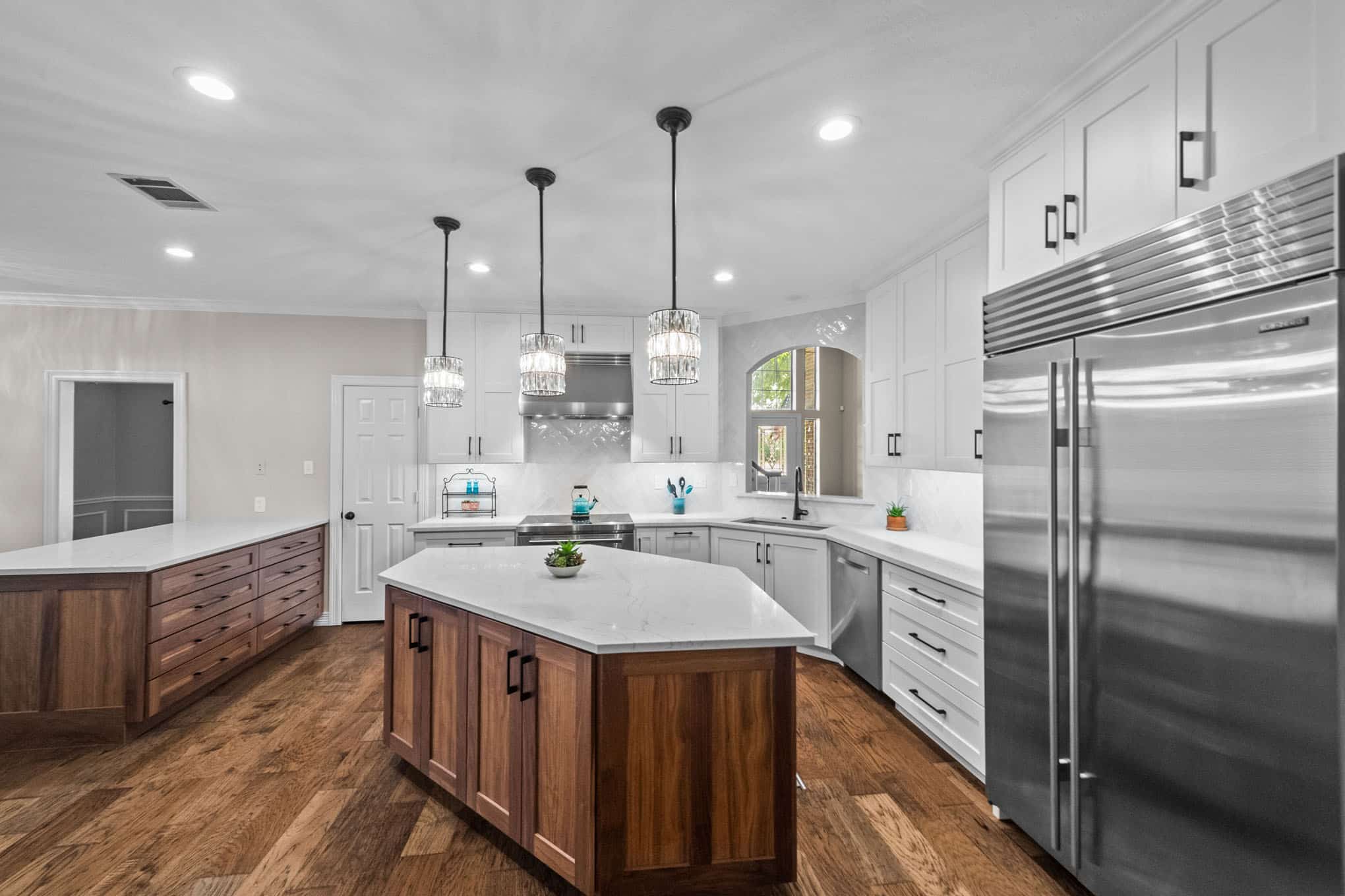 This stunning Plano transformation showcases Elite Remodeling’s commitment to sophisticated design and expert craftsmanship. The kitchen renovation features a harmonious blend of crisp white cabinetry with warm walnut accents, creating a timeless yet contemporary aesthetic. Premium finishes include quartz countertops, professional-grade stainless appliances, and elegant crystal pendant lighting that elevates the entire space. The herringbone backsplash adds visual interest while maintaining the kitchen’s refined character.
