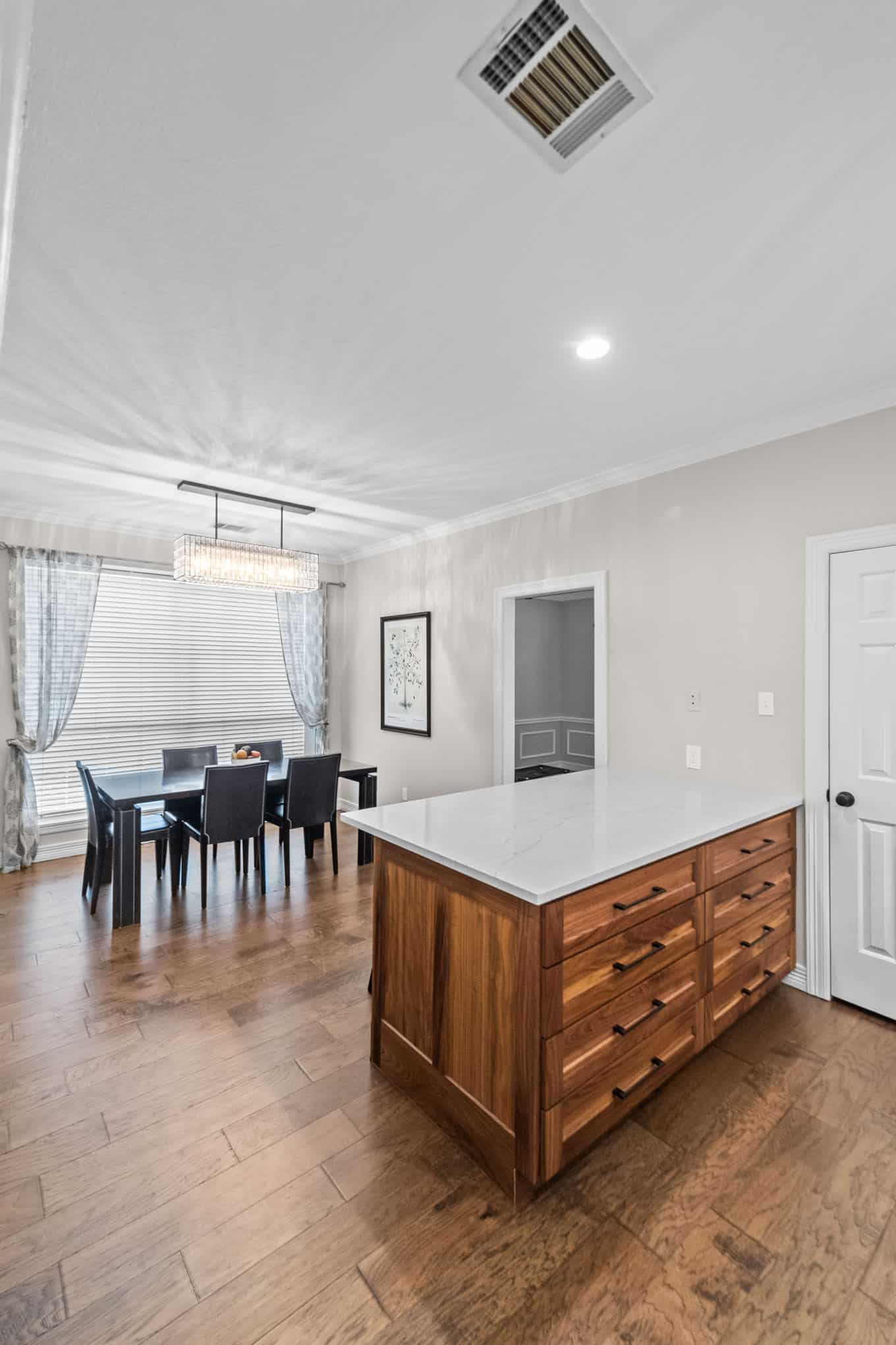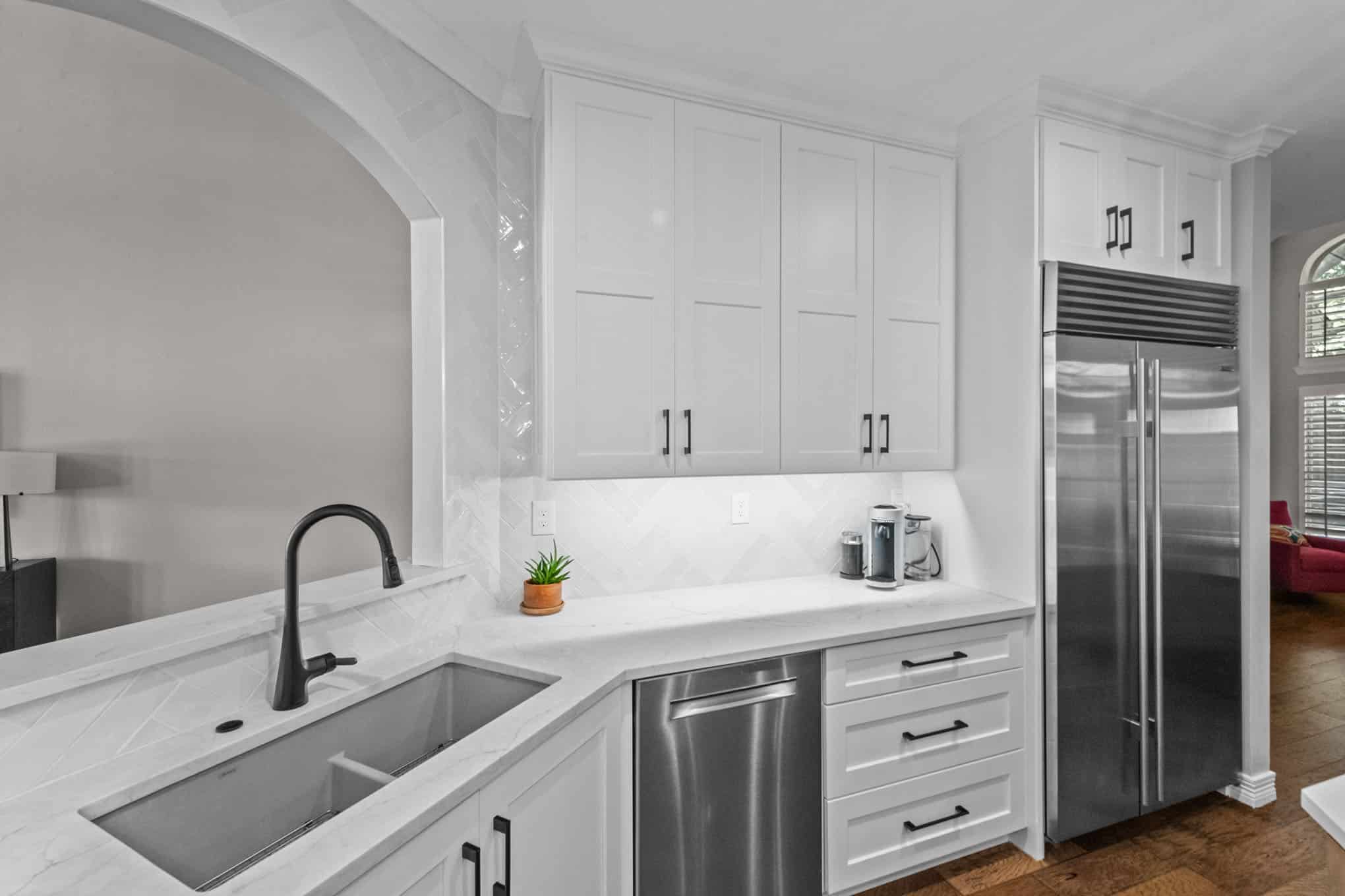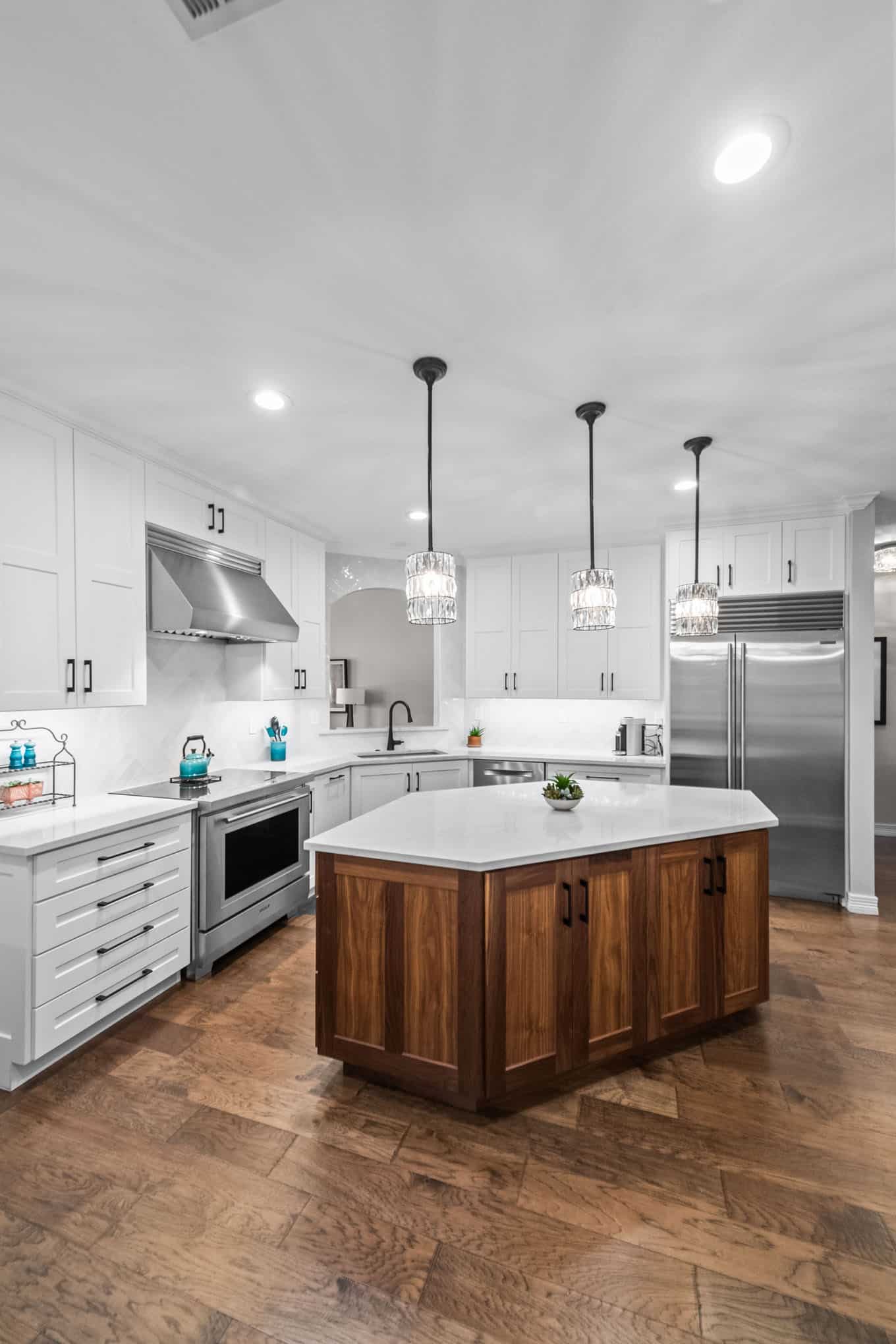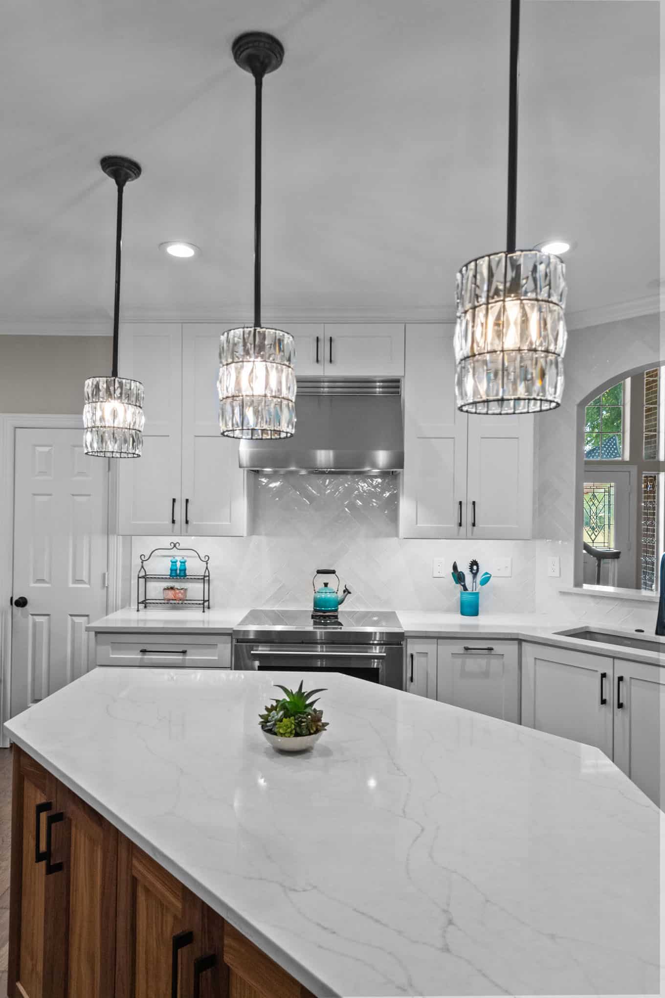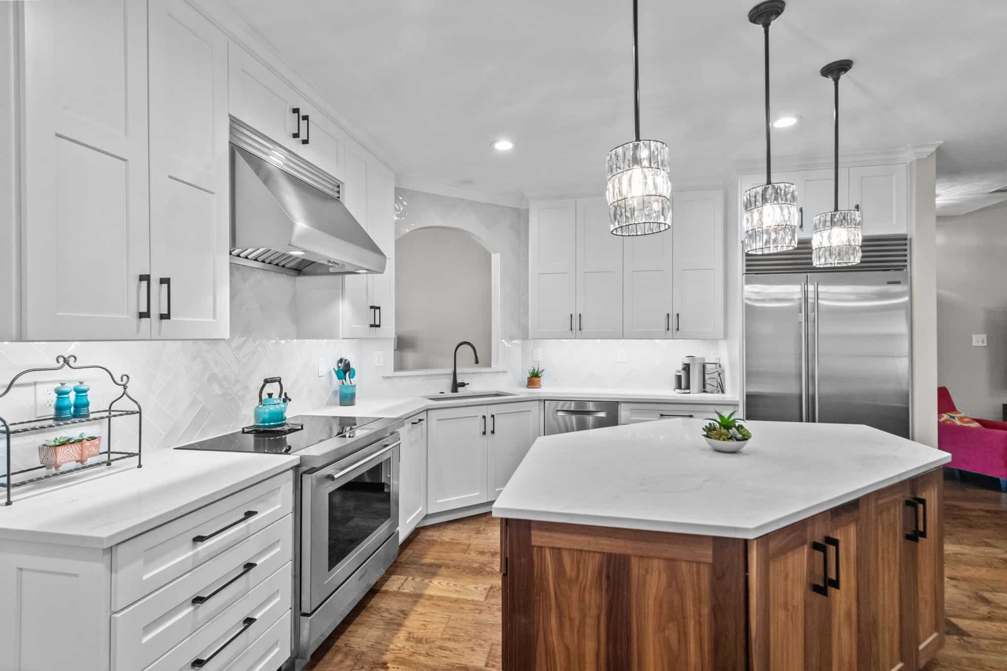 This stunning Plano transformation showcases Elite Remodeling’s commitment to sophisticated design and expert craftsmanship. The kitchen renovation features a harmonious blend of crisp white cabinetry with warm walnut accents, creating a timeless yet contemporary aesthetic. Premium finishes include quartz countertops, professional-grade stainless appliances, and elegant crystal pendant lighting that elevates the entire space. The herringbone backsplash adds visual interest while maintaining the kitchen’s refined character.