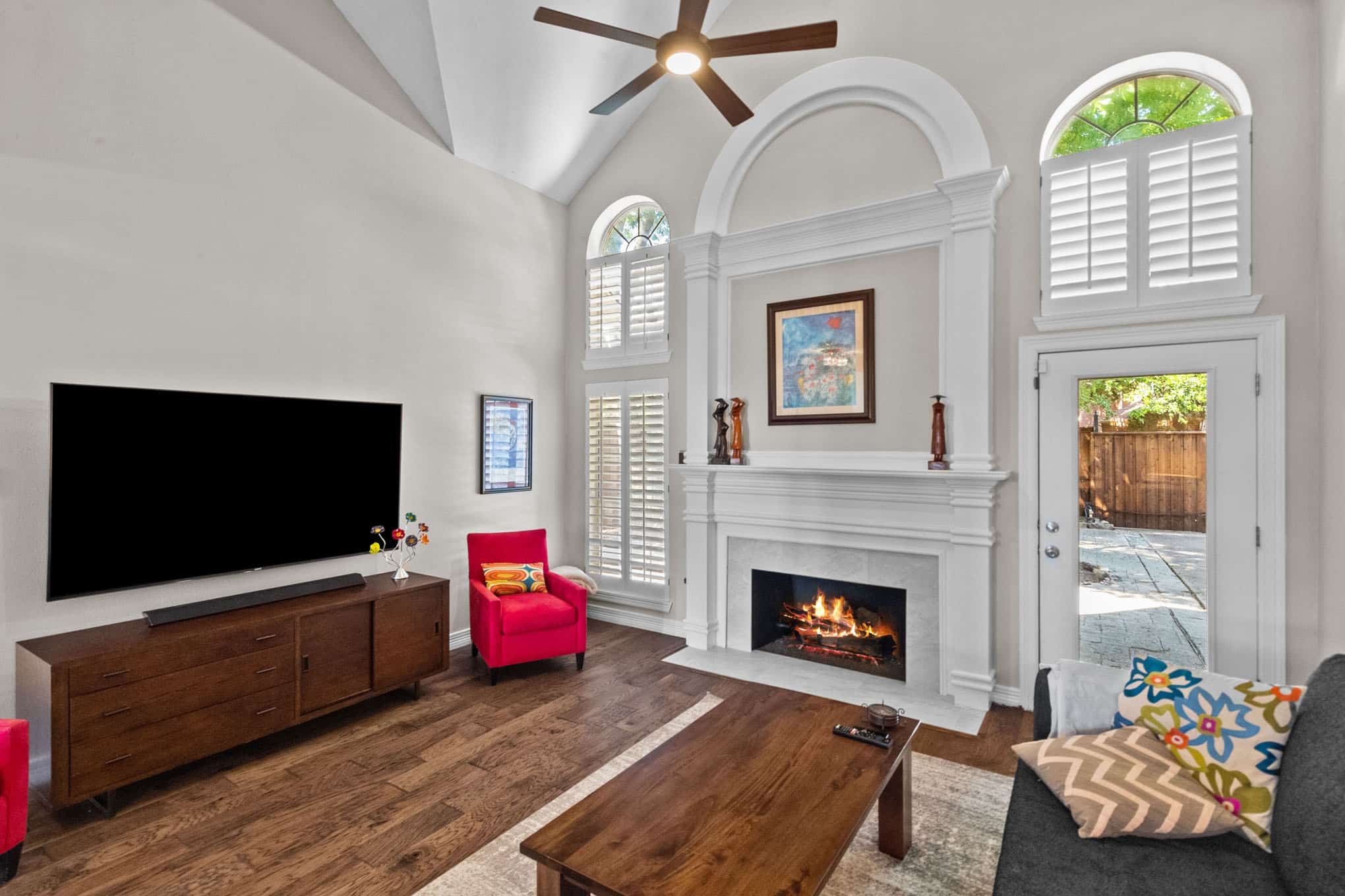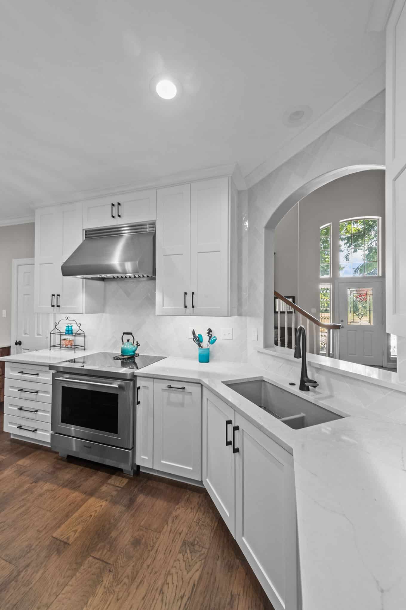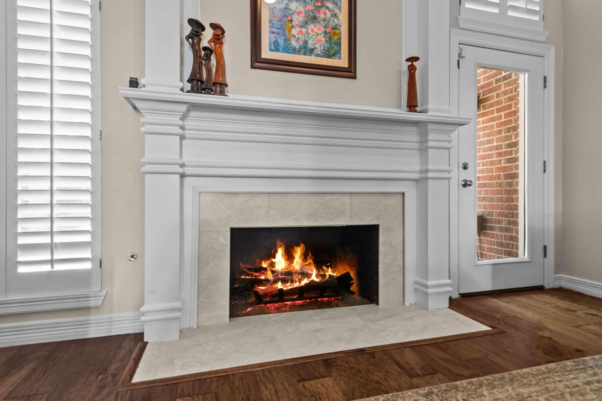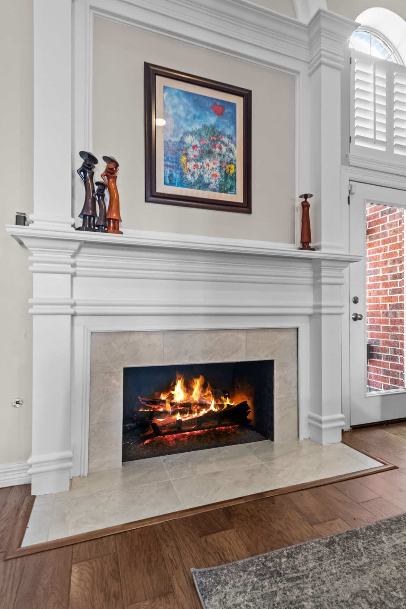 Complementing the kitchen transformation, the fireplace renovation incorporates custom millwork with classical architectural elements, including a graceful arch detail and fluted columns. Rich hardwood flooring flows throughout the space, connecting these focal points and enhancing the home’s elegant atmosphere. This 2023 project perfectly balances functionality with upscale design elements that will serve the homeowners beautifully for years to come.