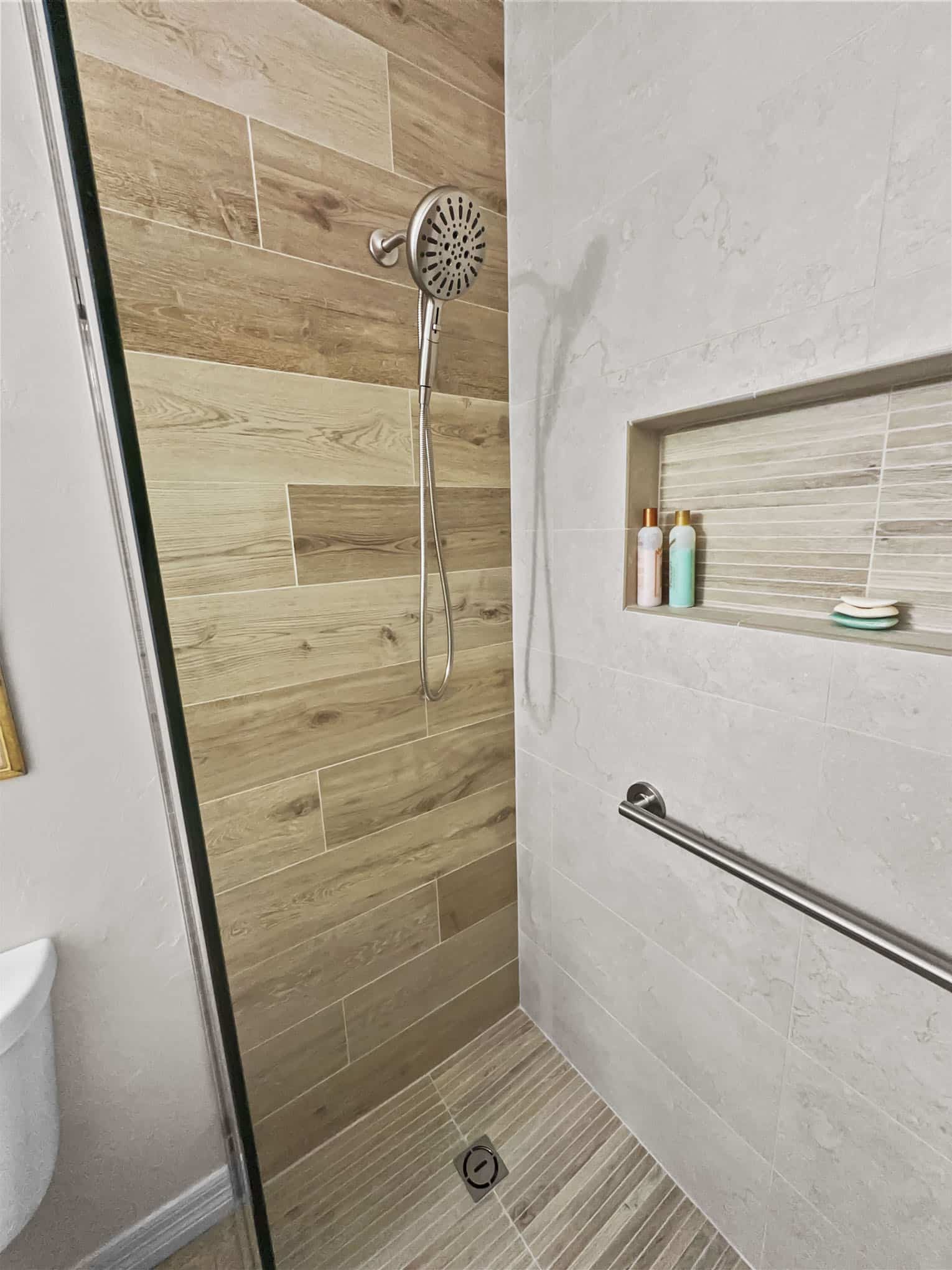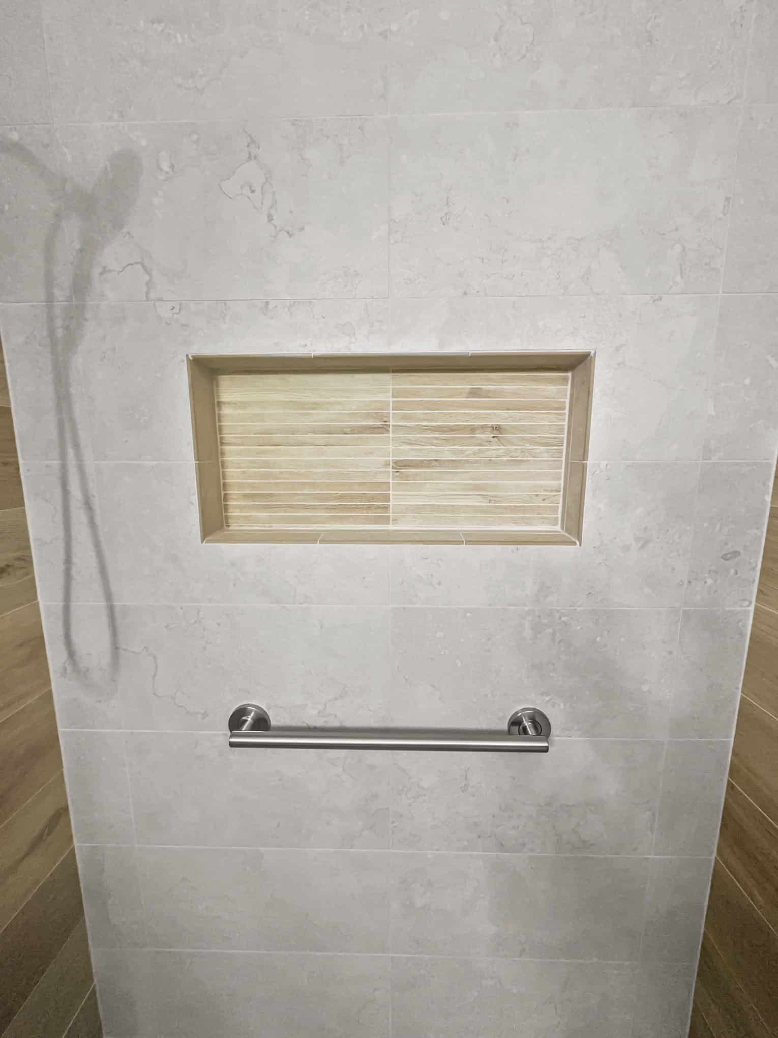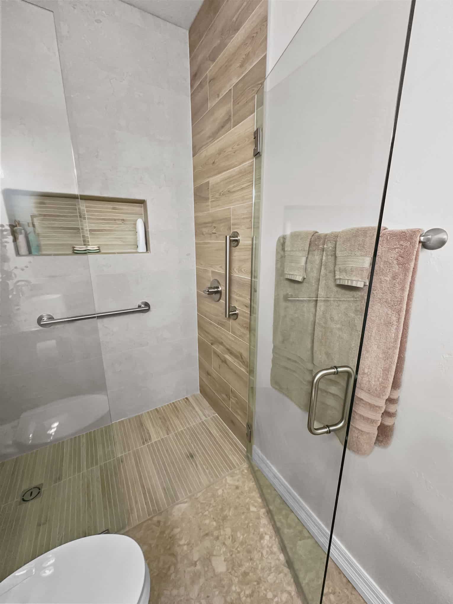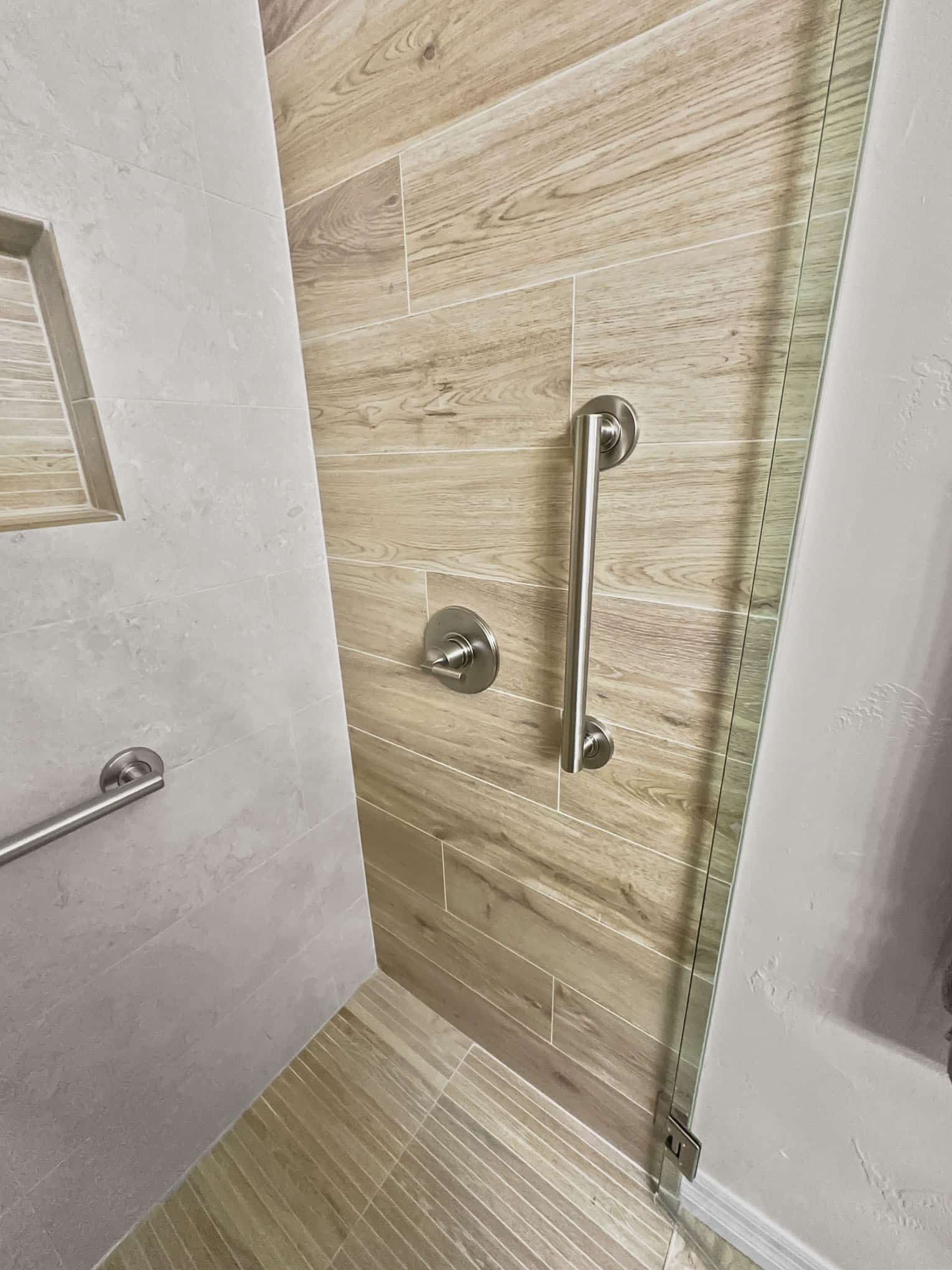 The adjacent bathroom reveals a masterful interplay of textures with porcelain stone-look tiles in creamy neutrals juxtaposed against wood-grained accent walls that introduce organic warmth. The frameless glass shower enclosure creates a sense of spaciousness while showcase premium fixtures that enhance both function and aesthetic appeal. Particularly noteworthy is the recessed shower niche featuring a complementary linear tile insert—a design detail that demonstrates exceptional attention to craftsmanship. Brushed nickel grab bars and fixtures add both safety features and refined detailing that will serve inhabitants at every life stage, a testament to the forward-thinking design principles that Elite Remodeling brings to each Frisco home renovation.