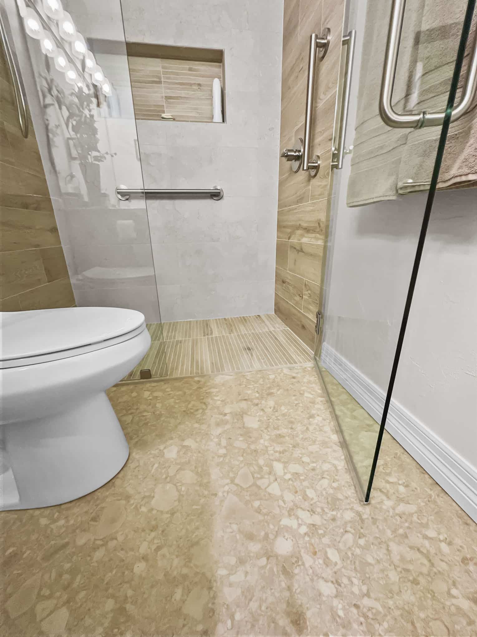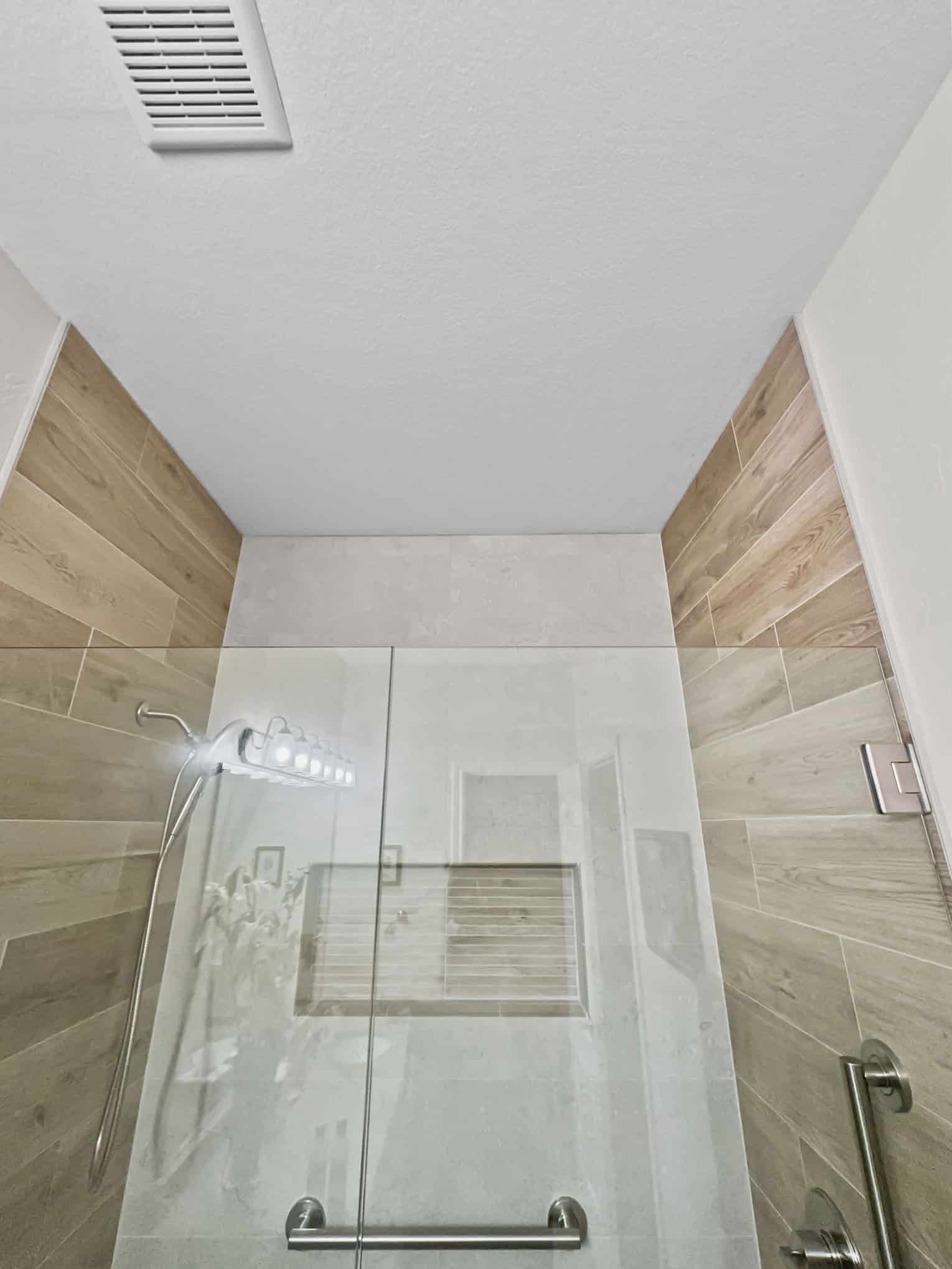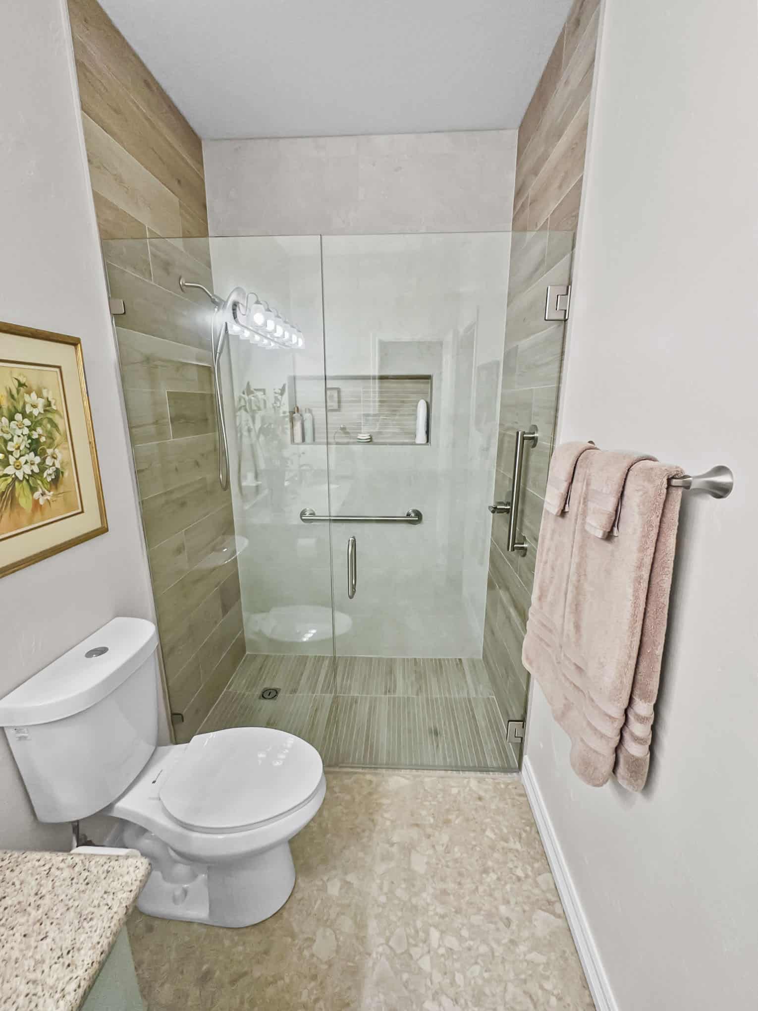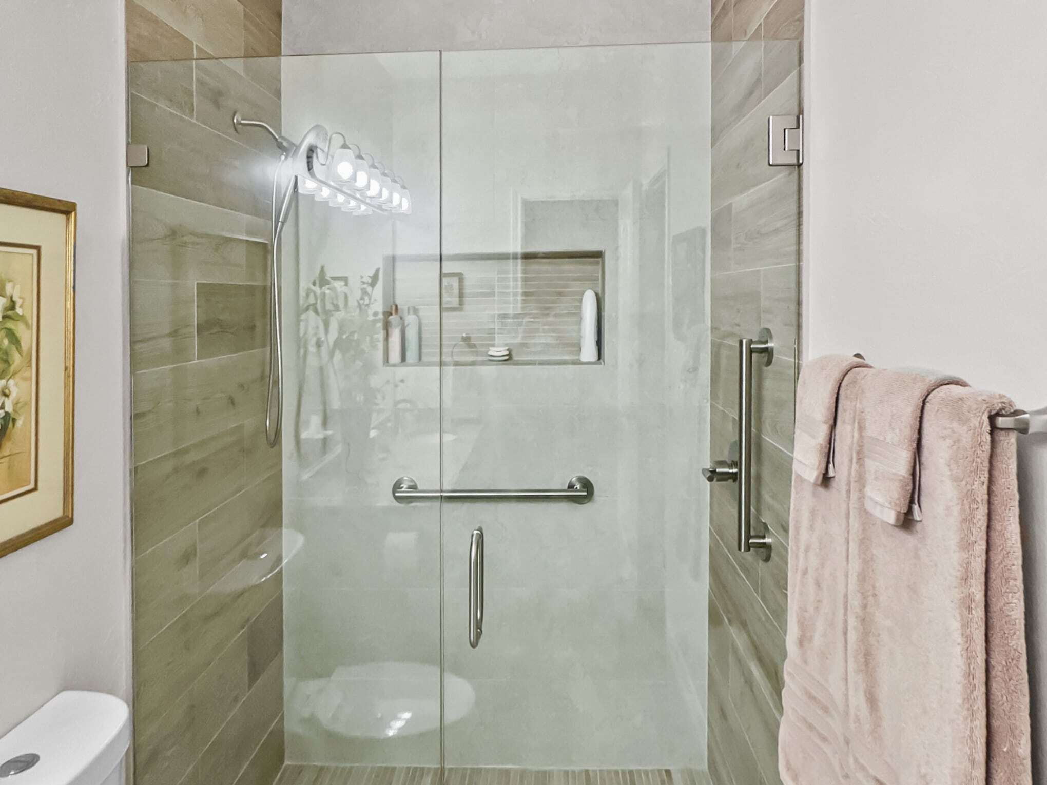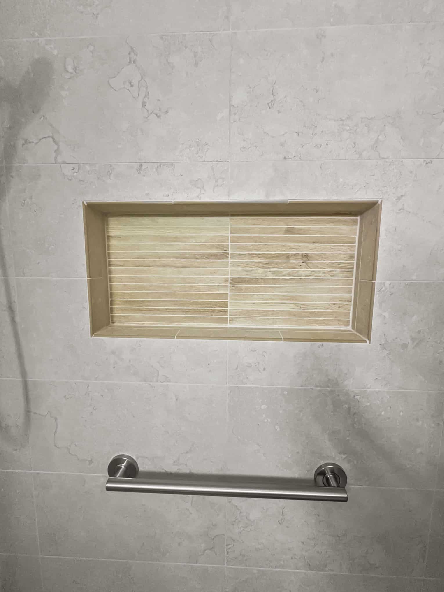 The adjacent bathroom reveals a masterful interplay of textures with porcelain stone-look tiles in creamy neutrals juxtaposed against wood-grained accent walls that introduce organic warmth. The frameless glass shower enclosure creates a sense of spaciousness while showcase premium fixtures that enhance both function and aesthetic appeal. Particularly noteworthy is the recessed shower niche featuring a complementary linear tile insert—a design detail that demonstrates exceptional attention to craftsmanship. Brushed nickel grab bars and fixtures add both safety features and refined detailing that will serve inhabitants at every life stage, a testament to the forward-thinking design principles that Elite Remodeling brings to each Frisco home renovation.