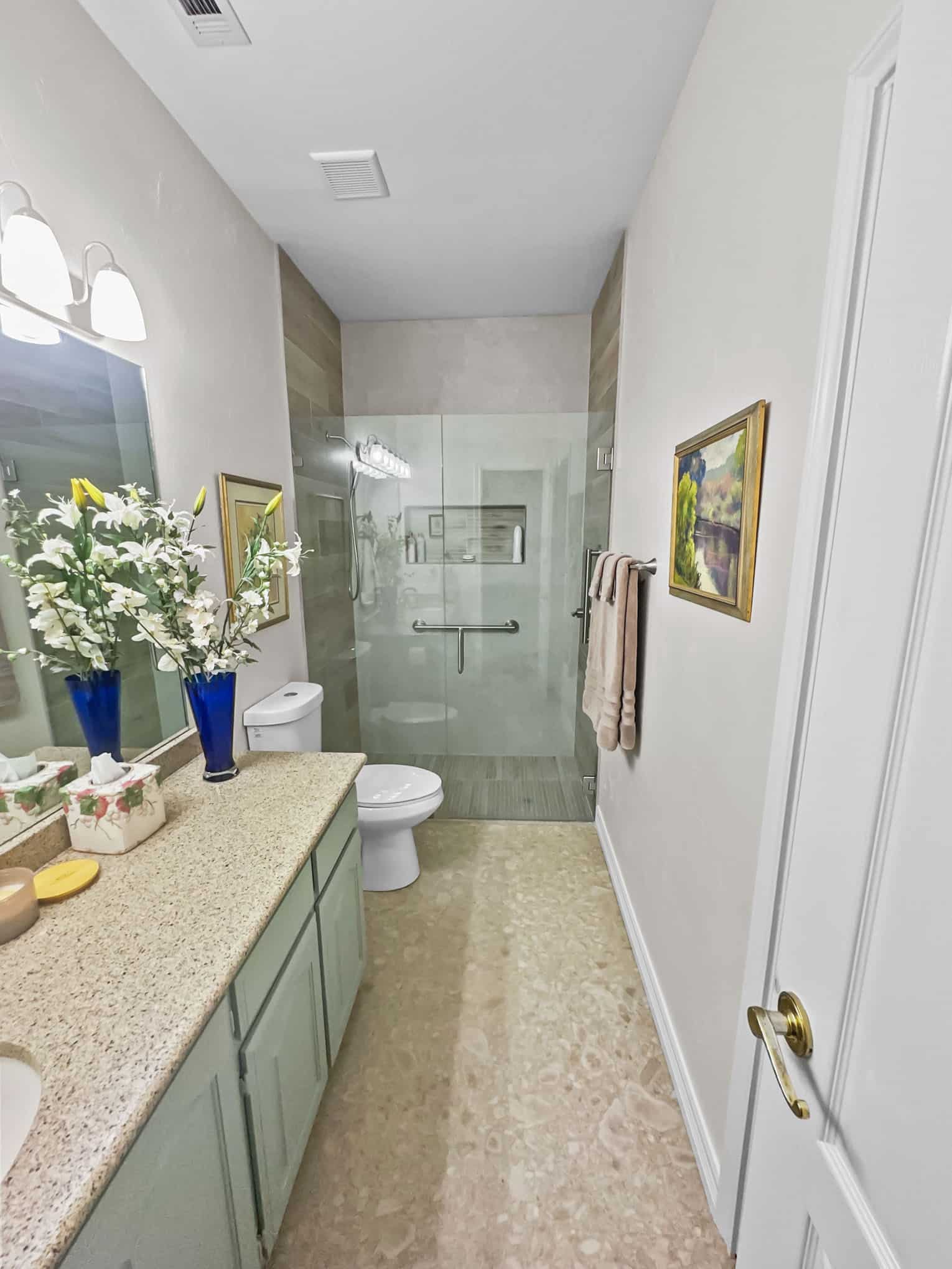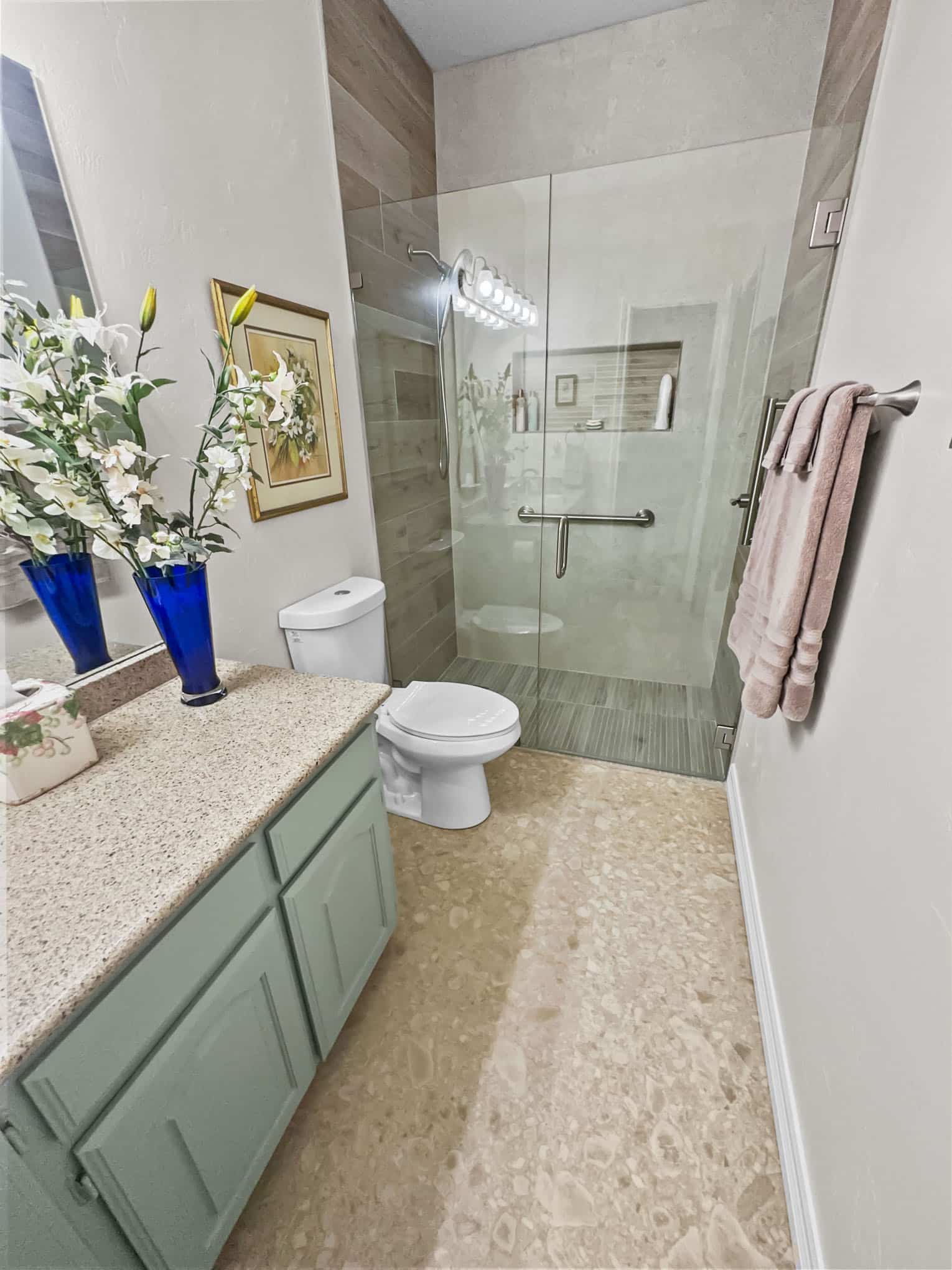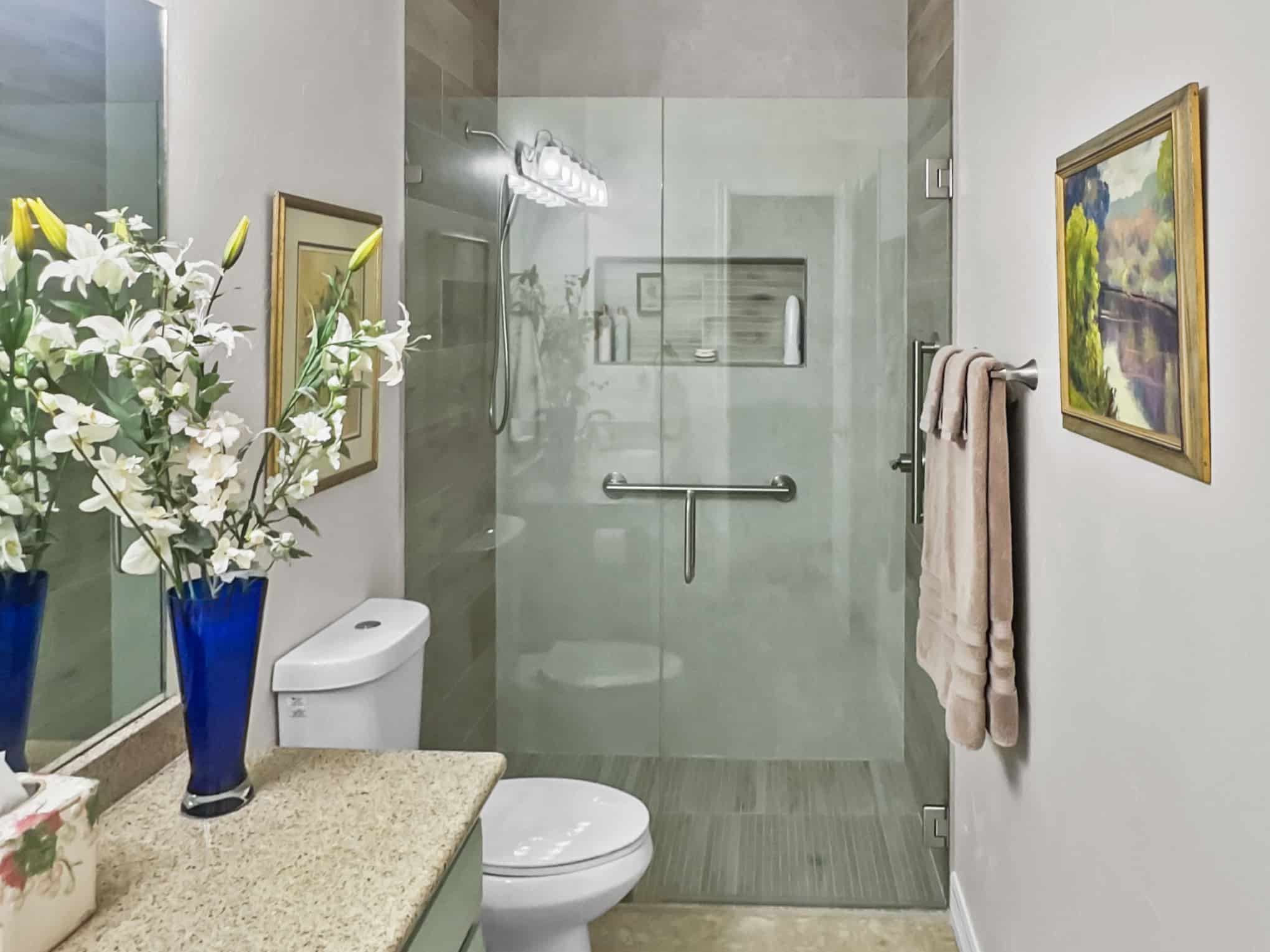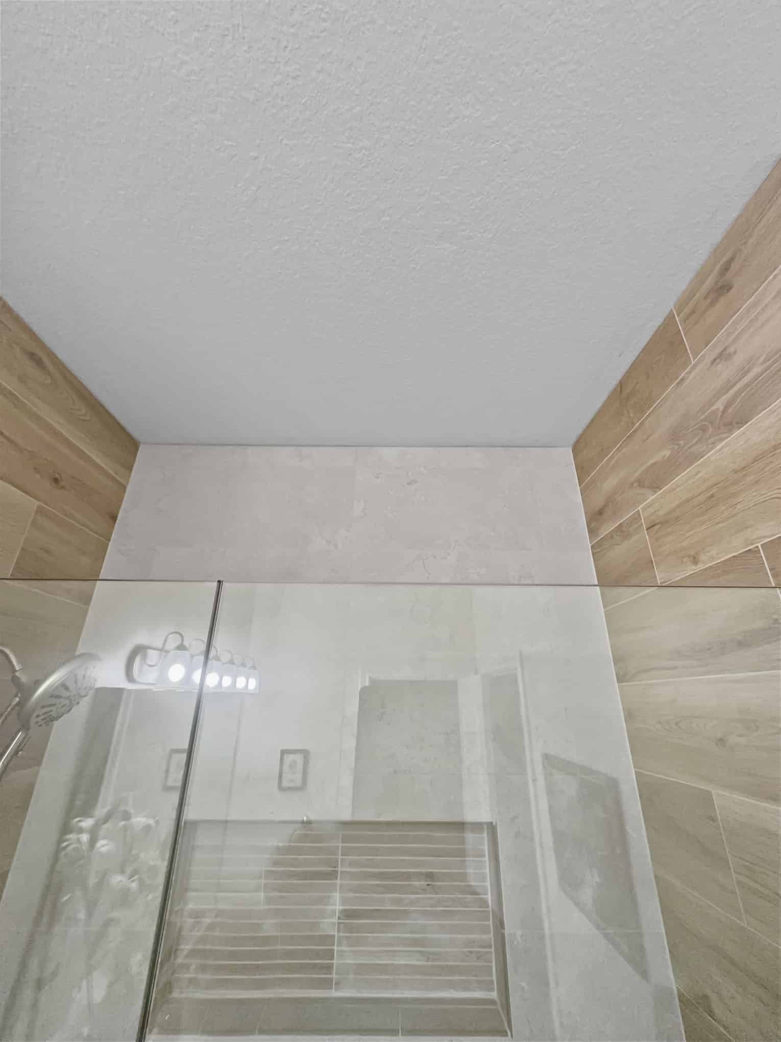 The adjacent bathroom reveals a masterful interplay of textures with porcelain stone-look tiles in creamy neutrals juxtaposed against wood-grained accent walls that introduce organic warmth. The frameless glass shower enclosure creates a sense of spaciousness while showcase premium fixtures that enhance both function and aesthetic appeal. Particularly noteworthy is the recessed shower niche featuring a complementary linear tile insert—a design detail that demonstrates exceptional attention to craftsmanship. Brushed nickel grab bars and fixtures add both safety features and refined detailing that will serve inhabitants at every life stage, a testament to the forward-thinking design principles that Elite Remodeling brings to each Frisco home renovation.