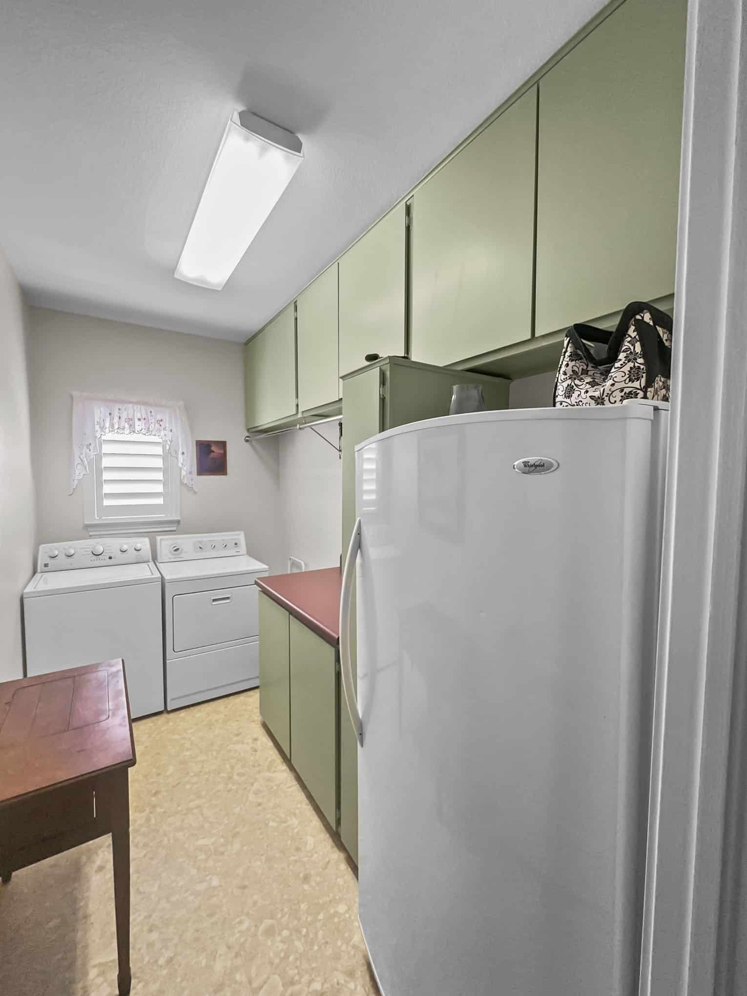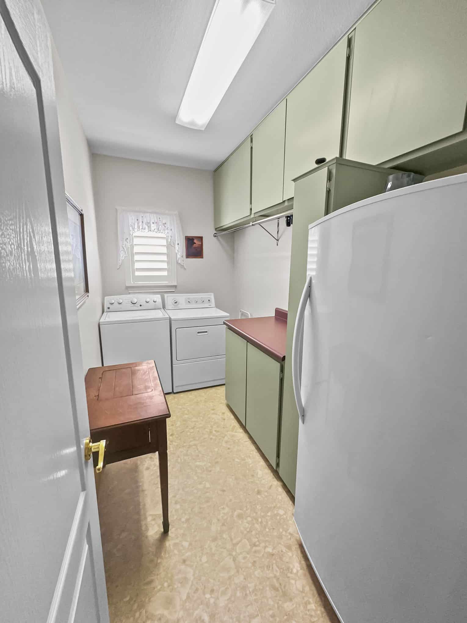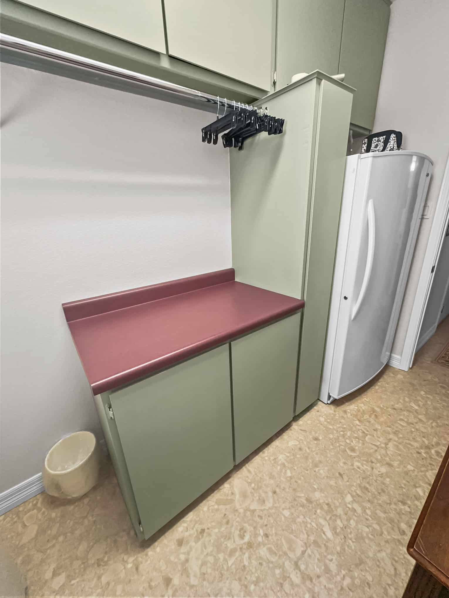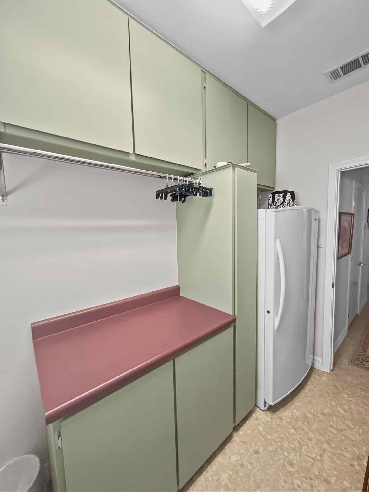 The laundry room features a harmonious sage green cabinetry system that creates visual balance while addressing multiple storage needs. The unexpected but delightful detail of coral-toned laminate countertops provides a warm contrast to the cool cabinet tones—a design choice that elevates what might otherwise be considered a purely utilitarian space. Elite Remodeling’s custom cabinet solutions maximize the compact footprint by incorporating strategic hanging space, closed storage, and countertop work areas within a unified millwork system. The thoughtful incorporation of a secondary refrigerator demonstrates their understanding of the Frisco lifestyle, where entertaining and family gatherings often require additional cold storage.
